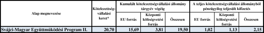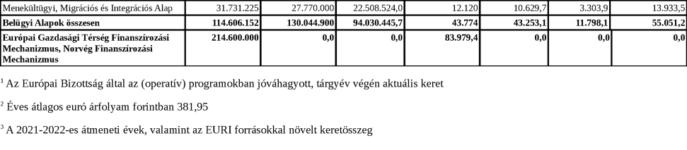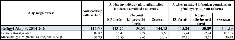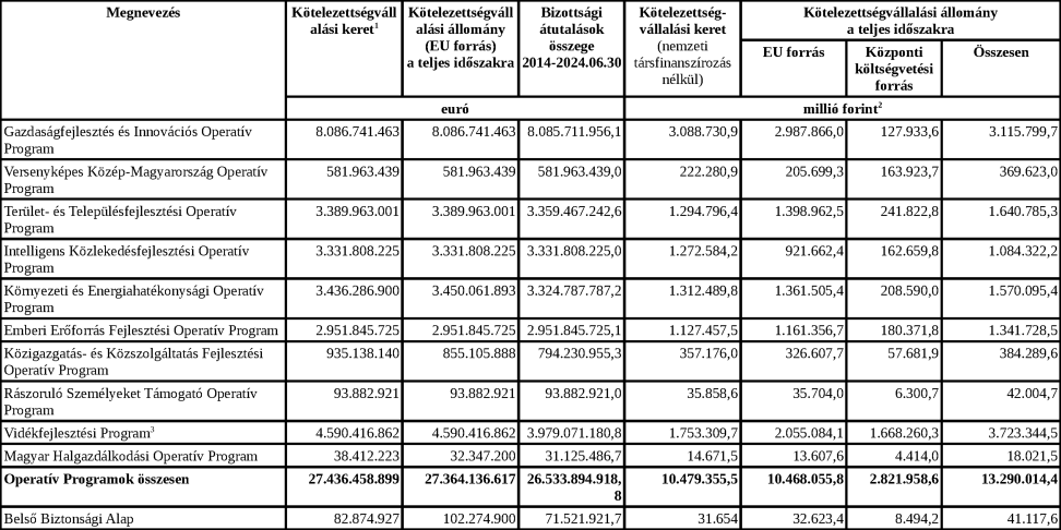 (1) Az Országgyűlés a 2014-2020-as programozási időszakra elfogadott Partnerségi Megállapodás keretében, az Európai Gazdasági Térség Finanszírozási Mechanizmus és a Norvég Finanszírozási Mechanizmus kereteiből, valamint a Belügyi alapokból finanszírozott programok, projektek esetén az uniós forrásokra és a kapcsolódó központi költségvetési finanszírozásra vonatkozó, a Kvtv. 30. §-a és a 33. §-a alapján tett, 2023. december 31-én fennálló kötelezettségvállalási állományt a 2. mellékletben meghatározott összegben hagyja jóvá.