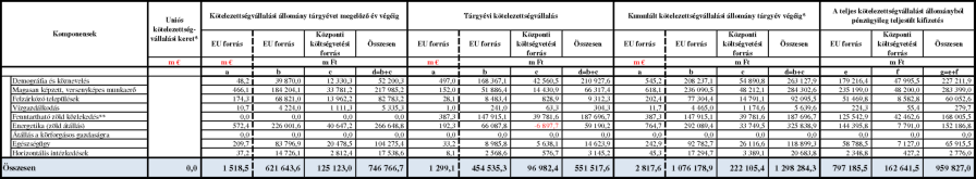 Helyreállítási és Ellenállóképességi Eszköz kötelezettségvállalási keretelőirányzatának és pénzügyi teljesülésének alakulása komponensenkénti bontásban