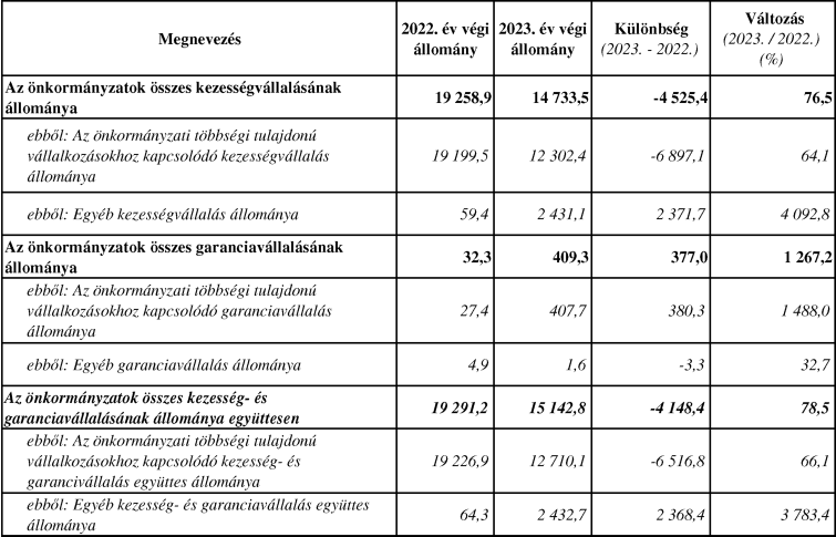 Az önkormányzatok kezesség- és garanciavállalása 2022. és 2023. év végi állományának alakulása