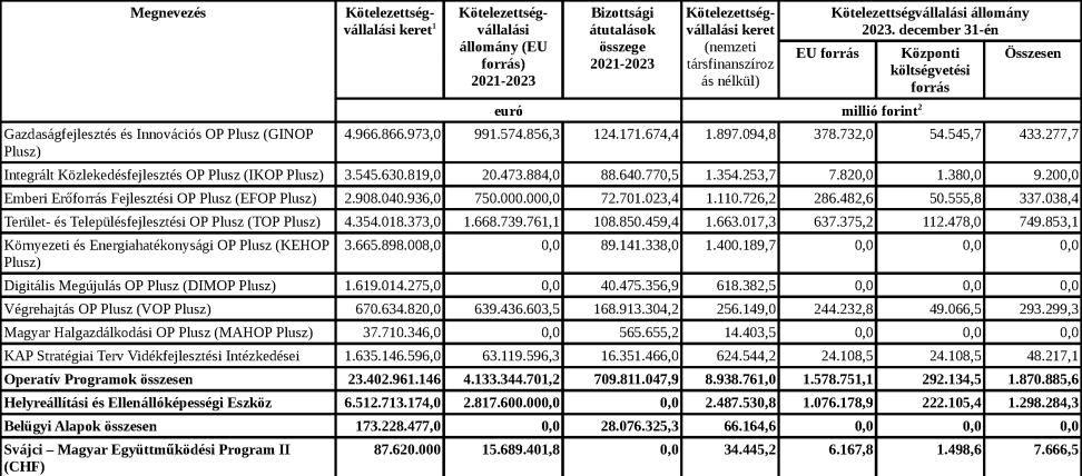 (2) Az Országgyűlés a 2021-2027-es programozási időszakra elfogadott Partnerségi Megállapodás keretében, a KAP Stratégiai Tervben, a Svájci - Magyar Együttműködési Program II, a Helyreállítási és Ellenállóképességi Eszköz, a Brexit Alkalmazkodási Tartalék, valamint a Belügyi Alapokból finanszírozott programok, projektek esetén az uniós forrásokra és a kapcsolódó központi költségvetési finanszírozásra vonatkozó, a Kvtv. 31. §-a és a 36-37. §-a alapján tett, 2023. december 31-én fennálló kötelezettségvállalási állományt a 3. mellékletben meghatározott összegben hagyja jóvá.