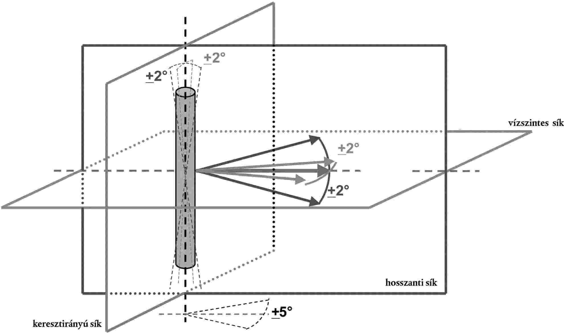 4.4. Az ütközésmérő tengelyének merőlegesnek kell lennie a vízszintes síkra, ±2o tűréssel a keresztirányú síkban és a hosszanti síkban. A vízszintes, a hosszanti és a keresztirányú sík egymásra merőleges (lásd a 8. ábrát).