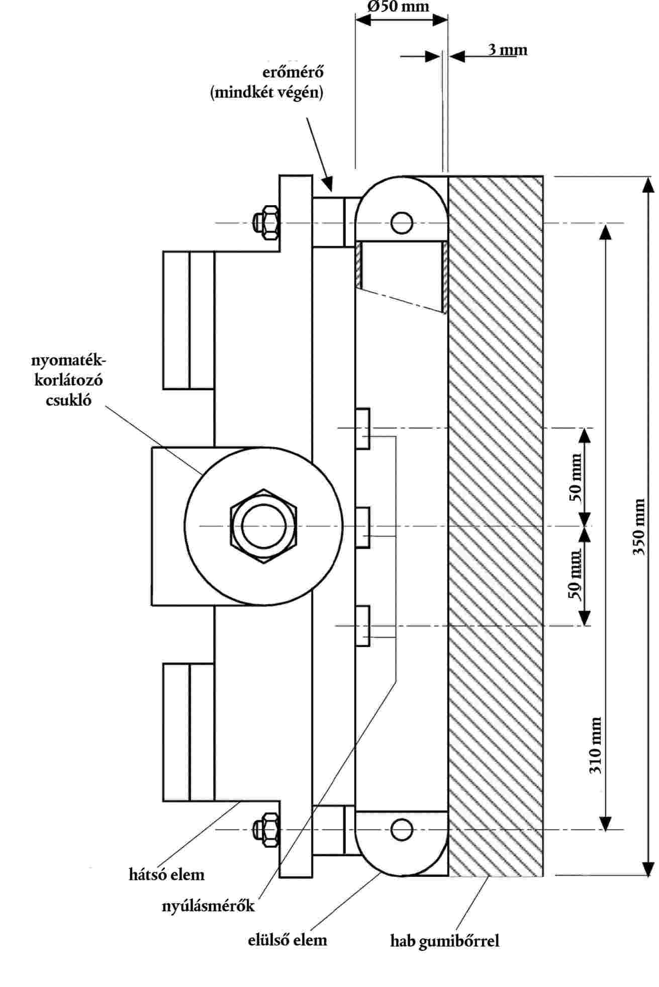 3.3. Az ütközésmérő két végén alkalmazott erők egyenkénti mérésére két erőmérőt, a hajlítónyomatékok mérésére pedig az ütközésmérő középpontjában és a középvonaltól mindkét oldalon 50 mm-re (lásd a 9. ábrát) nyúlásmérő bélyegeket kell alkalmazni.