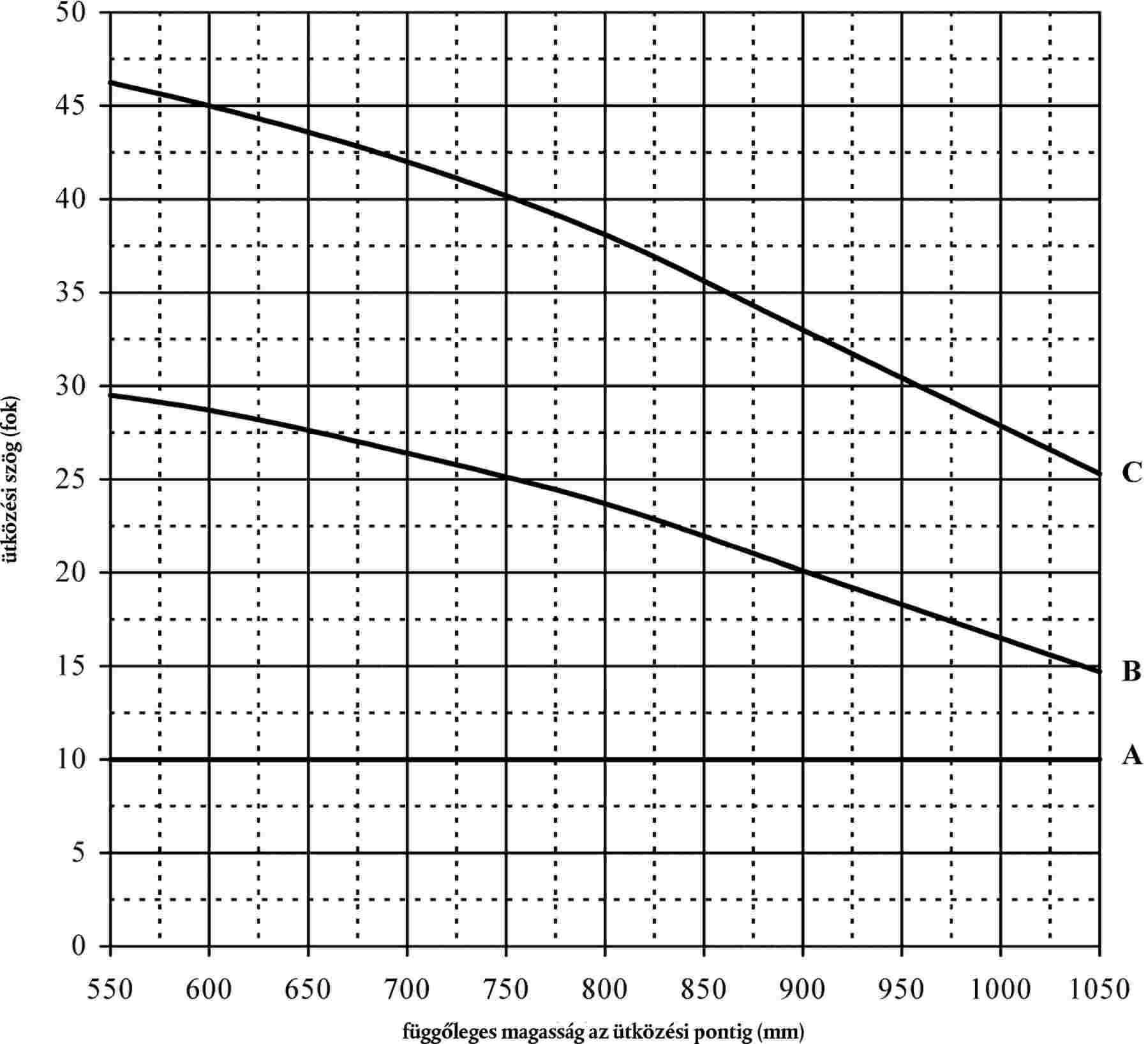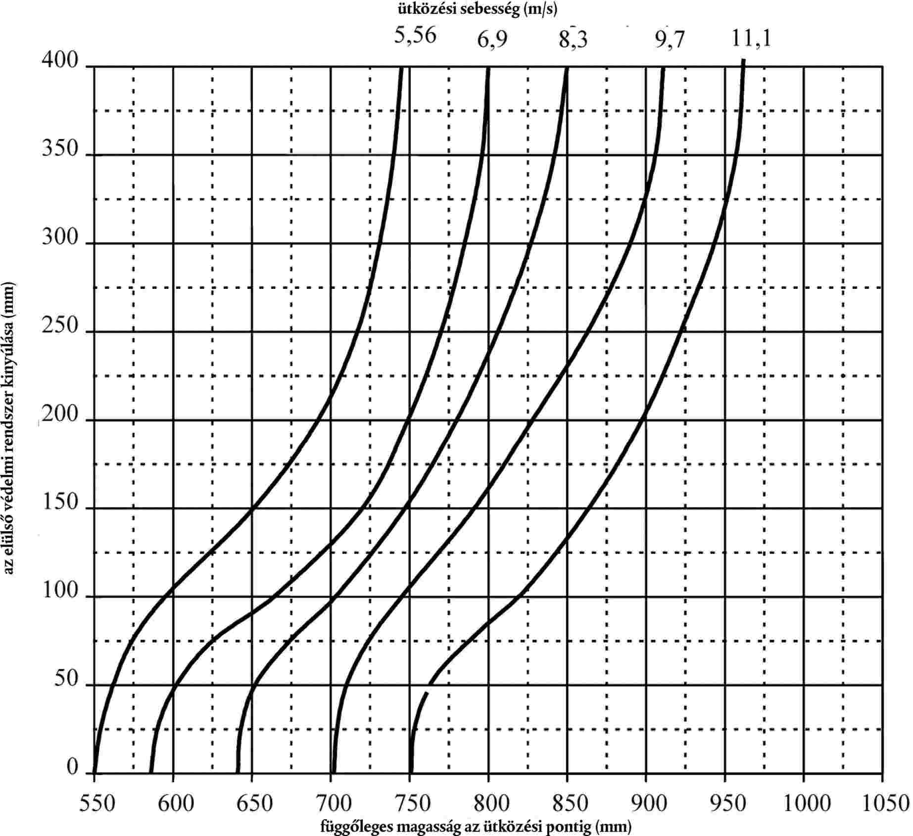 4.5. Az előírt ütközési sebességet és az ütközés szögét a 11. és a 12. ábráról kell leolvasni az elülső védelmi rendszer belépőélének referenciavonalán lévő előírt ütközési pozíció függőleges magassága, valamint az elülső védelmi rendszer kinyúlása függvényében.