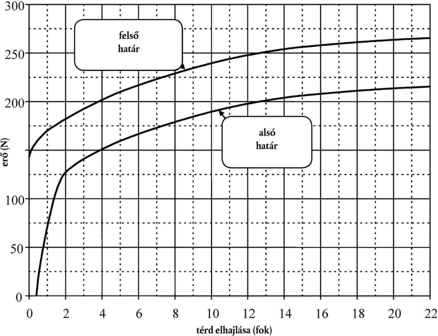 2.1.5. Amikor az ütközésmérőt a 2.1.7. bekezdés szerint, hajlításra terhelik, az alkalmazott erő és a szögelfordulás viszonyát leíró görbének a 16. ábrán látható határokon belül kell lennie. A 15,0°-os szögelfordulás előállításához a rendszernek 100 ± 7 J energiát kell felvennie.