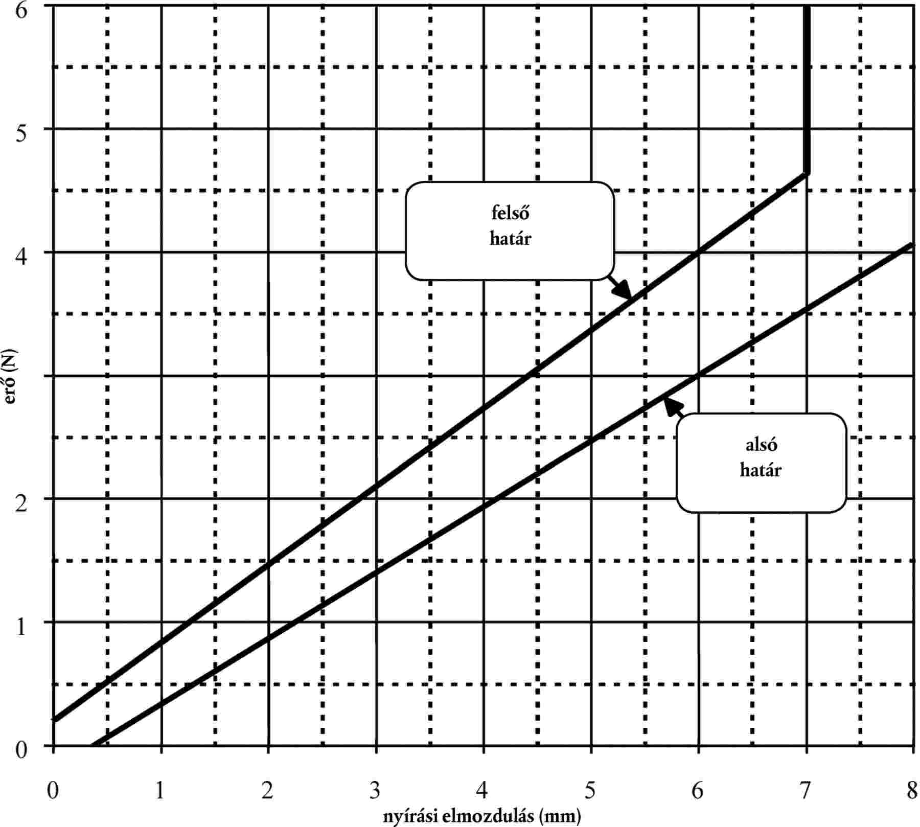 2.1.6. Amikor az ütközésmérőt a 2.1.8. bekezdés szerint, nyírásra terhelik, az alkalmazott erő és a nyírási elmozdulás viszonyát leíró görbének a 16. ábrán látható határokon belül kell lennie.
