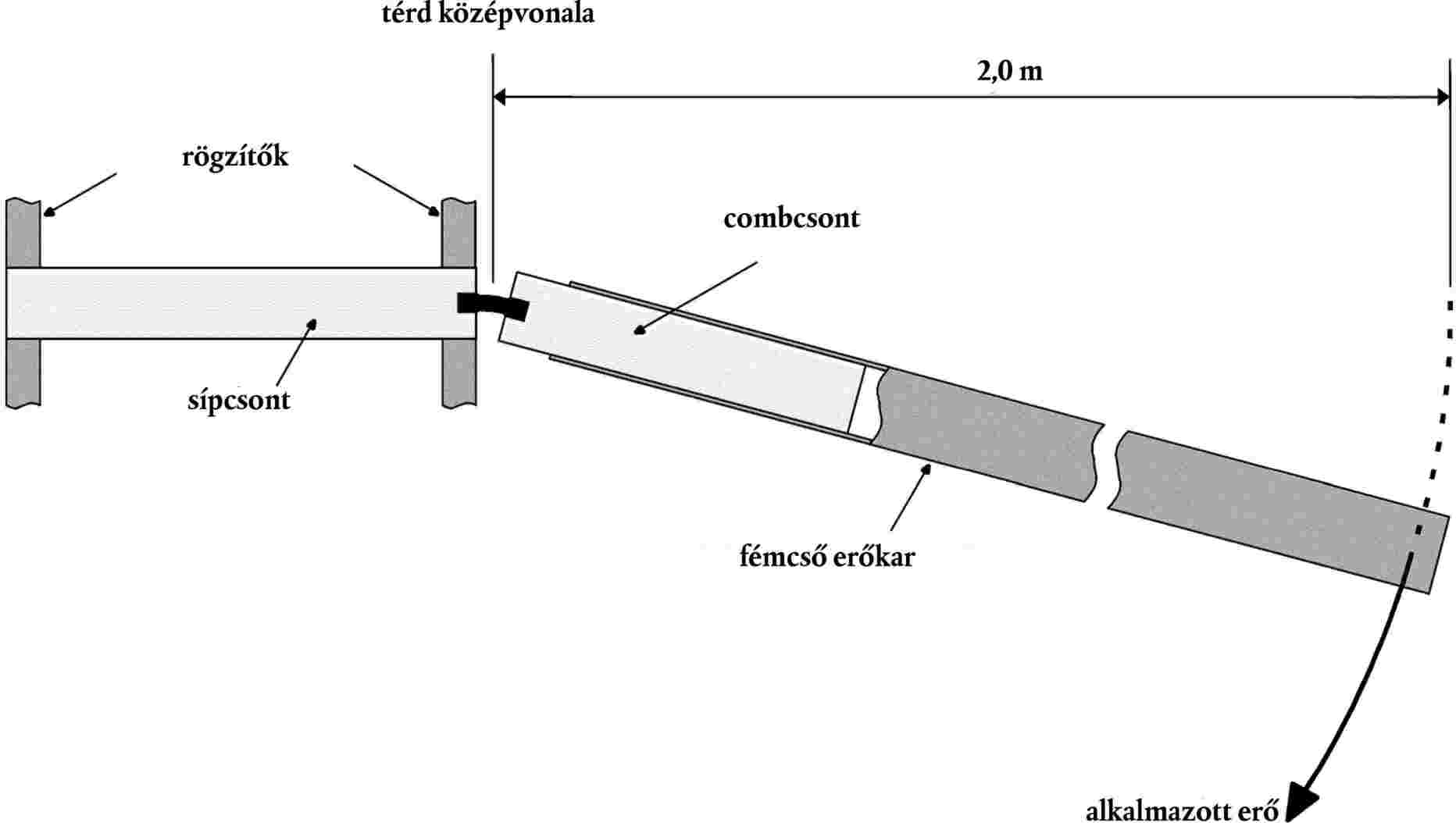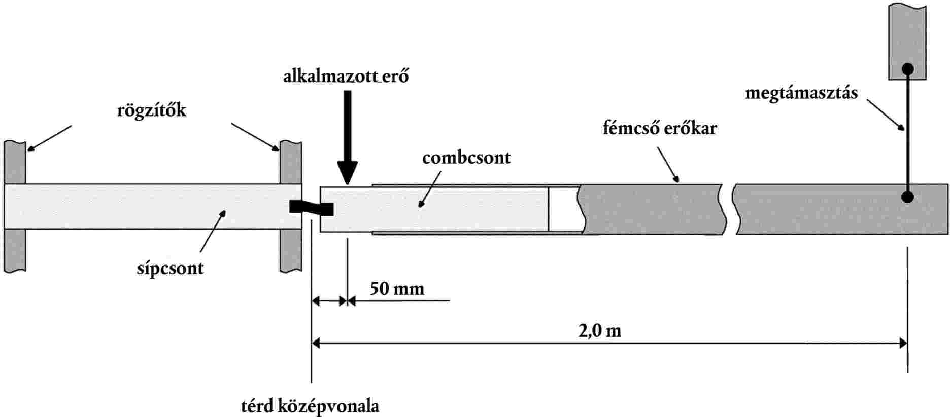 Az ütközésmérőt habburkolat és bőr nélkül úgy kell felszerelni, hogy a sípcsontot mereven hozzáerősítik egy rögzített vízszintes felülethez, egy fémcsövet a 19. ábrának megfelelően szorosan a combcsontra húznak, majd a térdízület középpontjától 2,0 m távolságban megtámasztják.