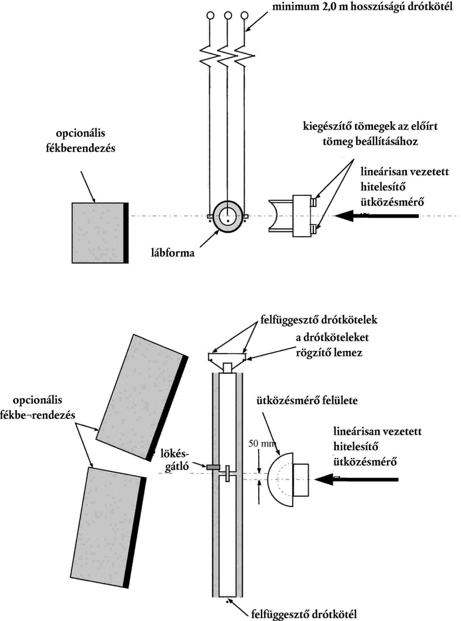 2.3.6. A hitelesítő ütközésmérőt a 2. ábrának megfelelően vízszintesen, 7,5 ± 0,1 m/s sebességgel kell a nyugvó ütközésmérőnek ütköztetni. A hitelesítő ütközésmérőt úgy kell beállítani, hogy középvonala a sípcsont középvonalát ±3 mm oldalirányú és ±3 mm függőleges tűréssel a térdközéptől 50 mm-re metssze.