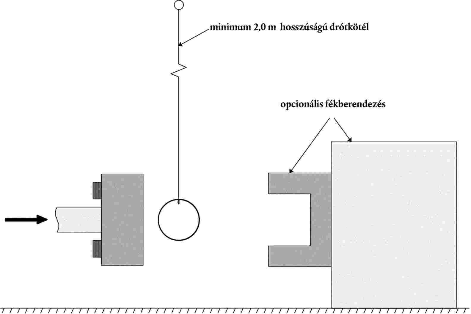 3.4.7. Az ingacső külső átmérője 150 +1 -4 mm, falvastagsága 3 ± 0,15 mm, tömege pedig 3 ± 0,03 kg legyen. Az ingacső teljes hosszának 275 ± 25 mm-nek kell lennie. Az ingacsövet hidegen húzott varratmentes acélcsőből kell készíteni (a korrózió elleni védelem érdekében a fémfelszín bevonattal ellátható) úgy, hogy külső felületi megmunkálása 2,0 mikrométer vagy annál jobb legyen. Az ingacsövet két 1,5 ± 0,2 mm átmérőjű és 2,0 m minimális hosszúságú drótkötéllel kell felfüggeszteni. Az inga felületének tisztának és száraznak kell lennie. Az ingacsövet úgy kell elhelyezni, hogy a henger hossztengelye ±2° tűréssel merőleges legyen az elülső elemre (azaz szintben legyen vele), ±2° tűréssel merőleges legyen az ütközésmérő mozgásirányára, és az ingacső középpontja ±5 mm oldalirányú és ±5 mm függőleges tűréssel egybeessen az ütközésmérő elülső elemének középpontjával.