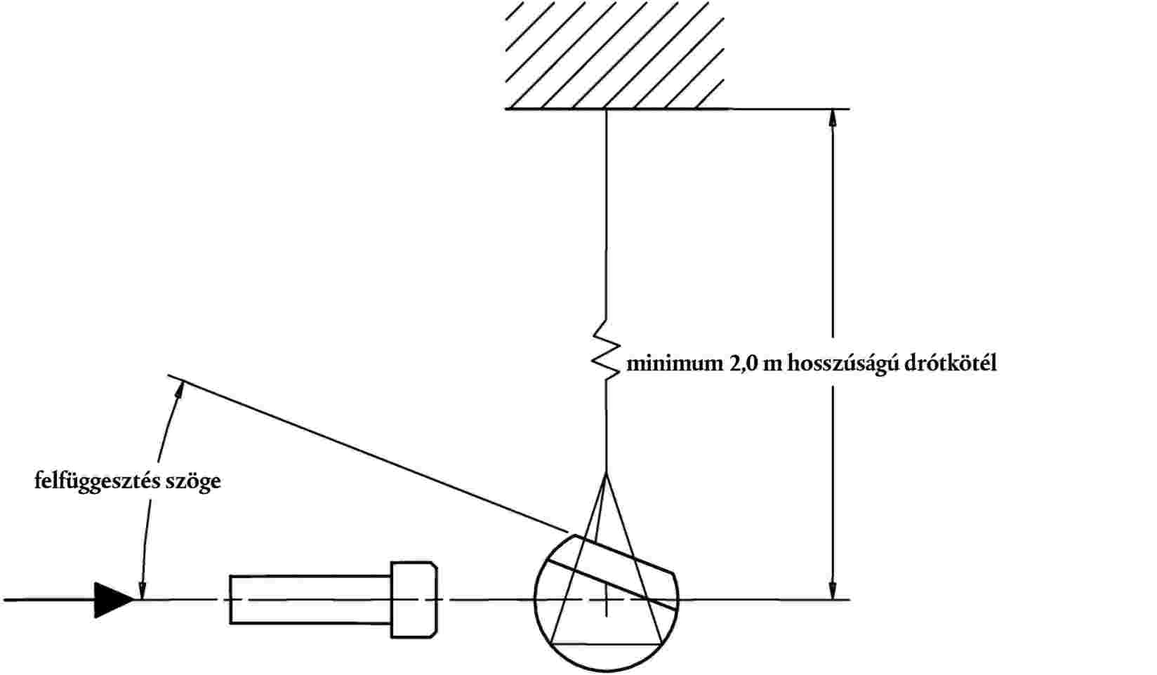 2.3.1. A habbal és bőrrel borított ütközésmérőt a 20. ábrának megfelelően három, 1,5 ± 0,2 mm átmérőjű és minimum 2,0 m hosszúságú drótkötéllel vízszintesen fel kell függeszteni. A felfüggesztett ütközésmérő hosszanti tengelye ±0,5° tűréssel vízszintes, a hitelesítő ütközésmérő mozgásirányára ±2° tűréssel merőleges legyen. A térdízület helyes működése érdekében az ütközésmérő terv szerinti irányát hosszanti tengelyéhez képest ± 2° tűréssel kell tartani. Az ütközésmérőnek a drótkötelek rögzítőbilincseinek felszerelt állapotában meg kell felelnie a II. rész III. fejezetének 3.1. bekezdésében meghatározott követelményeknek.