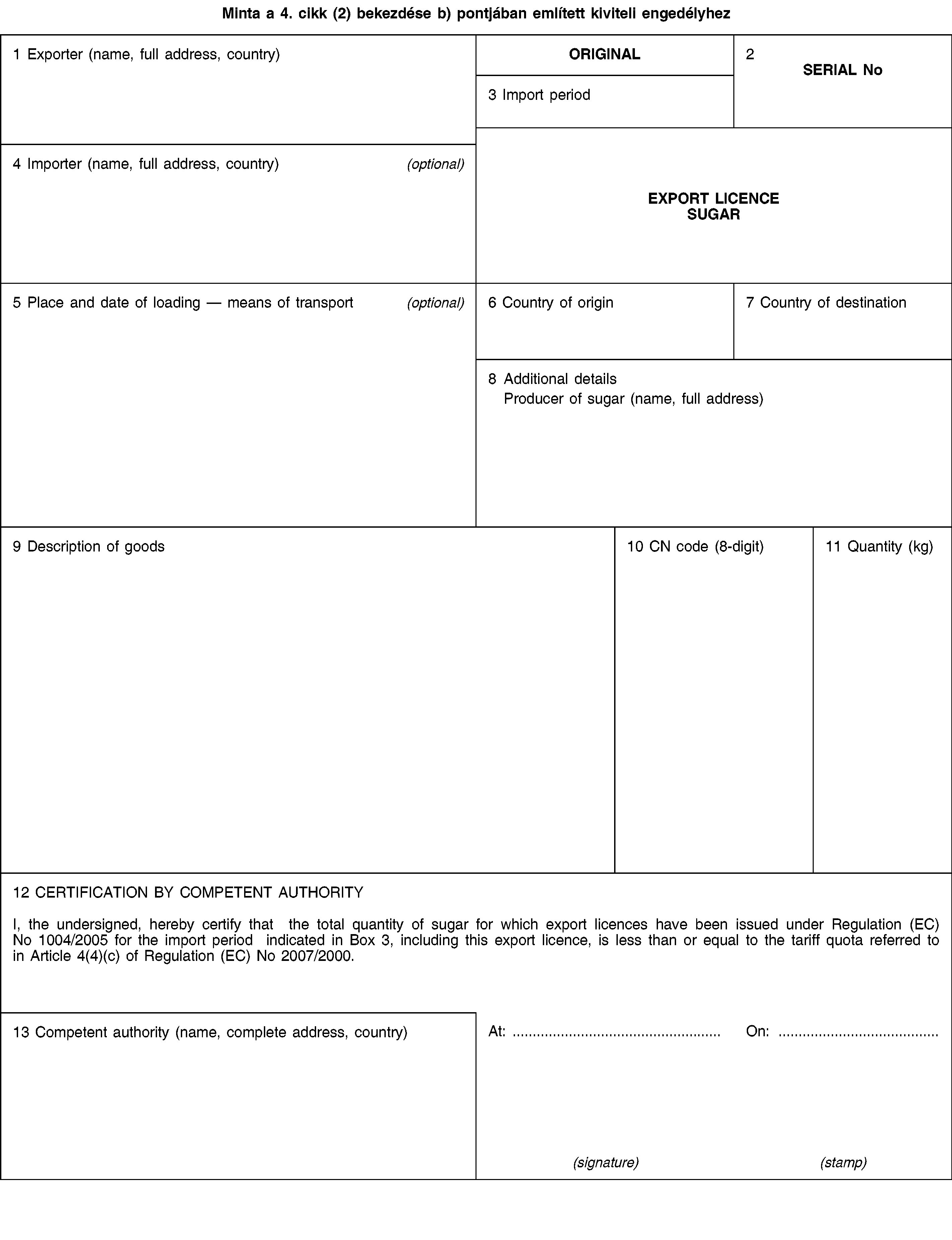 b) a Szerbiából, Montenegróból és Koszovóból származó behozatalok esetében a Szerbia, Montenegró és Koszovó hatóságai által a behozatali engedély iránti kérelemben szereplő mennyiséggel megegyező mennyiségre, az I. mellékletben meghatározott mintának megfelelően kiállított behozatali engedély eredeti példánya és másolata. A behozatali engedély eredeti példányát a tagállam illetékes hatóságának kell megőriznie.