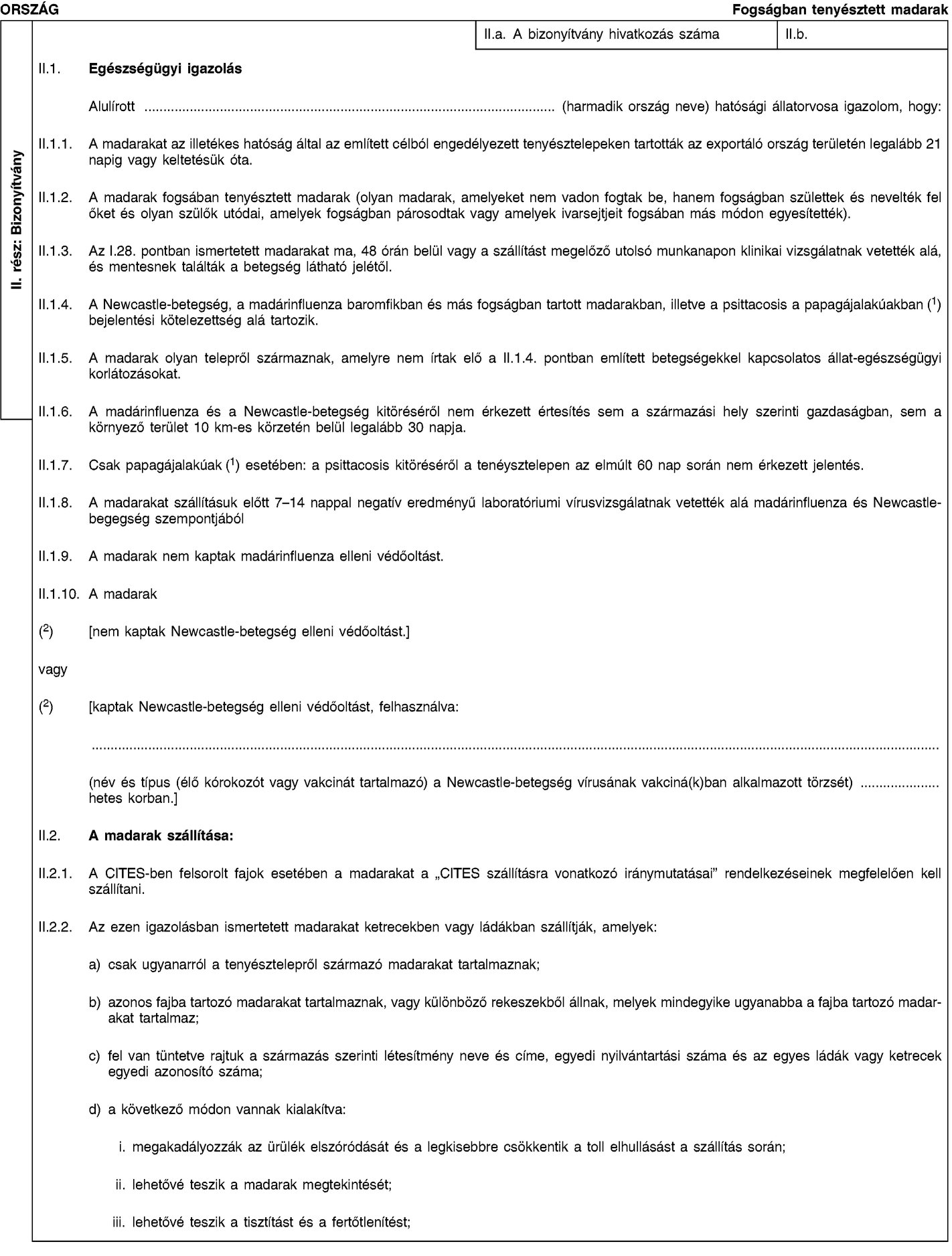 2. A karanténba kerülő madarak minden szállítmányának esetében: