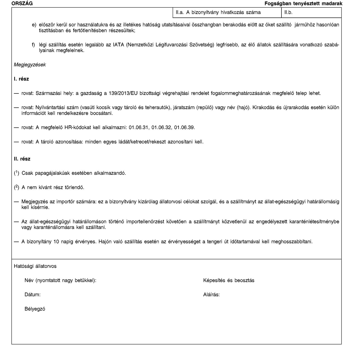j) a madarakat olyan új tárolókban szállítják, amelyeket külsőleg az állat-egészségügyi bizonyítványon feltüntetett azonosító számmal megegyező azonosító szám egyedileg azonosít.
