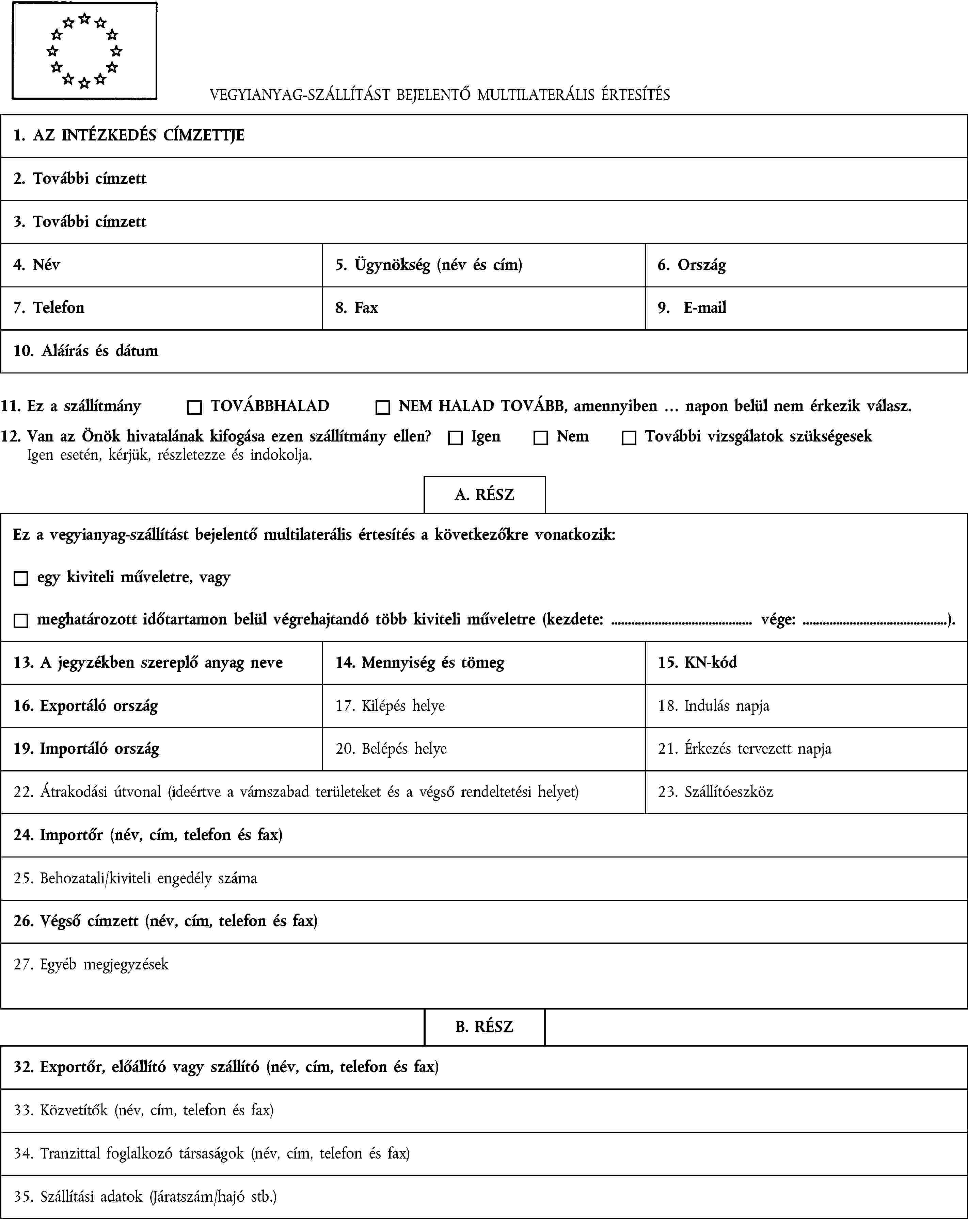 18. pont (indulás napja): A több kiviteli műveletre vonatkozó vegyianyag-szállítást bejelentő multilaterális értesítés esetén ebben a rovatban fel kell tüntetni a tervezett legvégső indulási napot.