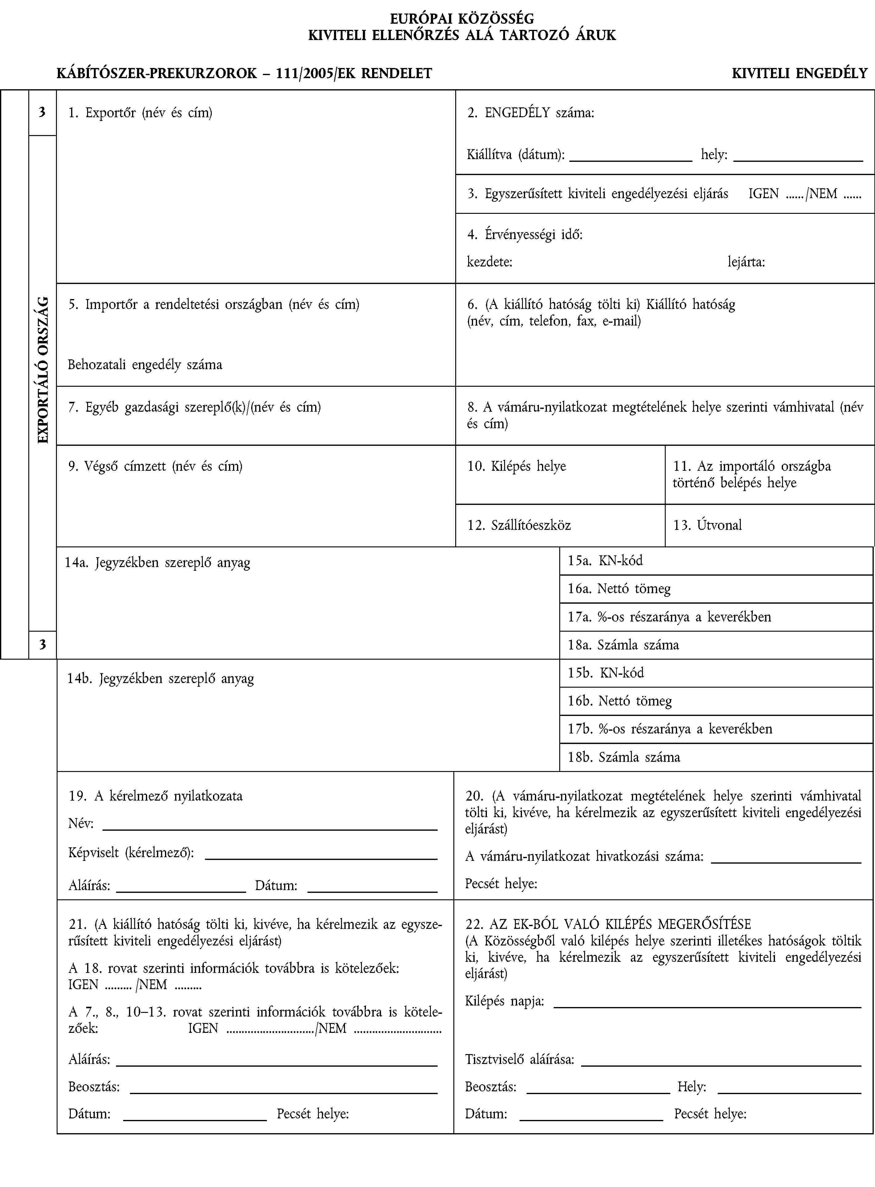 - a 111/2005/EK rendelet mellékletében felsorolt, jegyzékben szereplő anyagok kivitelére vonatkozó valamennyi kötelezettség betartása.