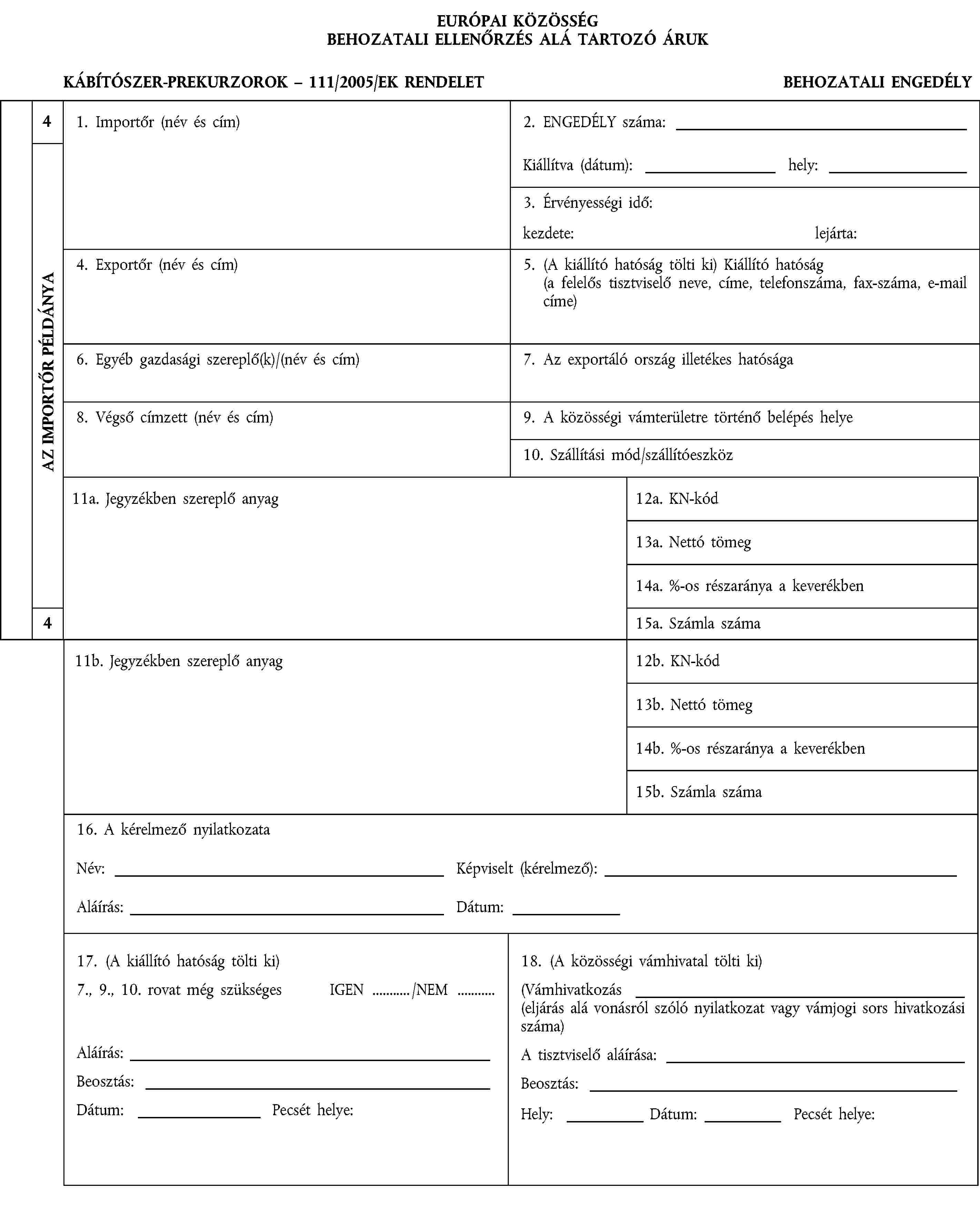 15a. , b. rovat: Tüntesse fel a jegyzékben szereplő anyagnak a 111/2005/EK rendelet melléklete szerinti nyolcjegyű KN-kódját.