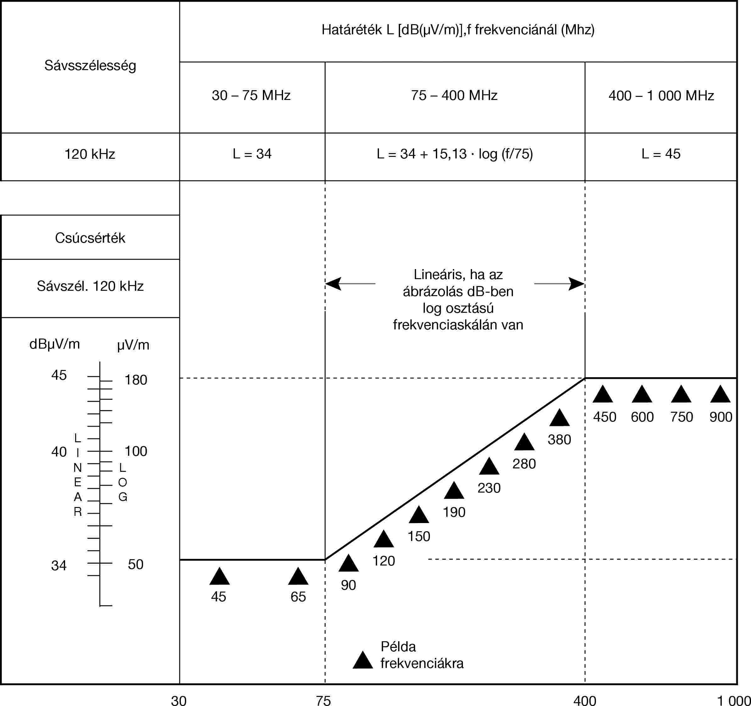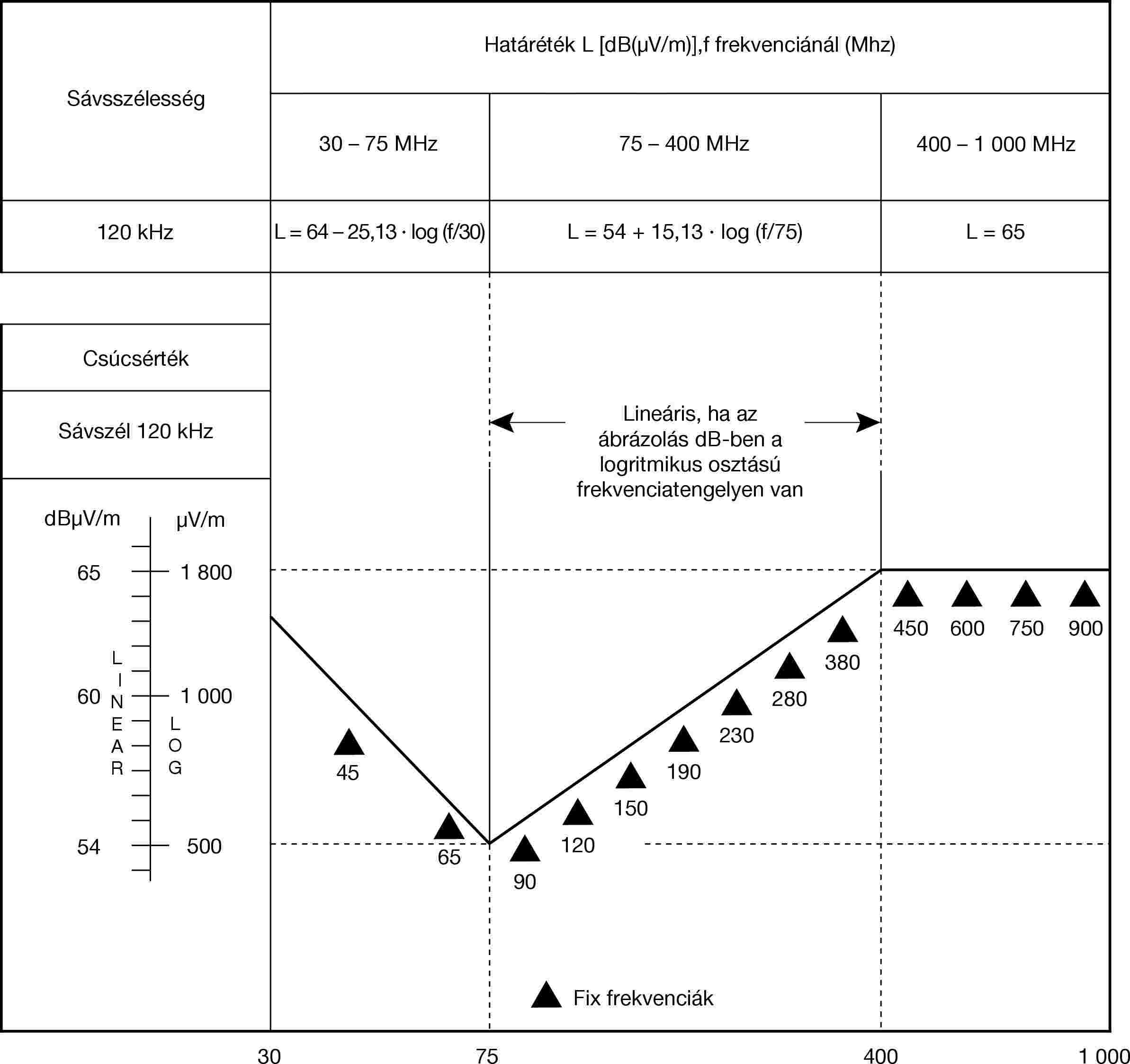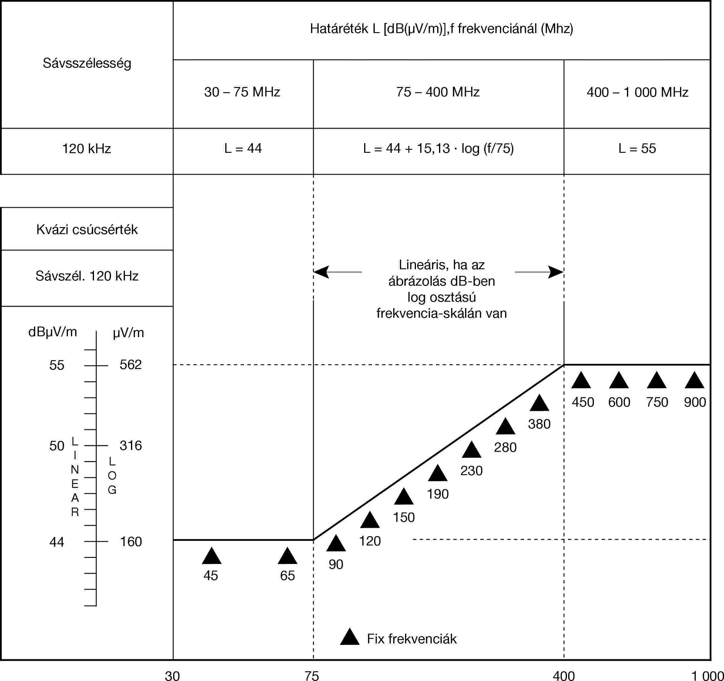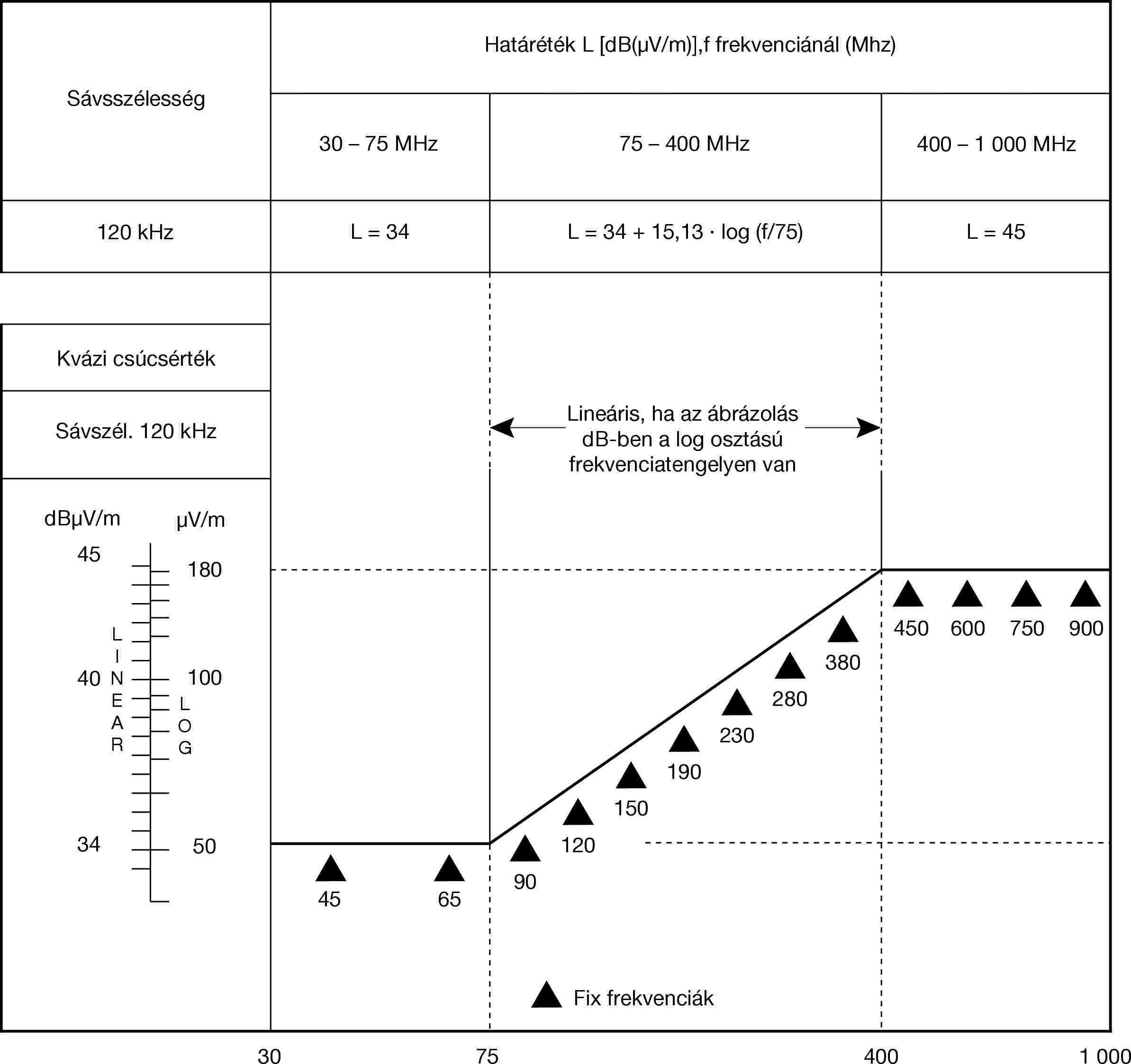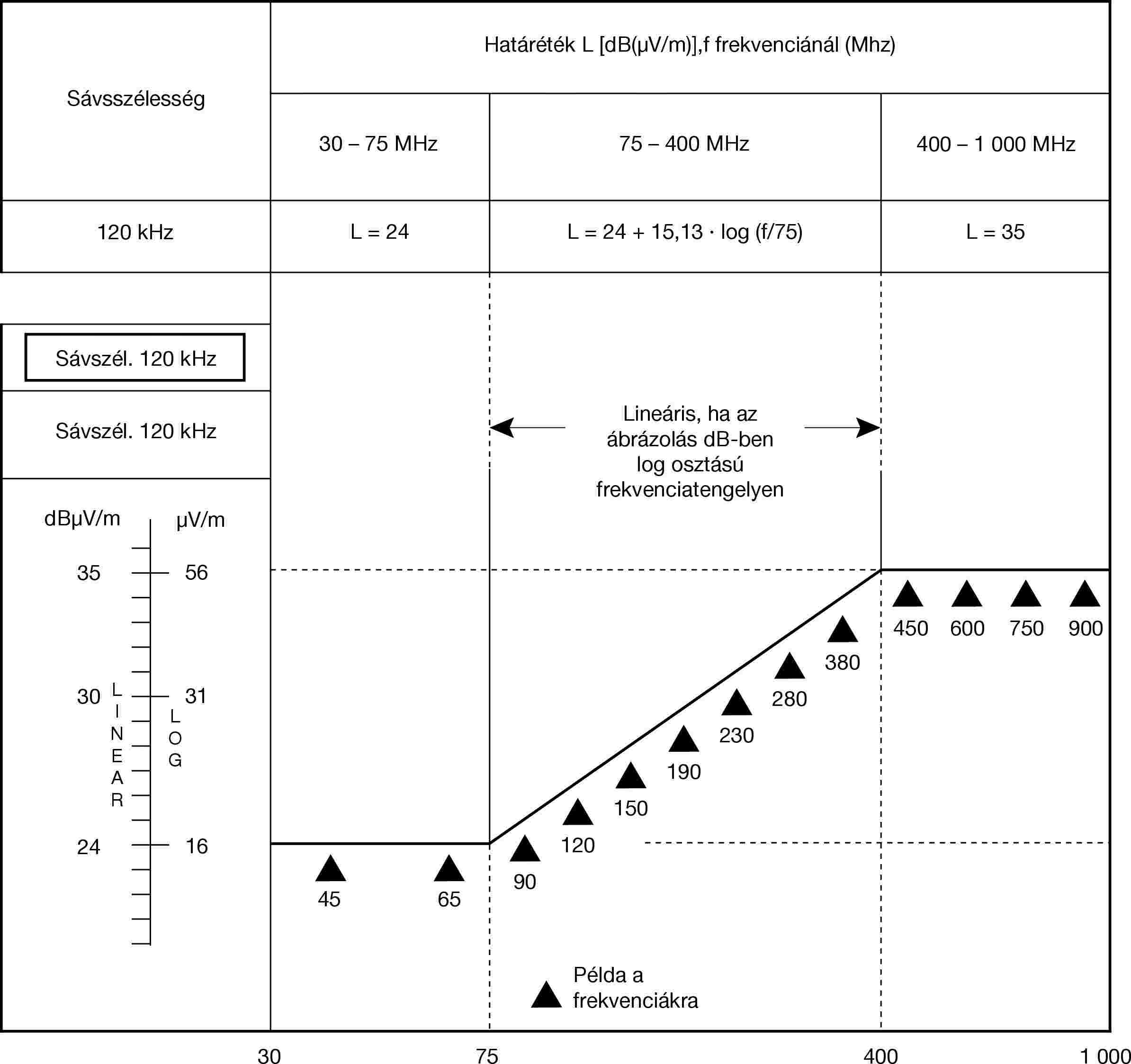 | 3. függelék | Keskeny sávú vonatkozási határértékek járművekre: Antenna – jármű távolság: 10 m | ||