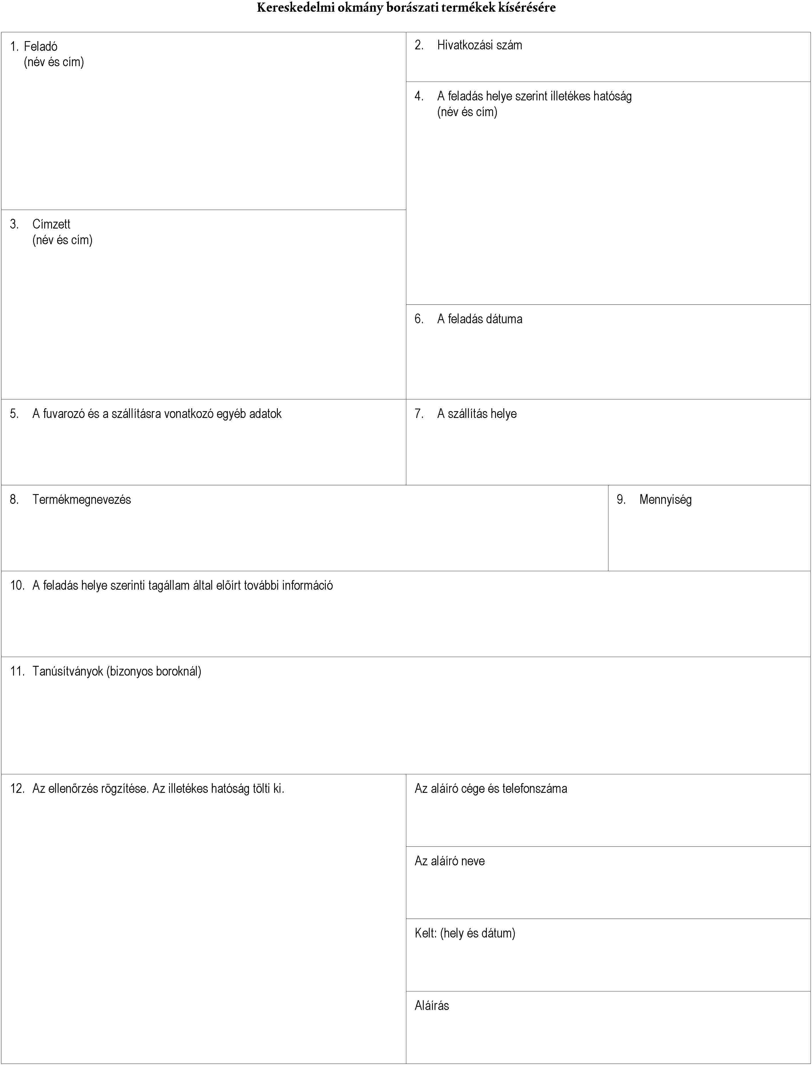 (5) A fent említett adóformalitásoktól mentes borászati termékek szállítását olyan okmánynak kell kísérnie, amely lehetővé teszi, hogy az illetékes hatóságok figyelemmel kísérhessék a szóban forgó termékek mozgását. Erre a célra elismerhető bármely, a termék azonosításához és mozgásának nyomon követéséhez szükséges részleteket tartalmazó kereskedelmi okmány.