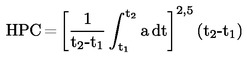 ahol "a" az eredő gyorsulás "g"-ben, és t1, illetve t2 az a (másodpercben kifejezett) két időbeli pillanat az ütközés során, amely meghatározza azt az időintervallumot, amikor a HPC értéke a legnagyobb. A legnagyobb érték számításánál azokat a HPC-értékeket, amelyeknél a (t1-t2) időintervallum nagyobb, mint 15 ms, figyelmen kívül kell hagyni.