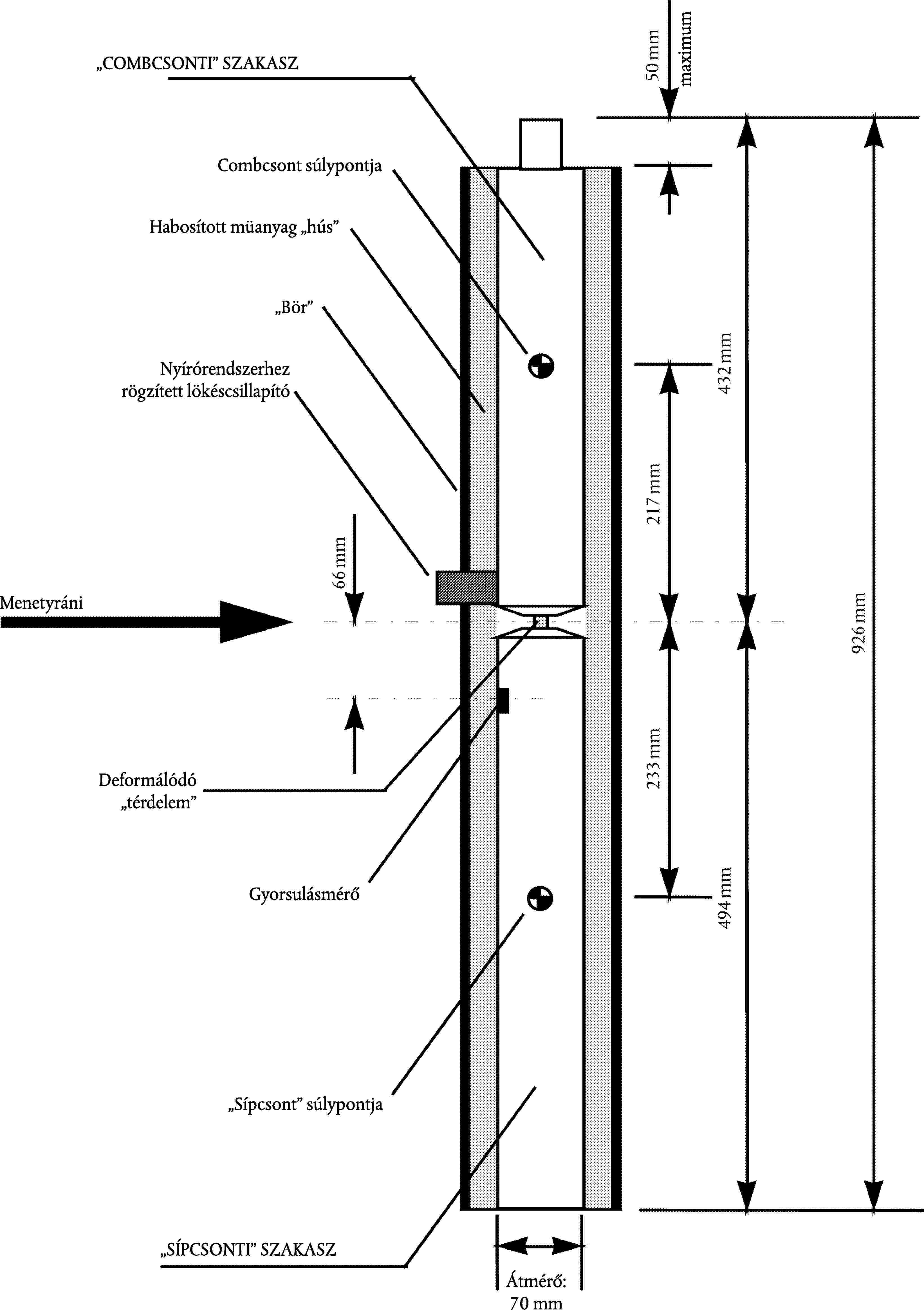2.2.2. Amikor a próbatestet a 2.2.4. pont szerint egyenesen vezetett tanúsító próbatesttel ütközik, a sípcsont felső végén mért legnagyobb gyorsulás nem lehet kevesebb, mint 120 g, és nem lehet több, mint 250 g. A legnagyobb hajlítási szög nem lehet kevesebb, mint 6,2o, és nem lehet több, mint 8,2o. A legnagyobb nyírási elmozdulás nem lehet kevesebb, mint 3,5 mm, és nem lehet több mint 6,0 mm.