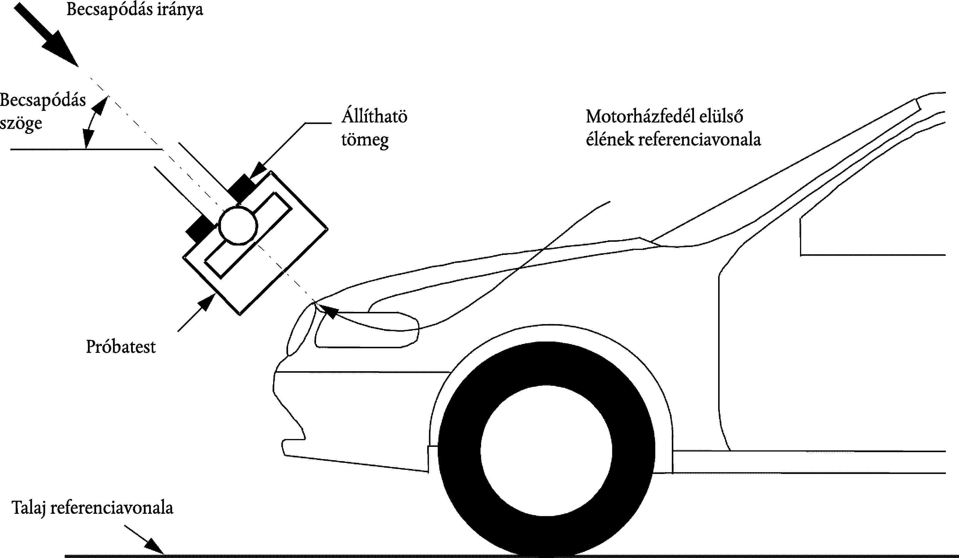 IV. FEJEZET | A csípõformájú próbatestnek a motorházfedél elülsõ élével való ütközéses vizsgálata | |
