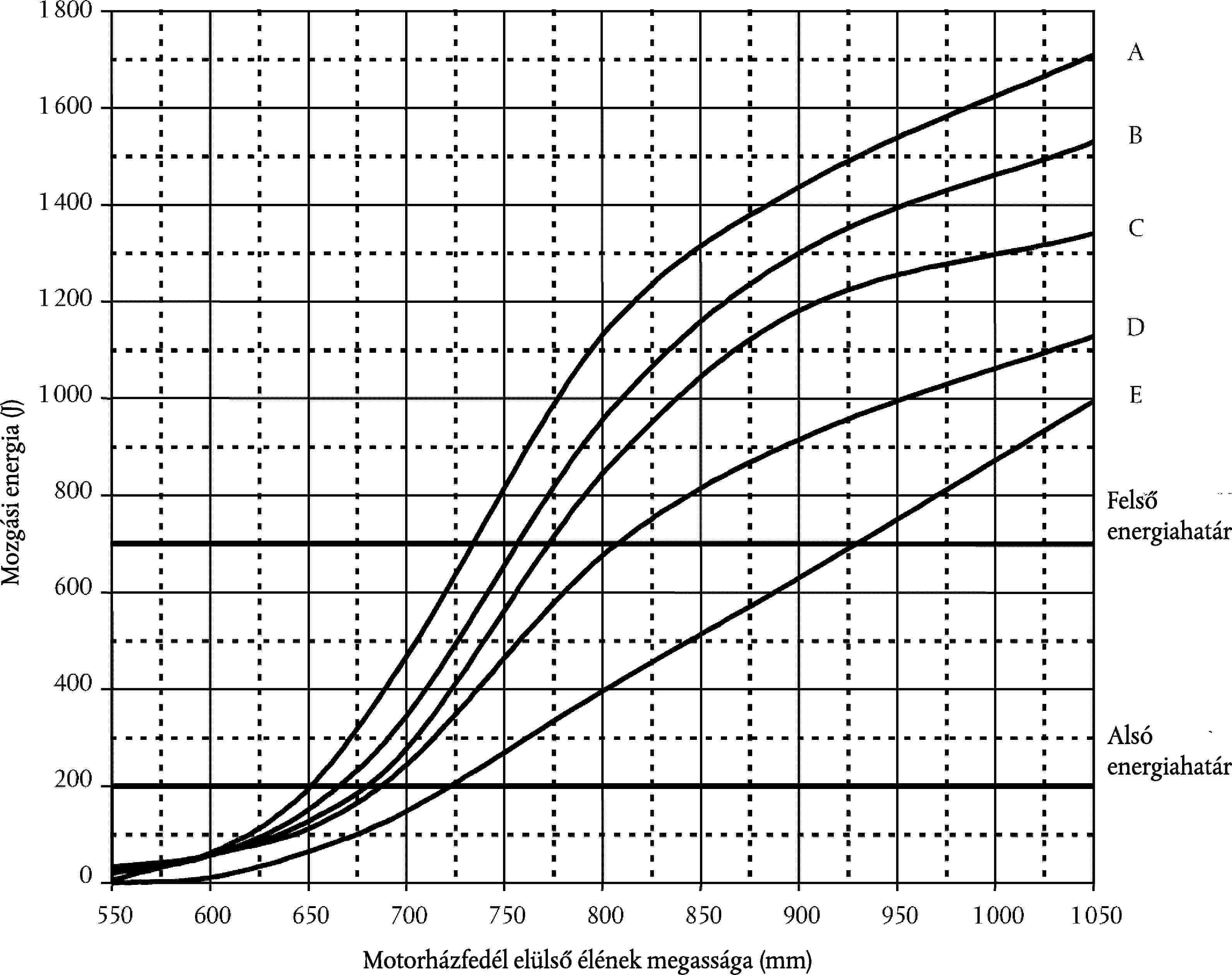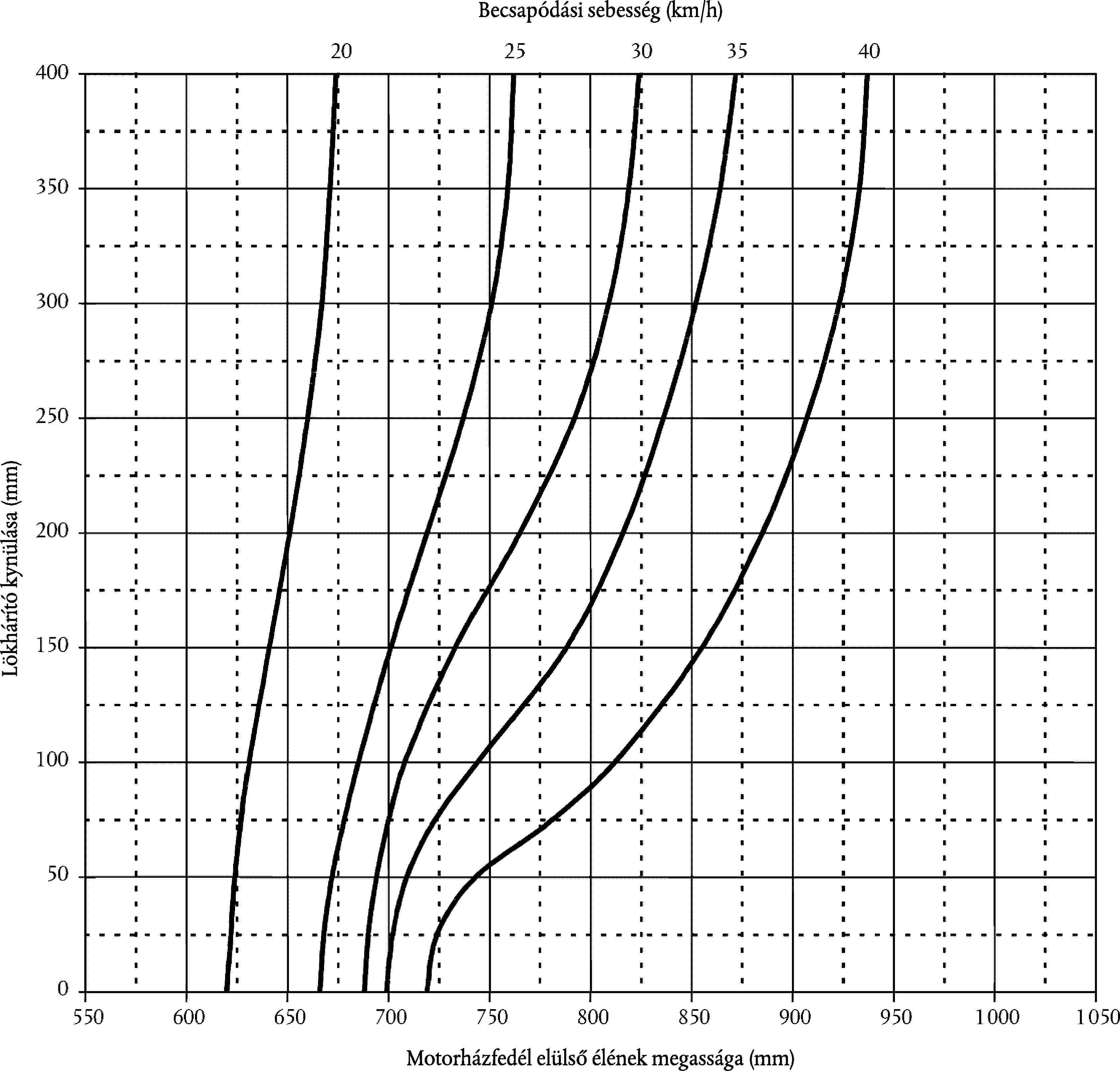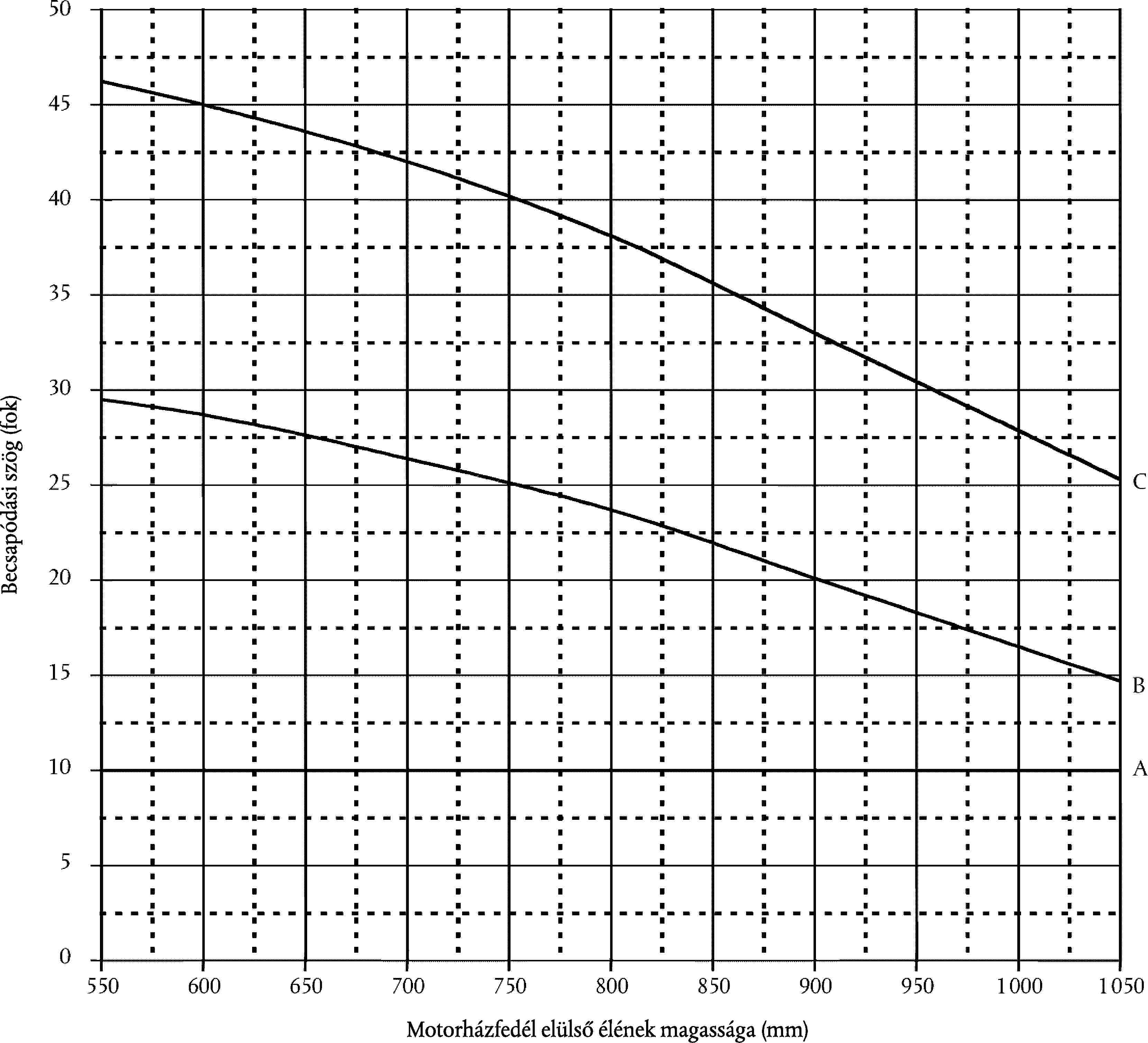 Ha a sablon "A" és "B" pontjai egyidejűleg nem maradhatnak a motorházfedél oldalsó referenciavonalán, miközben a sablon íve érinti a motorházfedél hátsó referenciavonalát, vagy a motorházfedél hátsó referenciavonala és a sablon érintkezési pont belül esik a "C" és "D" pontjai által meghatározott íven, abban az esetben további sablonokat kell alkalmazni, amelyek sugarát 20 mm-es lépésekben növelni kell mindaddig, ameddig a fenti feltételek teljesülnek.