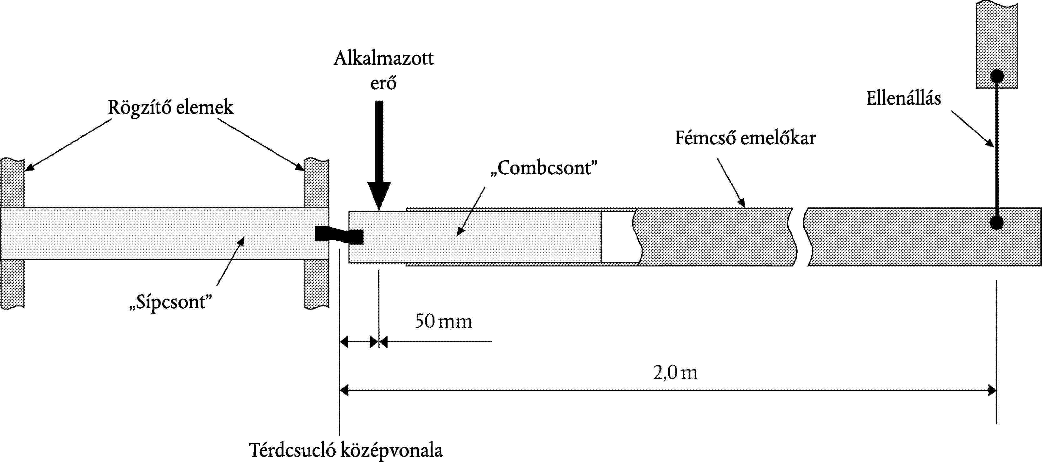 2.1.5. A habosított műanyag-, illetve "bőr" burkolat nélküli próbatest sípcsontrészét szilárdan rögzíteni kell egy vízszintes felülethez, miközben a combcsontot szilárdan rögzített fémcsővel hosszabbítják meg, amit a térdcsukló középpontjától 2,0 m-re megtámasztanak, a 4. ábra szerint.