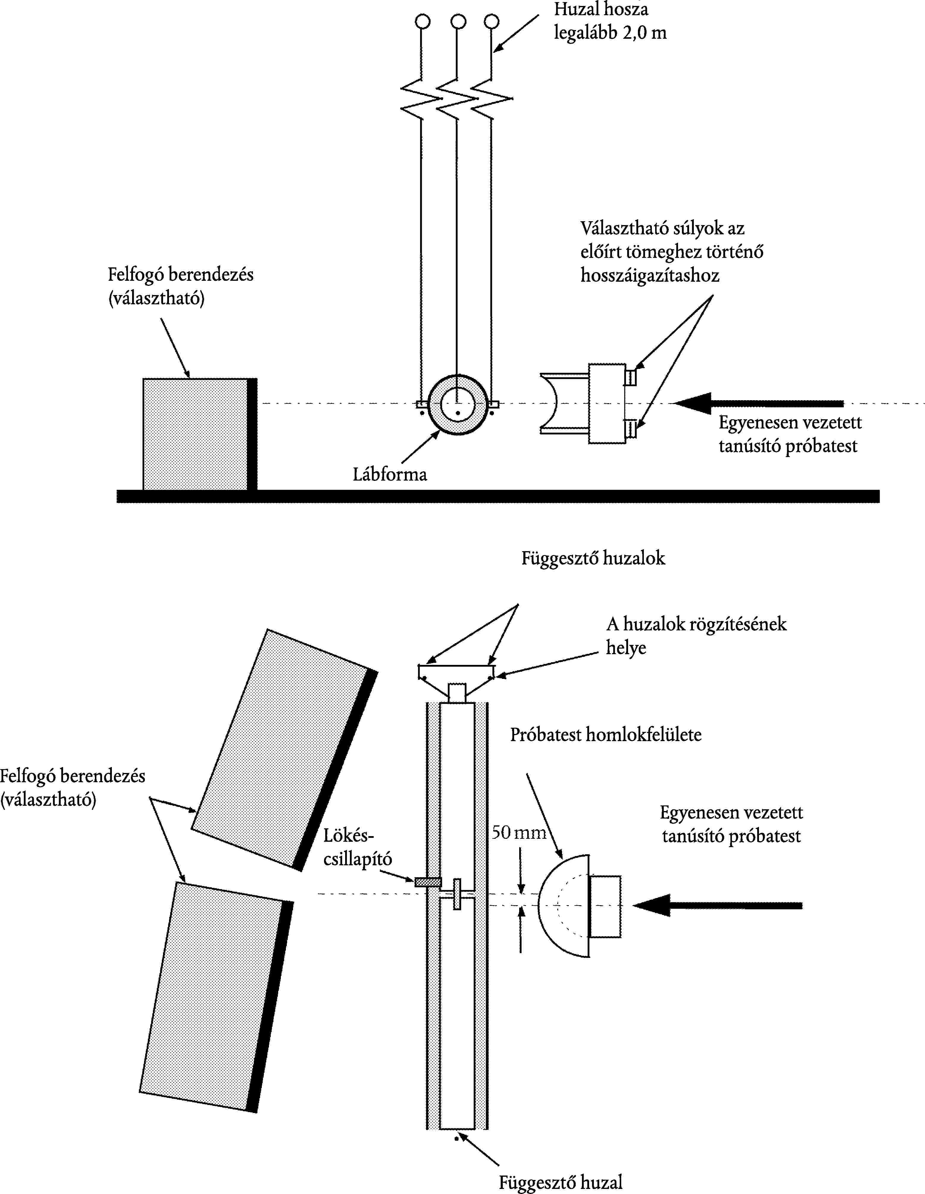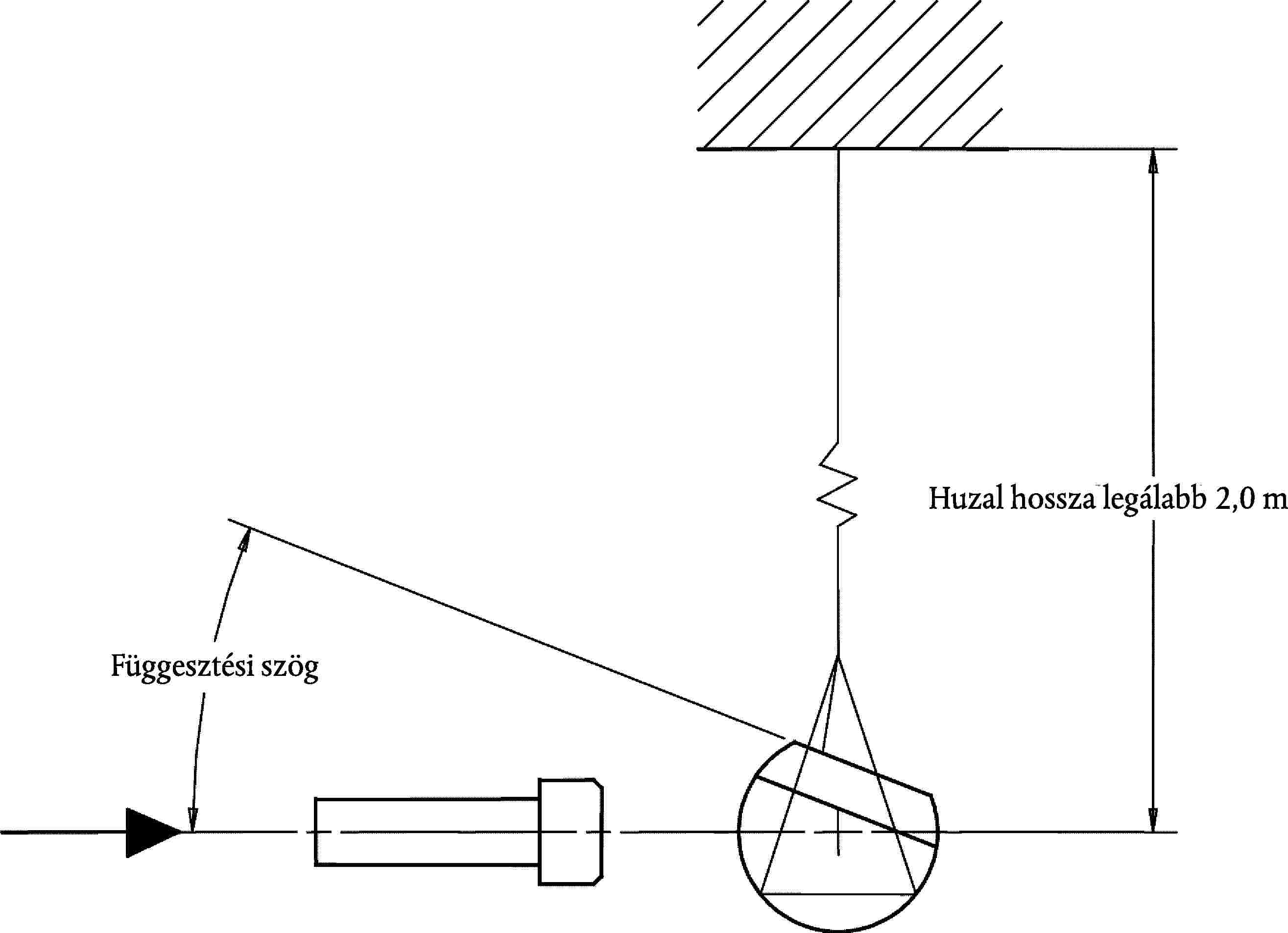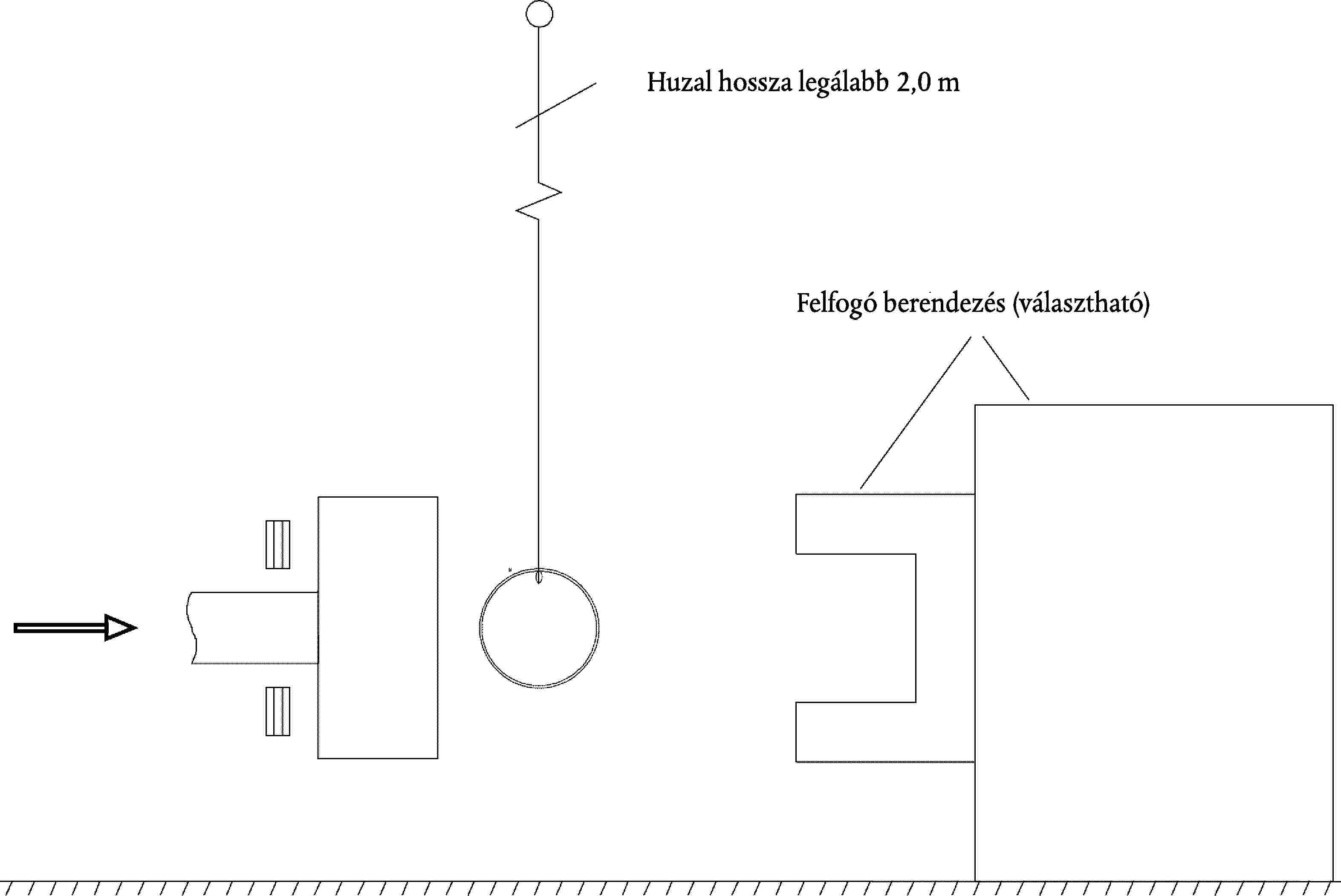3.3.7. Az ingaként alkalmazott csődarab tömegének 3 ± 0,03 kg-nak, külső átmérőjének 150 ± 1 mm-nek, és falvastagságának 3 ± 0,15 mm-nek kell lennie. Az inga csöve teljes hosszának 275 ± 25 mm-nek kell lennie. Az ngacsőnek hidegen hengerelt, varratmentes acélból kell készülnie (fém felületi bevonat a korrózió elleni védelem céljára megengedett), külső felületi érdességének 2,0 mikrométernél kisebbnek kell lennie. Az ingát két 1,5 ± 0,2 mm átmérőjű és legalább 2,0 m hosszúságú huzalra kell felfüggeszteni. Az inga felületének tisztának és száraznak kell lennie. Az inga csövét úgy kell elhelyezni, hogy a henger hossztengelye ± 2o tűréshatárral a próbatest elülső részére merőleges (azaz vízszintes) legyen, valamint a próbatest mozgásának irányára ± 2o tűréshatárral merőleges legyen, illetve az inga csövének középpontja a próbatest első része középpontjával oldalirányban és függőlegesen ± 5 mm tűréssel szemben helyezkedjen el.