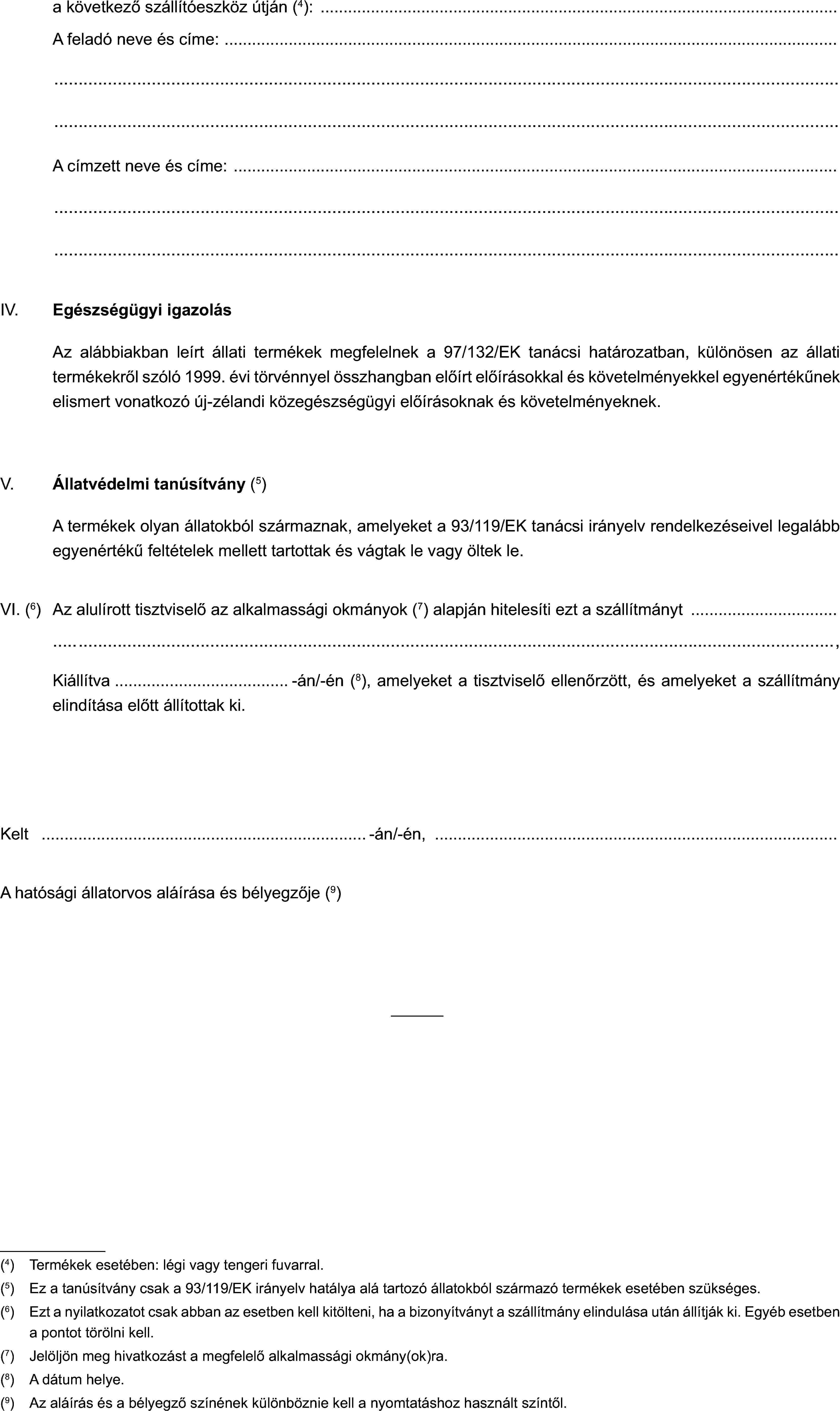 Az I. mellékletben felsorolt állati termékek hivatalos egészségügyi bizonyítványa(i)nak a VI. mellékletben meghatározott kiegészítő nyilatkozato(ka)t is tartalmazniuk kell, ha ezeket harmadik országból importálták Új-Zélandra, majd innen a Közösségbe exportálták.