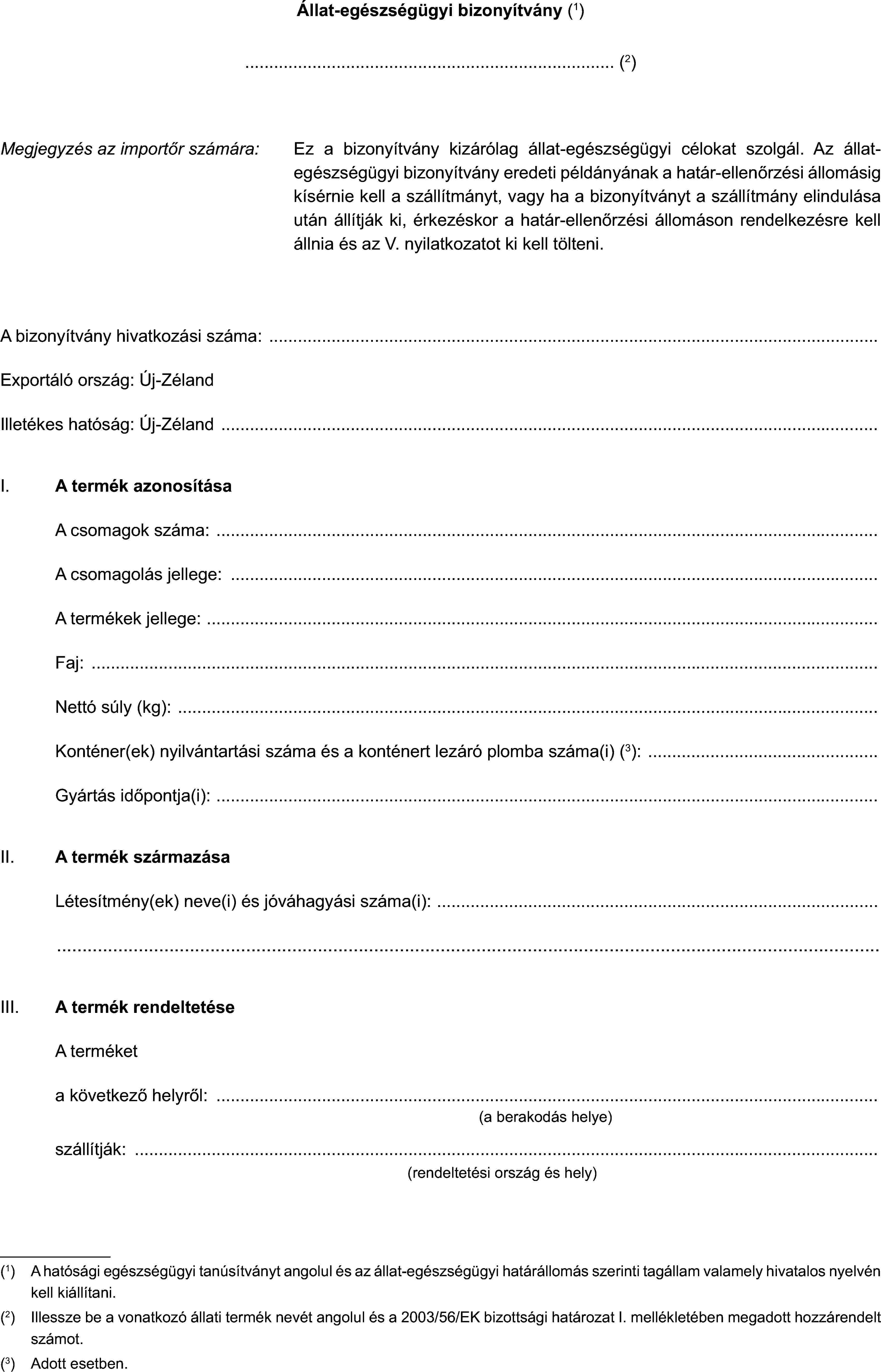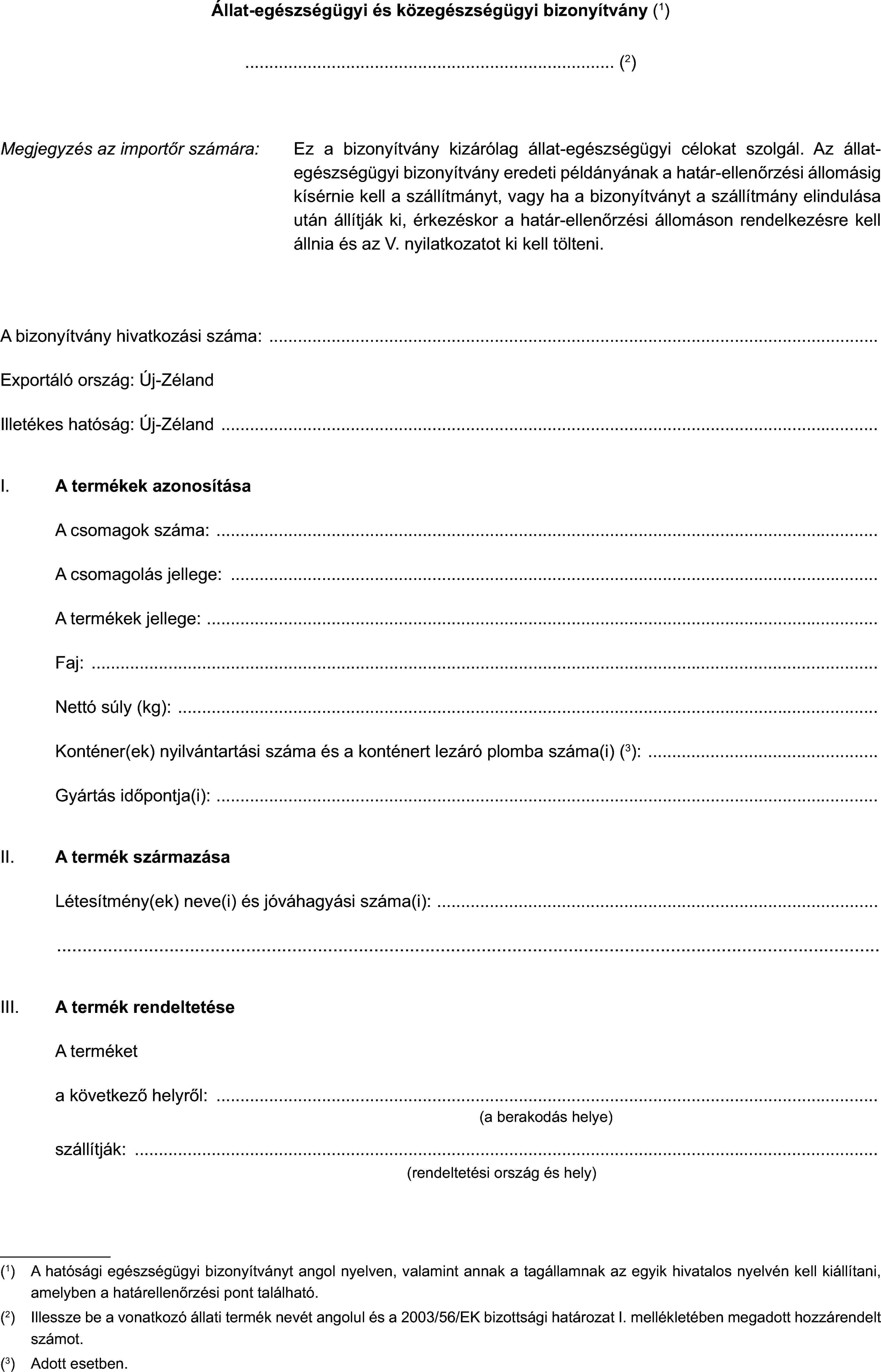 (1) A tagállamok engedélyezik Új-Zélandról az I. mellékletben felsorolt élő állatok és állati termékek behozatalát, feltéve hogy azok megfelelnek a fenti mellékletben említett bizonyítványkiállítási követelményeknek, és amennyiben szükséges, azokat a szállítmány Új-Zélandról való elindítása előtt az alábbi minták valamelyikével összhangban kiállított hivatalos egészségügyi bizonyítvány kíséri: