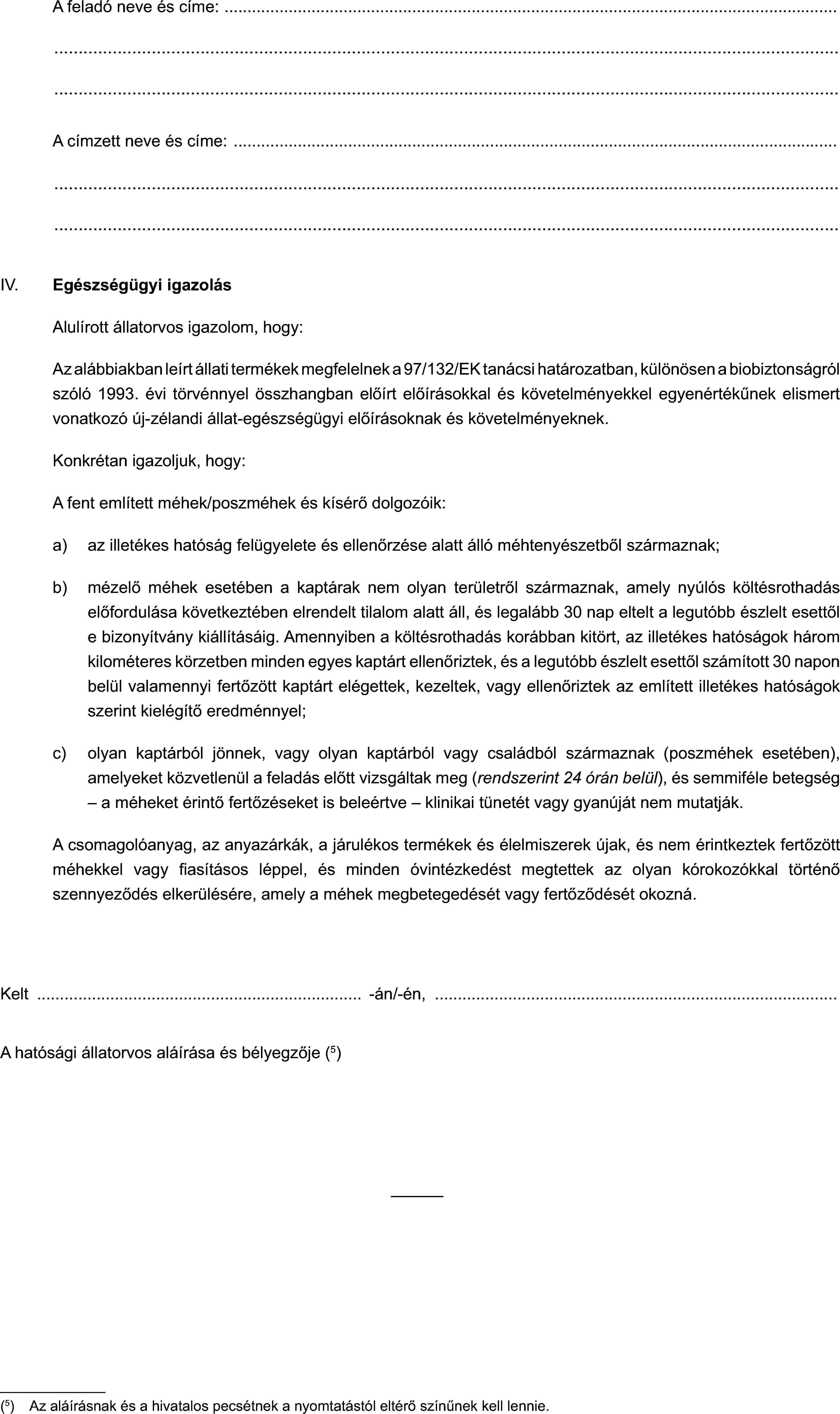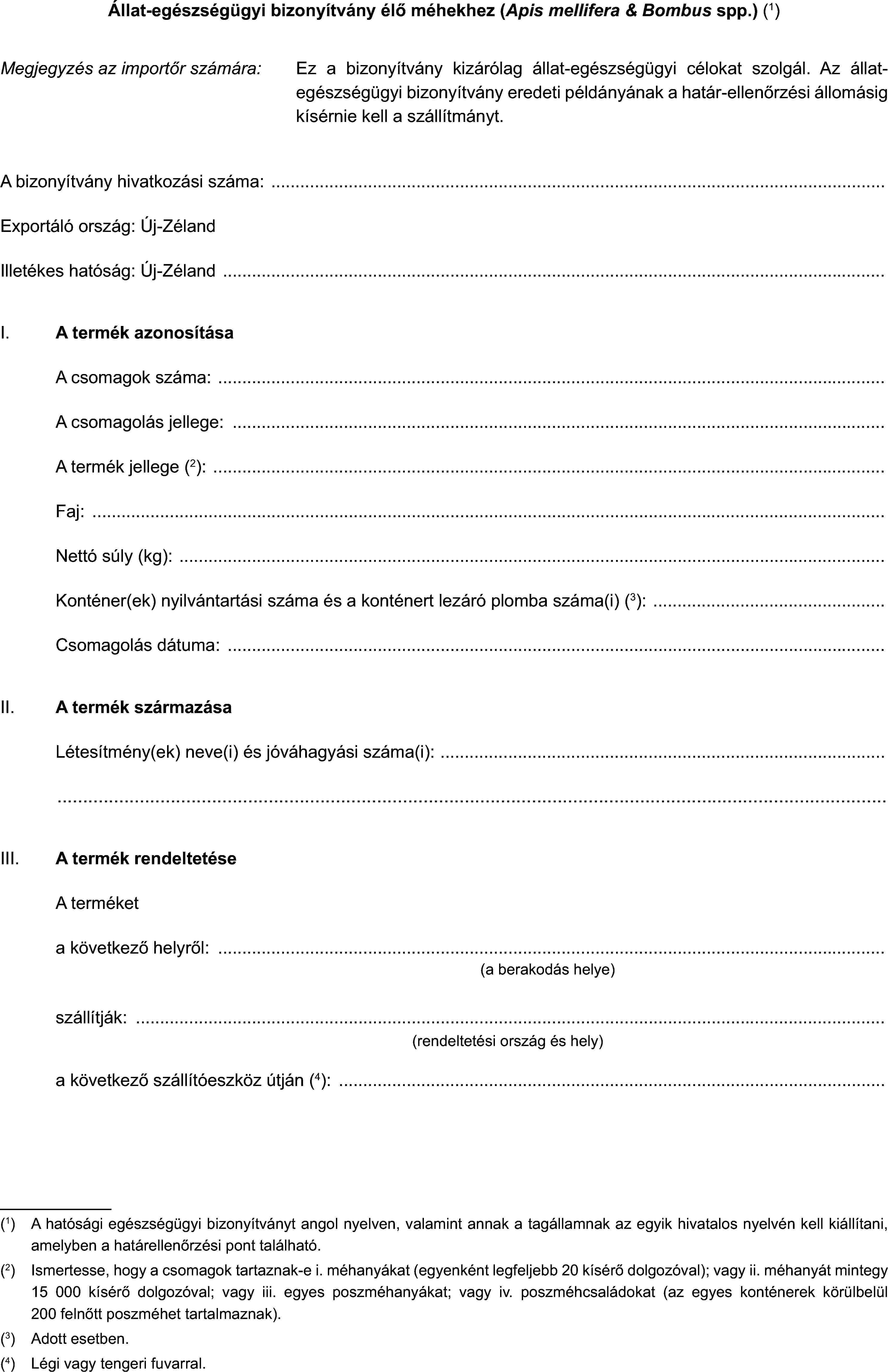 A behozatali engedély egy példányát csatolni kell az aláírt új-zélandi egészségügyi bizonyítványhoz; ezen a példányon fel kell tüntetni a következő szöveget: »az eredeti hiteles másolata«, és azt a tanúsító tisztviselőnek alá kell írnia.