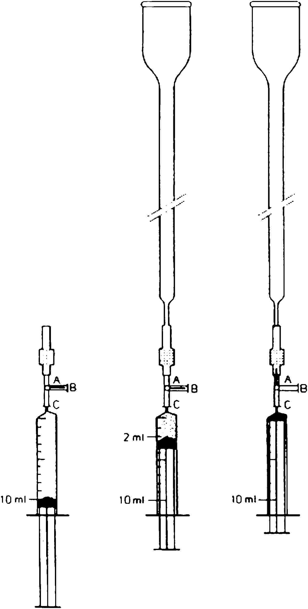 Csatlakoztassunk egy zárósapkát (4.18.) a C18-készlet rövidebb végére (3,10) (lásd az 1. ábrát). Töltsük fel a készletet és távolítsunk el minden levegőt a zárósapkán 10 ml metil-alkohol gyors átfecskendezésével (4.19.). A készletben az egyébként szürke háttér előtt a légbuborékok világos pettyekként láthatók. Vegyünk 10 ml vizet és 8 ml-t nyomjunk át a készleten. (Kerüljük a levegő készletbe történő bejutását, amikor a metil-alkoholról vízre váltunk.) Csatlakoztassuk a készlet hosszabb szárát az üvegoszlophoz (4.17.), és a maradék 2 ml vizet fecskendezzük be az oszlopba a készleten keresztül. Zárjuk a zárósapkát. Húzzuk ki a fecskendőt.
