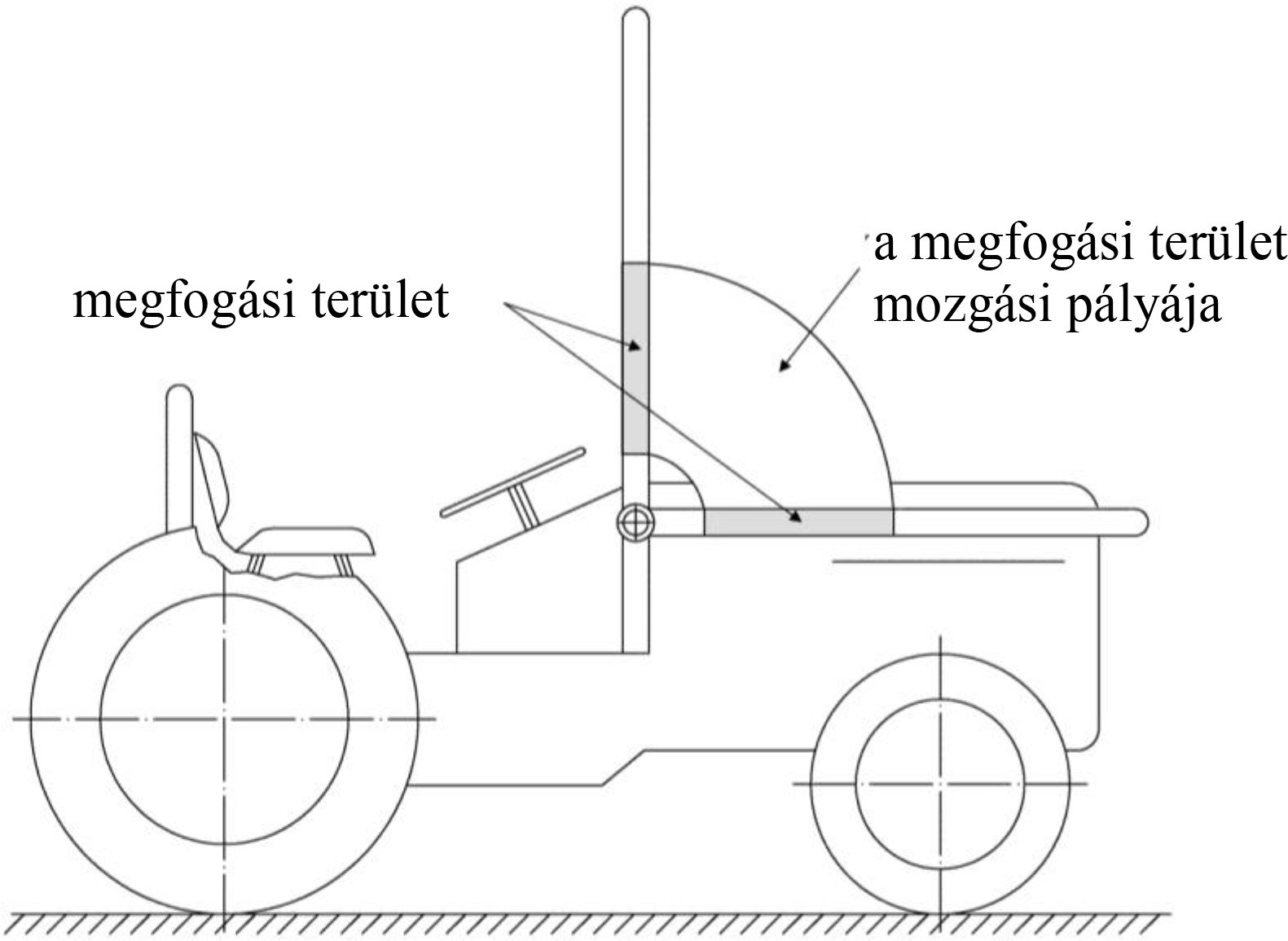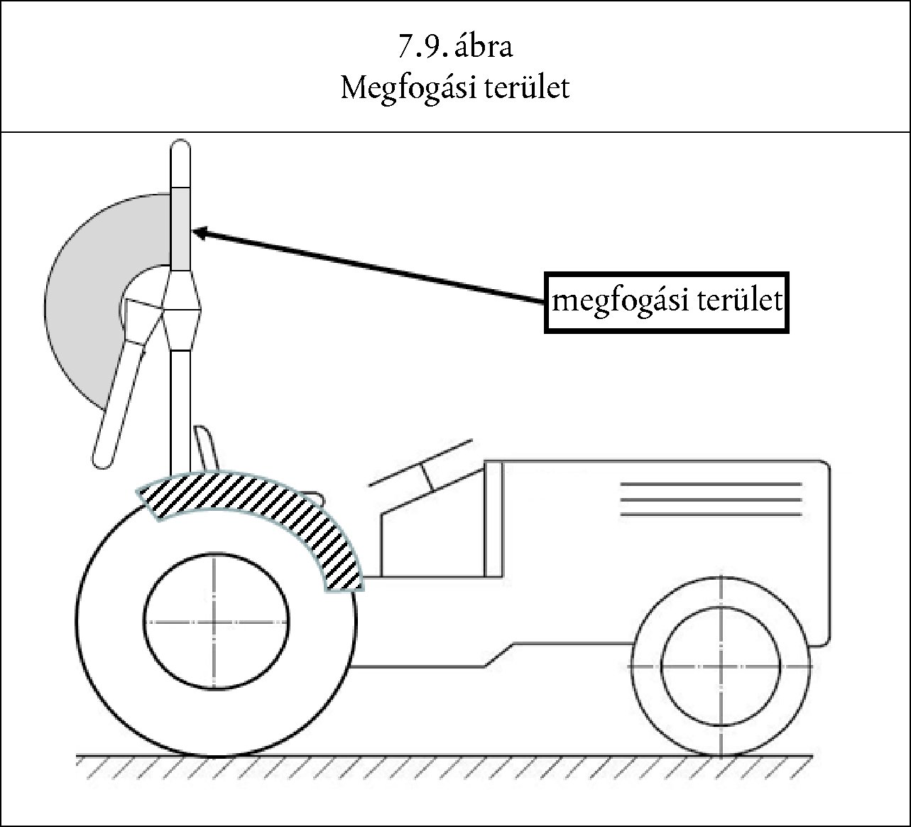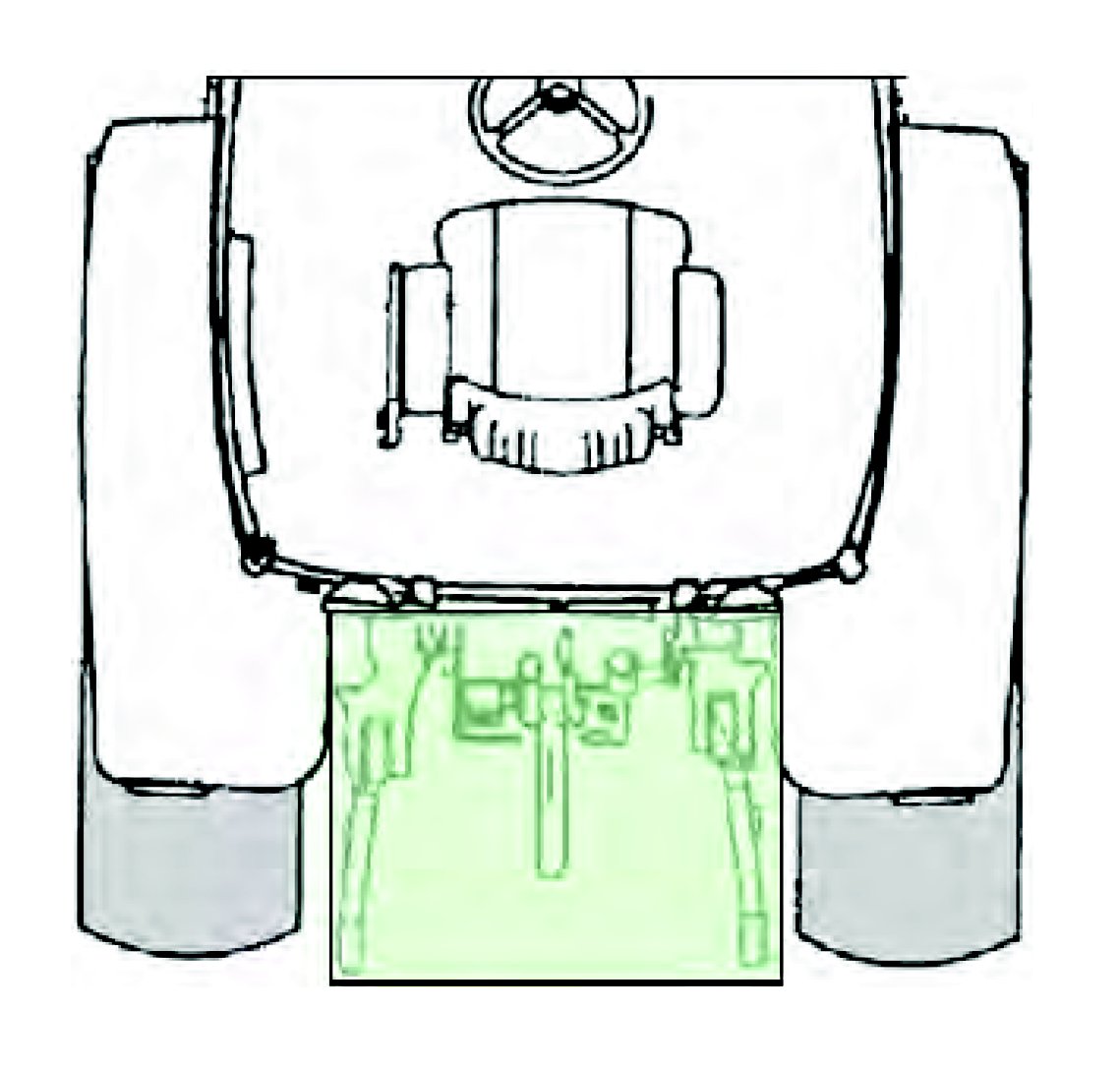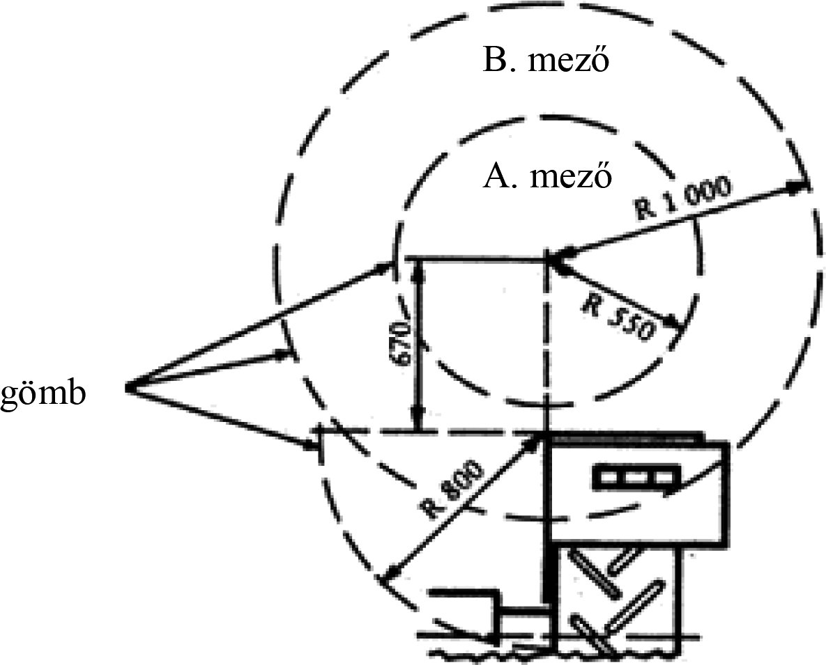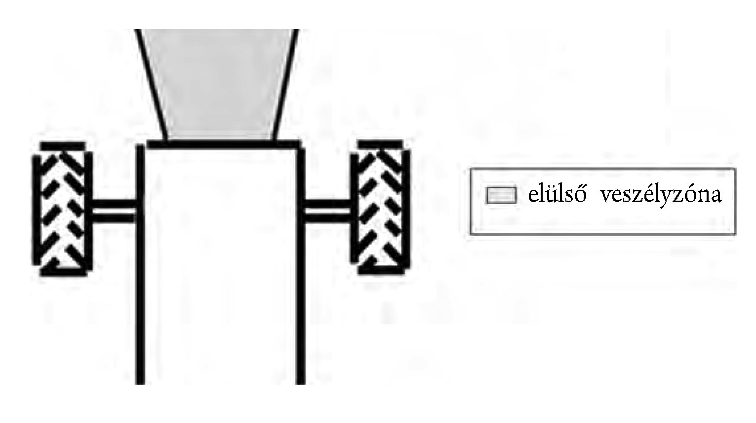 A hárompontos felfüggesztés hidraulikus emelőberendezés, a mellékhajtás és a távoli szelep külső kezelőszerve(i) helyének elülső veszélyzónája felülnézetben, az elülső veszélyzóna az egyenlőszárú trapéz terület, amelynek ferde oldalai a hárompontos felfüggesztés emelő-berendezésének karjai: a rövidebb alap a traktortest első részének vetülete, a hosszabb alap pedig a hárompontos felfüggesztés emelőberendezése karjainak végein áthaladó vonal.