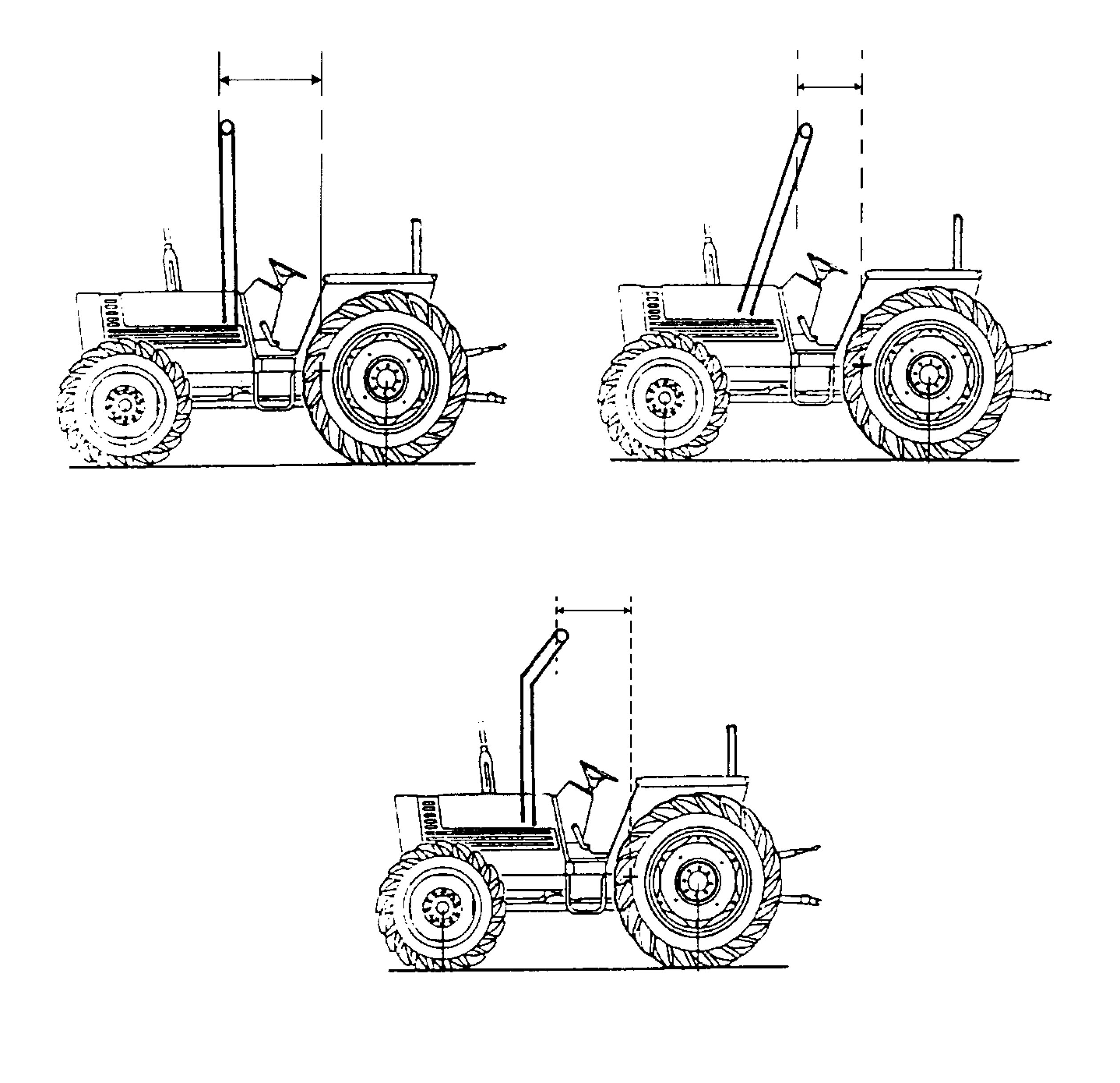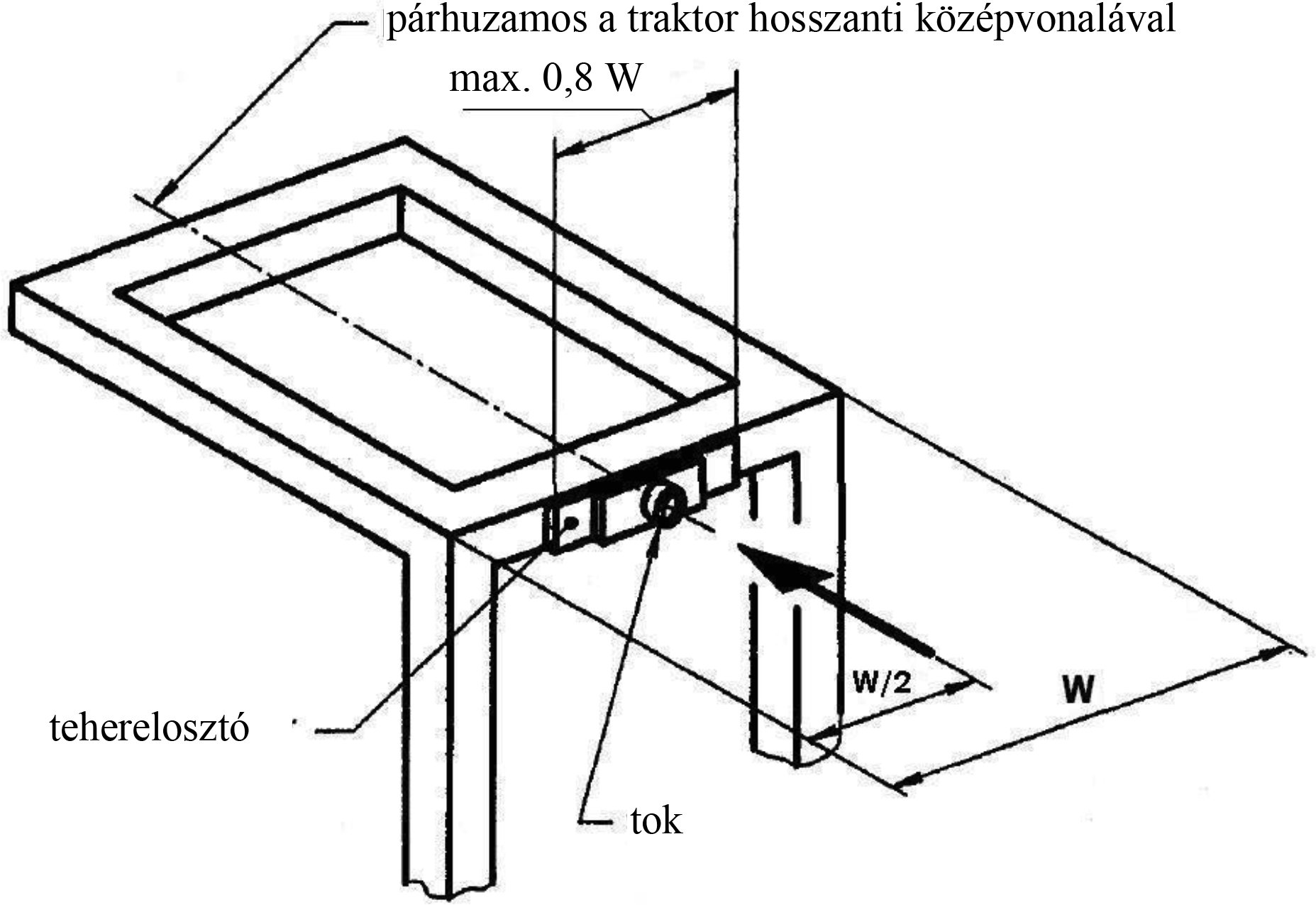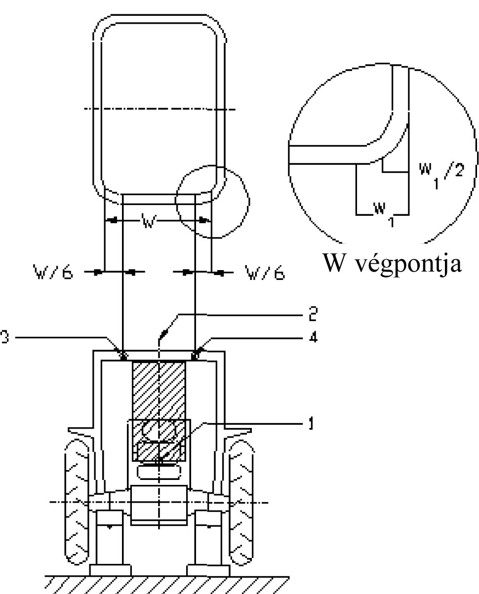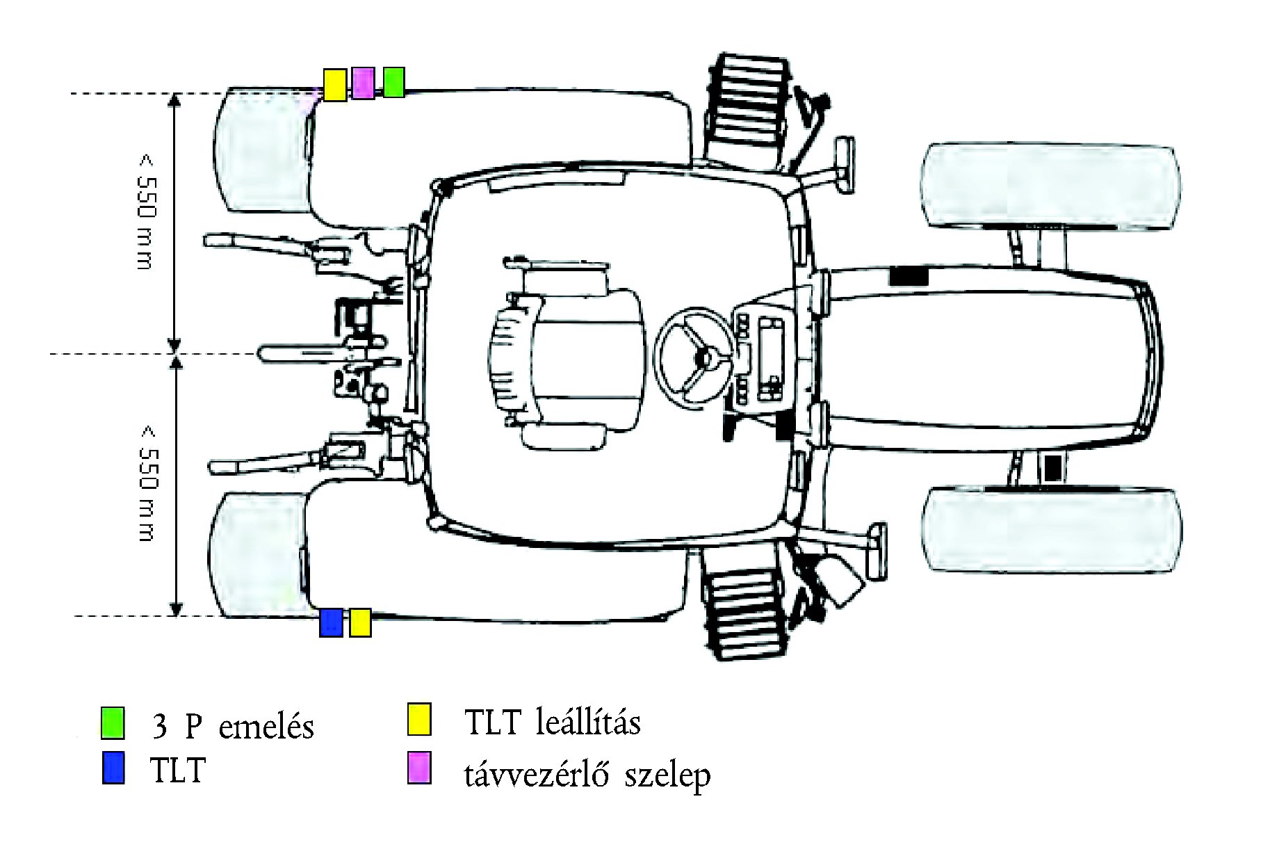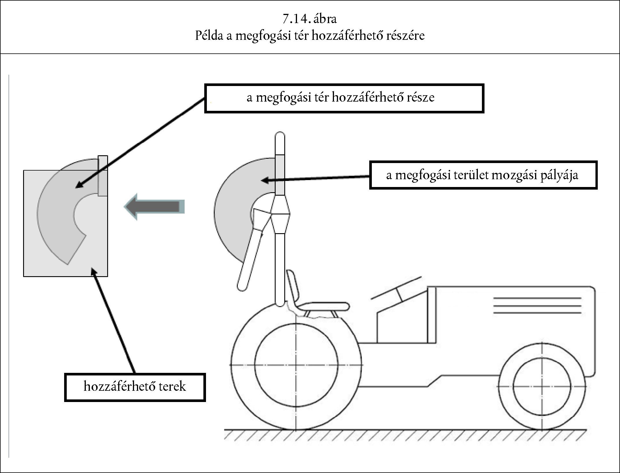 A hárompontos felfüggesztés hidraulikus emelőberendezés, a mellékhajtás és a távoli szelep külső kezelőszerve(i) helyének elülső veszélyzónája felülnézetben, az elülső veszélyzóna az egyenlőszárú trapéz terület, amelynek ferde oldalai a hárompontos felfüggesztés emelő-berendezésének karjai: a rövidebb alap a traktortest első részének vetülete, a hosszabb alap pedig a hárompontos felfüggesztés emelőberendezése karjainak végein áthaladó vonal.