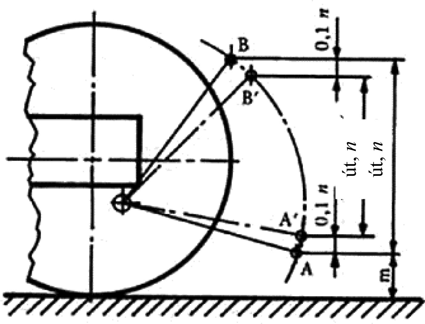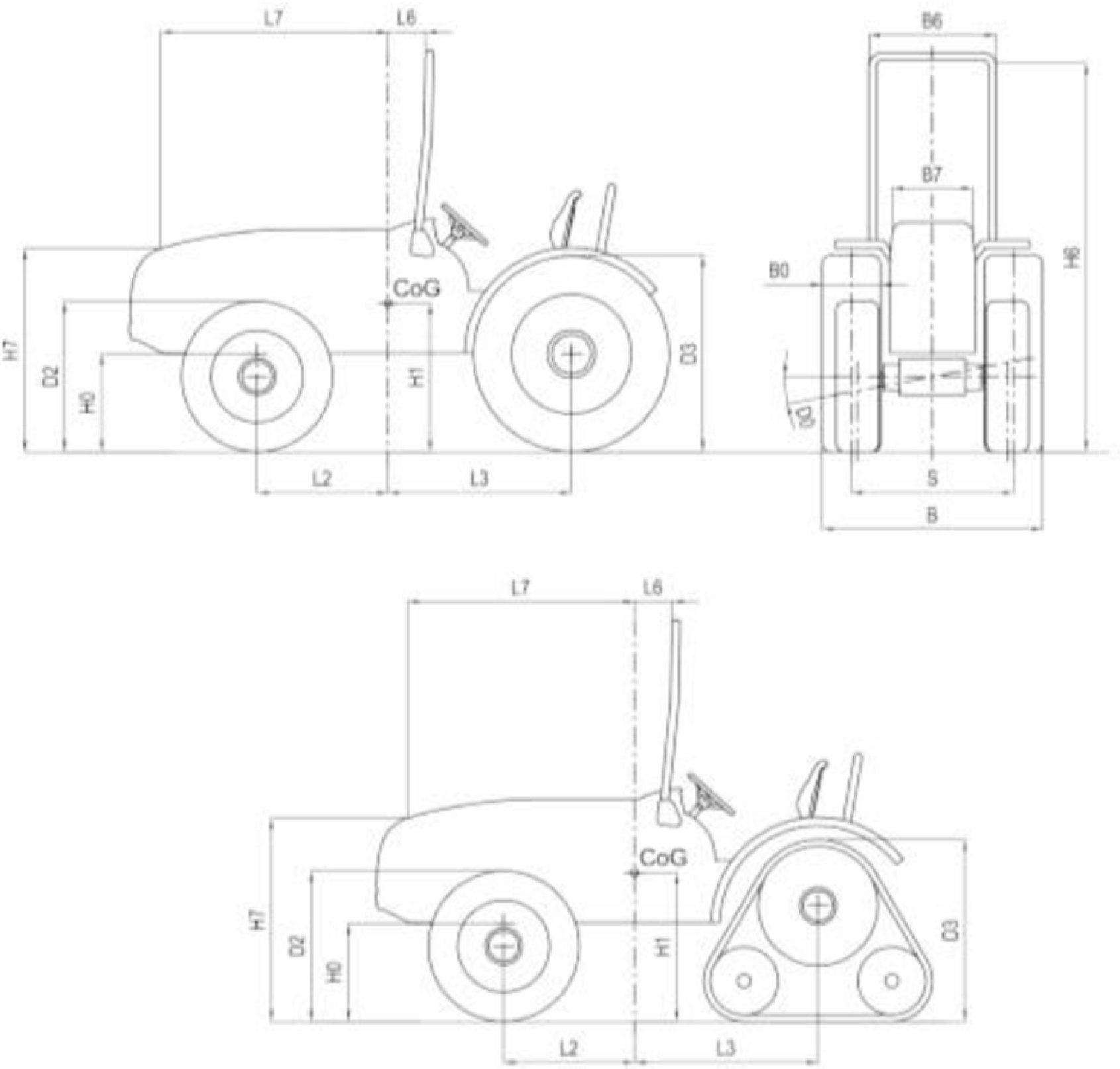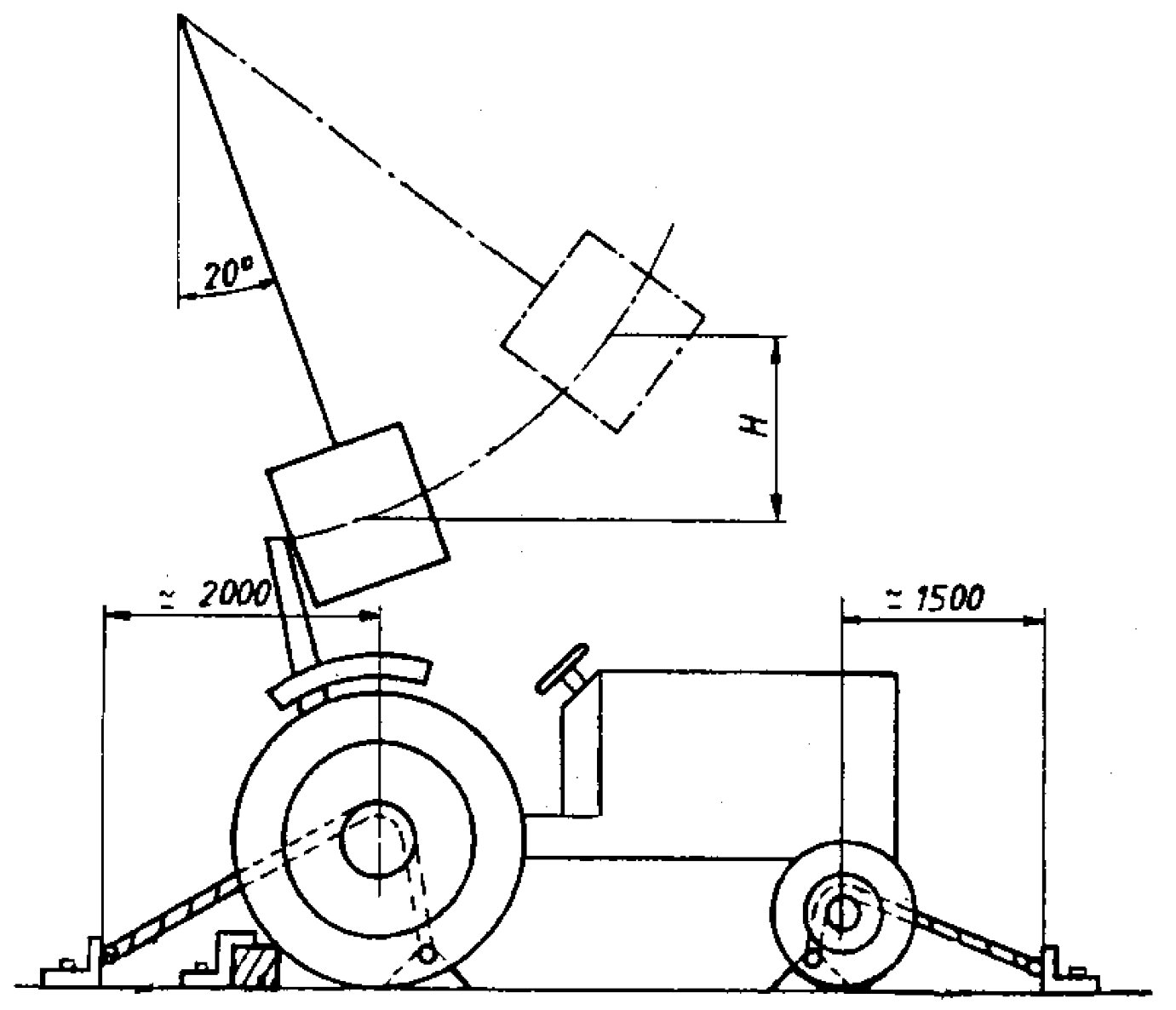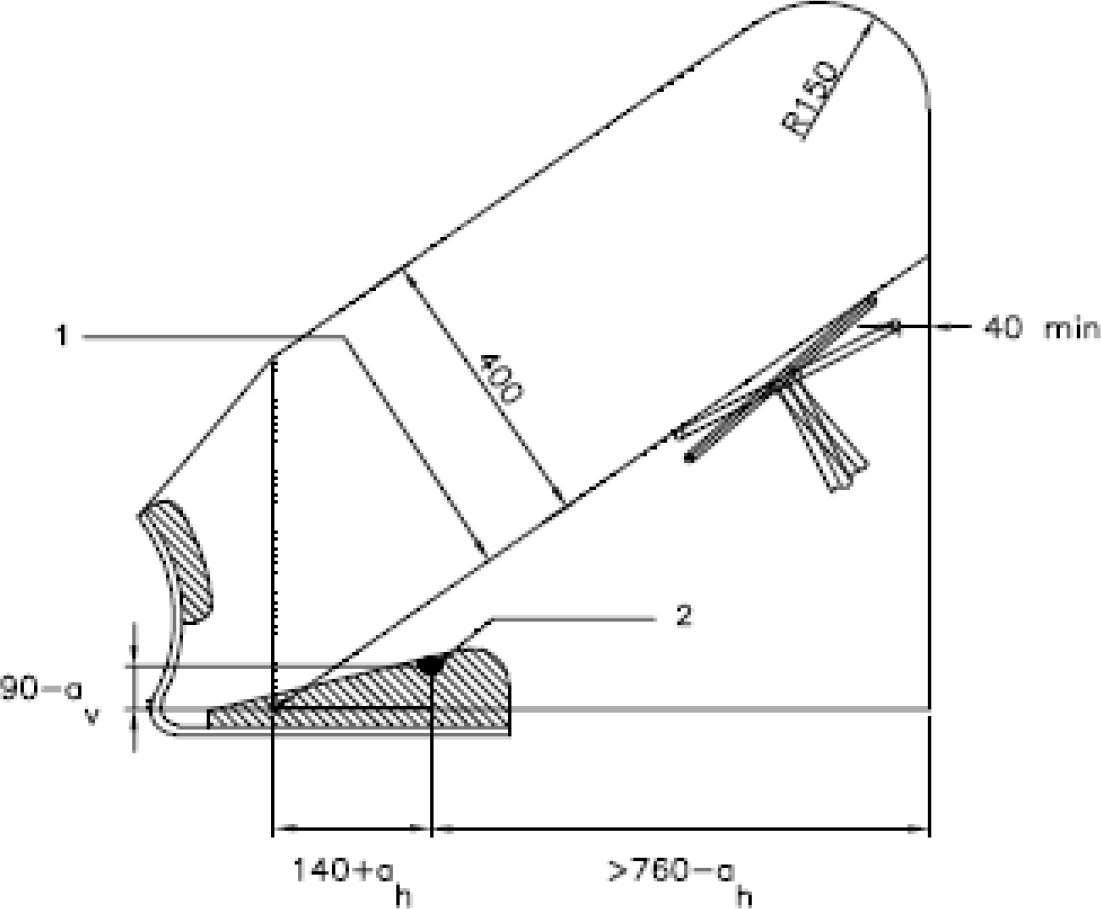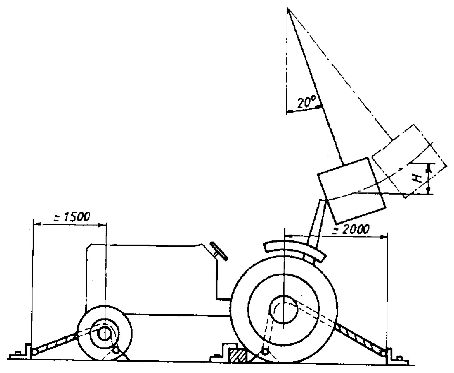 A hárompontos felfüggesztés hidraulikus emelőberendezés, a mellékhajtás és a távoli szelep külső kezelőszerve(i) helyének elülső veszélyzónája felülnézetben, az elülső veszélyzóna az egyenlőszárú trapéz terület, amelynek ferde oldalai a hárompontos felfüggesztés emelő-berendezésének karjai: a rövidebb alap a traktortest első részének vetülete, a hosszabb alap pedig a hárompontos felfüggesztés emelőberendezése karjainak végein áthaladó vonal.