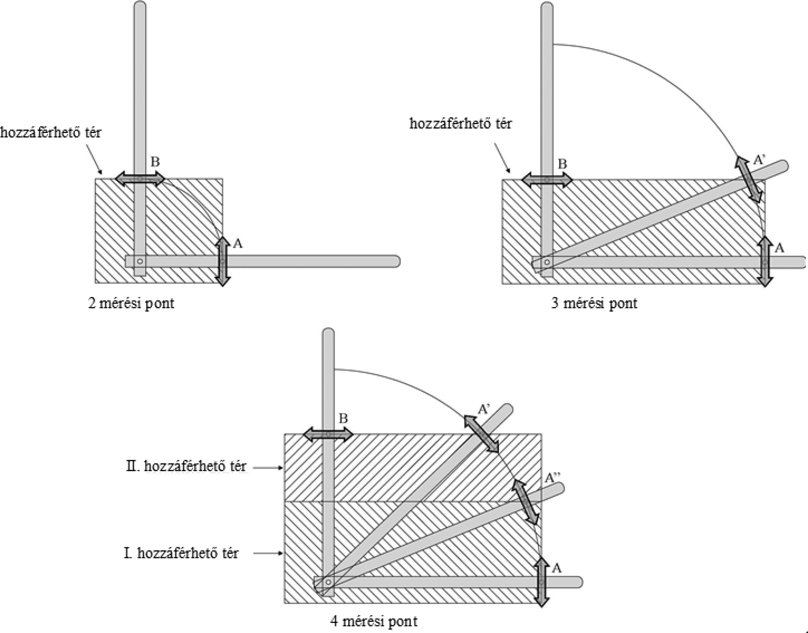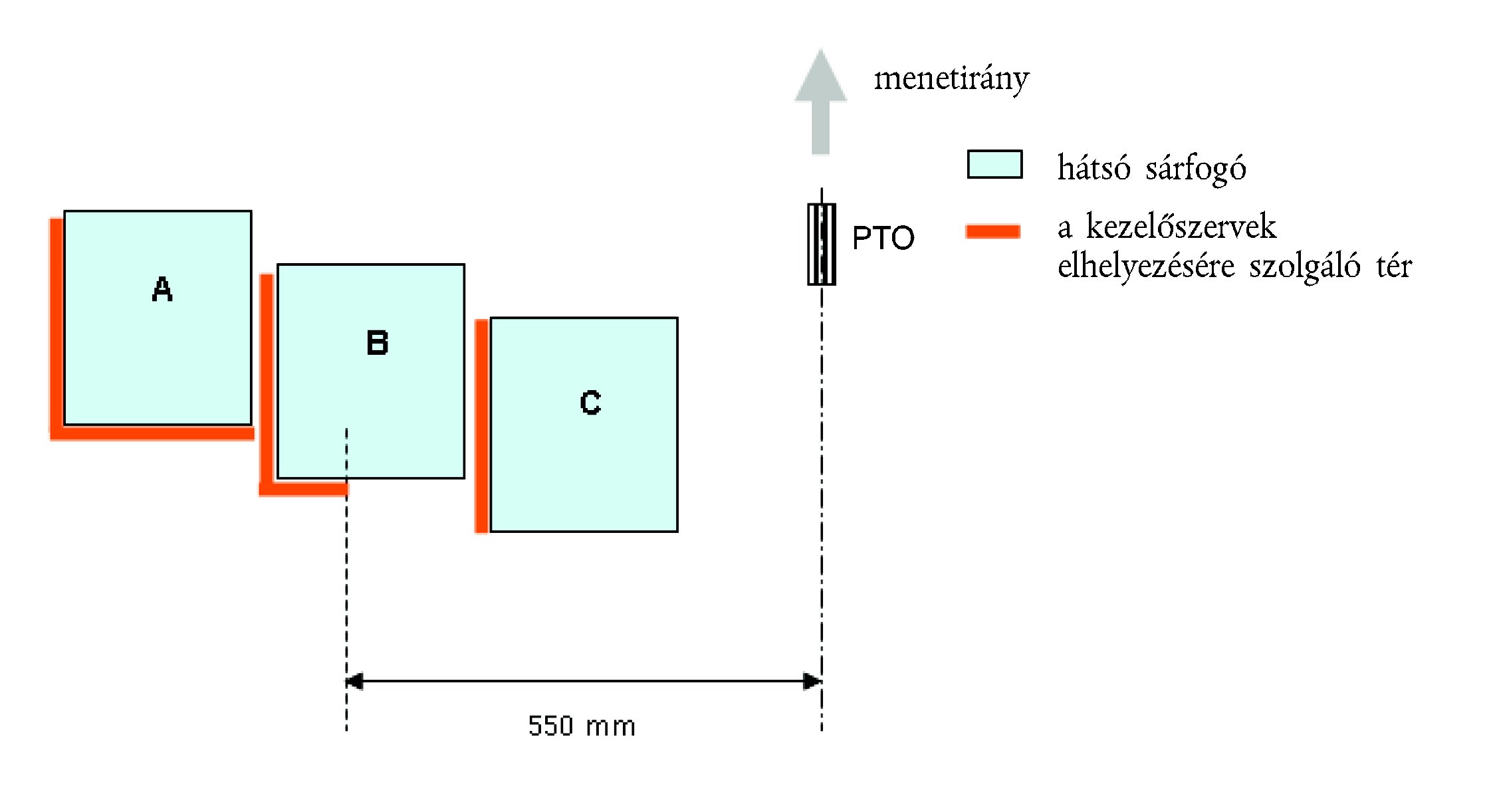A hárompontos felfüggesztés hidraulikus emelőberendezés, a mellékhajtás és a távoli szelep külső kezelőszerve(i) helyének hátulsó veszélyzónája (három lehetséges hely: A, B vagy C)