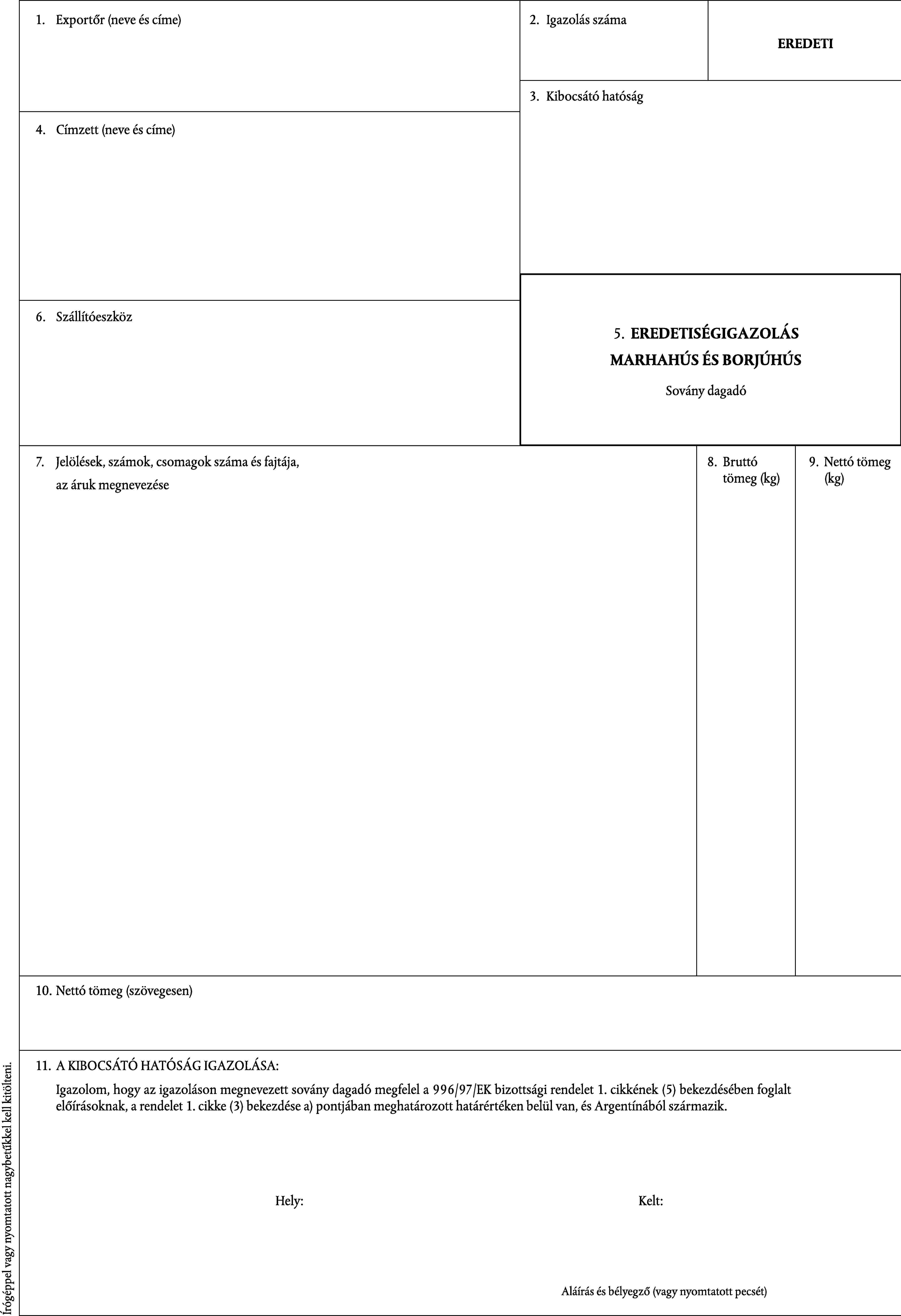 (1) Az Argentína által kibocsátandó eredetiségigazolást egy eredeti és legalább egy másolati példányban kell kiállítani az I. mellékletben bemutatott mintának megfelelő formanyomtatványon.