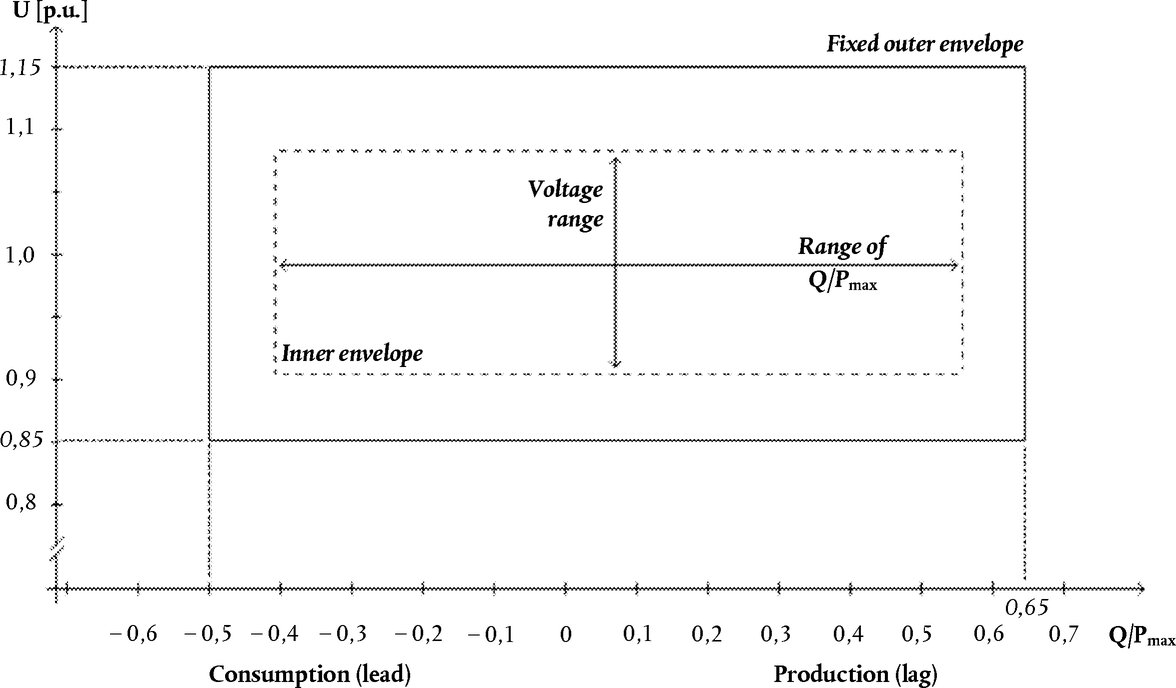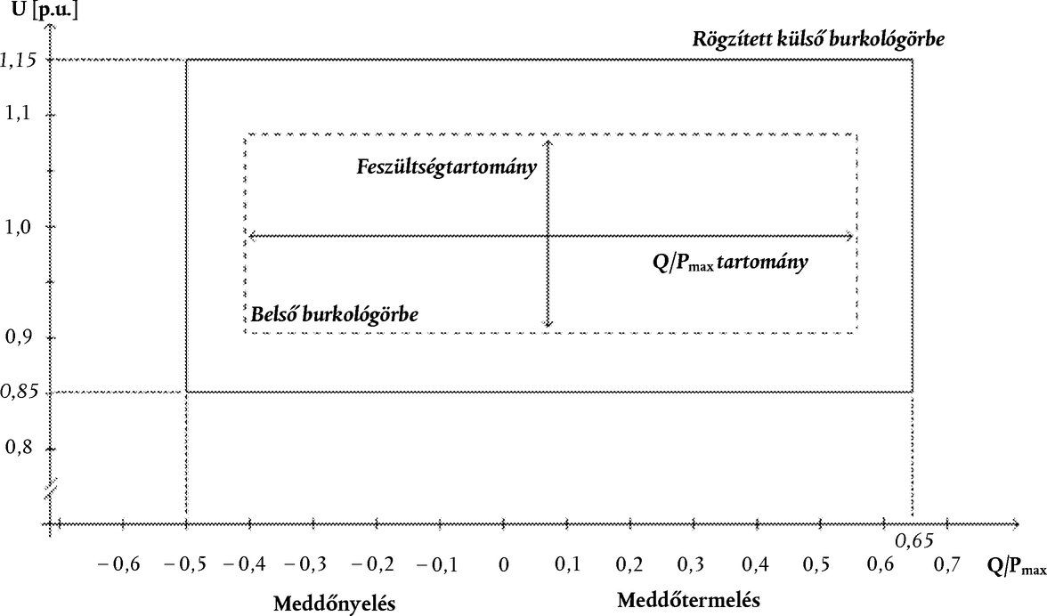 5. ábra: A diagram az U-Q/Pmax-profil határait jelöli, ahol U a csatlakozási pontoknál mért, a tényleges értékének és az egységnyinek tekintett (1 pu) referenciaértékének arányában kifejezett feszültség, Q/Pmax pedig a meddőteljesítmény és a maximális nagyfeszültségű egyenáramú hatásosteljesítmény-átviteli képesség aránya. A belső burkoló görbe pozíciója, mérete és formája csak tájékoztató jellegű, és nem téglalap alakú formák is használhatók a belső burkon belül. A nem téglalap alakú profilformák tekintetében a feszültségtartomány a legmagasabb és legalacsonyabb feszültségpontokat jelöli e formában. Az ilyen profil nem teszi elérhetővé a teljes meddőteljesítmény-tartományt a statikus feszültség teljes tartományában.