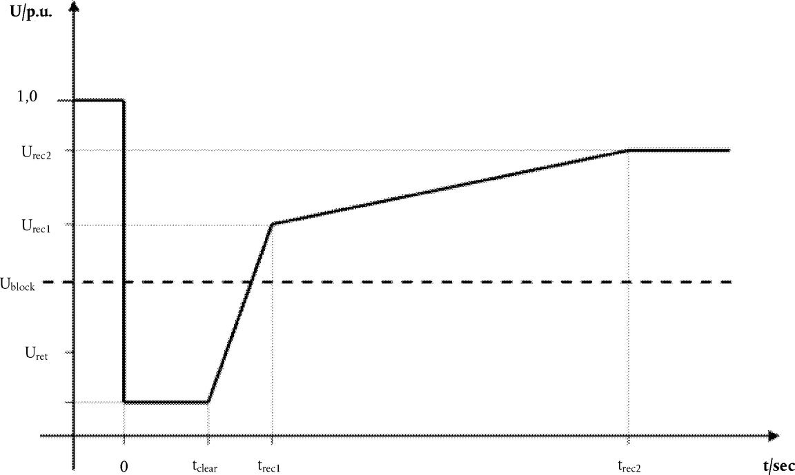 6. ábra: A nagyfeszültségű egyenáramú átalakító állomás zárlati áthidalóképesség profilja. Az ábrán a csatlakozási pontnál fennálló feszültség-idő profil alsó határértéke látható a tényleges értékének és az egységnyinek tekintett (1 pu) referenciaértékének arányában kifejezve, zárlat előtt, alatt és után. Uret a zárlat alatt a csatlakozási pontnál fenntartott feszültség, tclear a zárlat elhárításának pillanata, Urec1 és trec1 pedig a zárlat elhárítása után a feszültség helyreállása alsó határértékeinek pontját határozzák meg. Ublock a csatlakozási pontnál mért blokkoló feszültség. A hivatkozott időértékek tfault-tól számítandók.