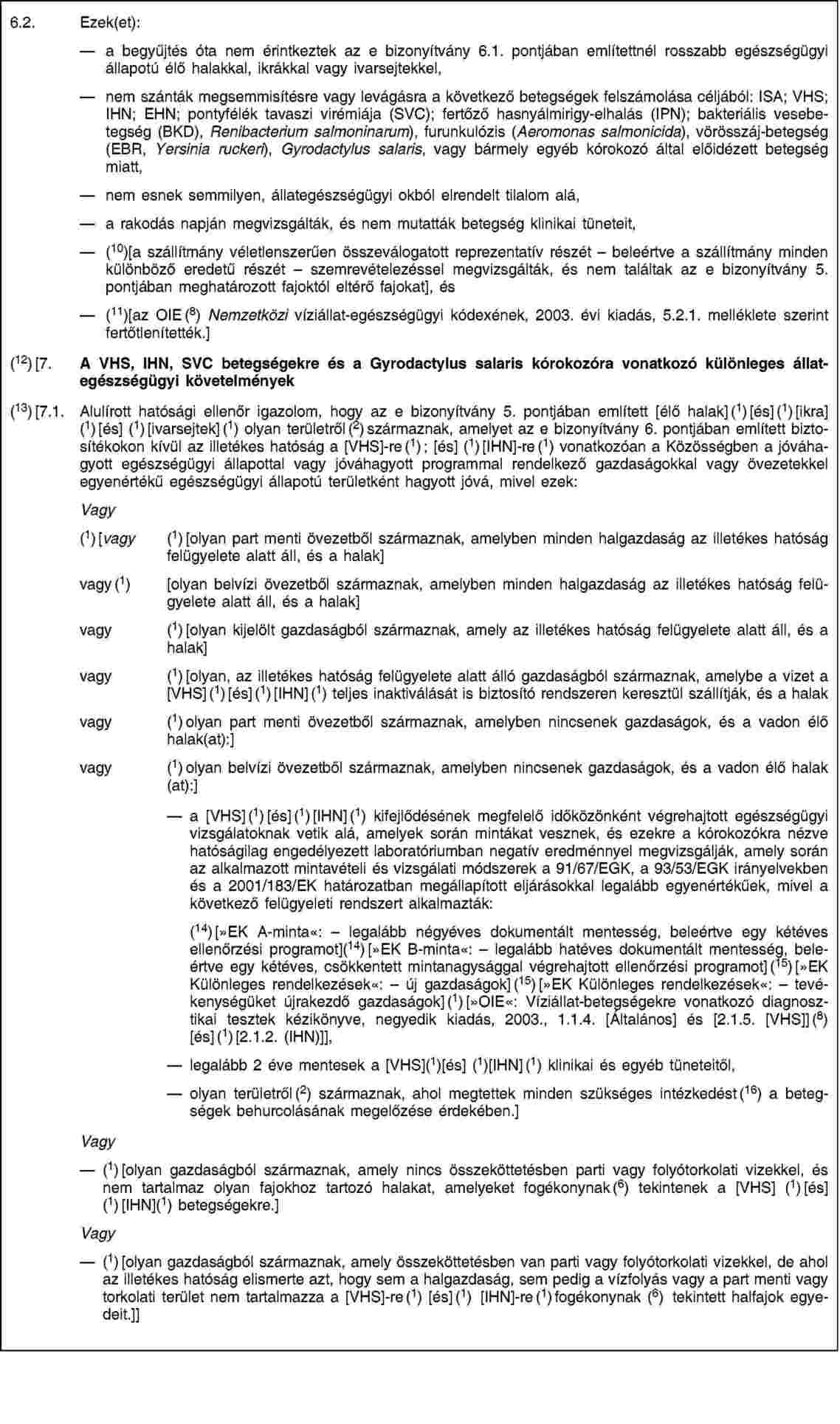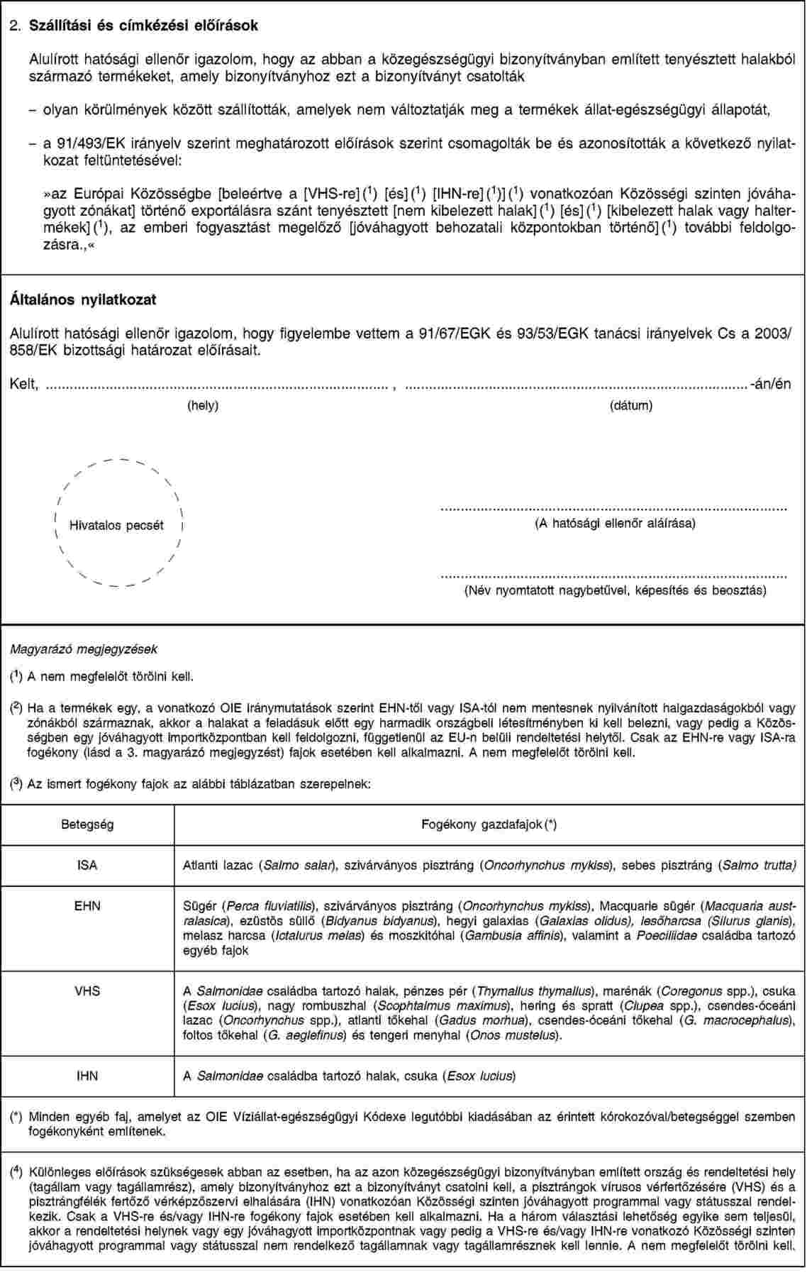 b) Figyelembe véve az érintett EK-tagállamban lévő rendeltetési helynek a pisztrángok vírusos vérfertőzésére (VHS), a pisztrángfélék fertőző vérképzőszervi elhalására (IHN), pontyfélék tavaszi virémiájára (SVC) és Gyrodactylus salaris (G. salaris) kórokozóra vonatkozóan fennálló egészségügyi állapotát, a megfelelő különleges kiegészítő követelményeket fel kell venni és ki kell tölteni a bizonyítványban.