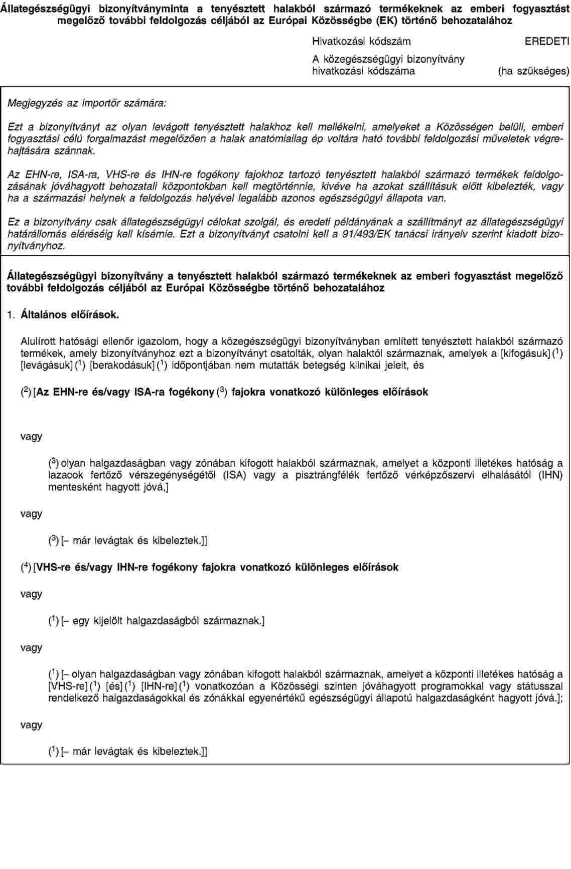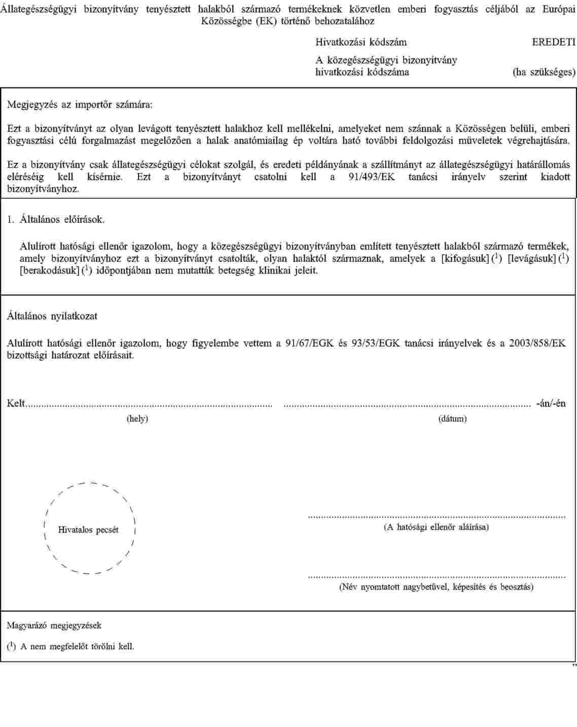 e) Az élő halak, azok ikrái és ivarsejtei számára kiadott bizonyítvány eredeti példányát az Európai Közösségbe történő kivitele céljából történő berakodásának napján kell kiállítani. Az eredeti bizonyítványt hivatalos bélyegzővel kell ellátni, és az illetékes hatóság által kijelölt hatósági ellenőrnek alá kell írnia. Ezáltal az exportáló tagállam illetékes hatósága biztosítja azt, hogy a 96/93/EK tanácsi irányelvben megállapítottakkal egyenértékű elveket alkalmazták a bizonyítványok kiállítása során.