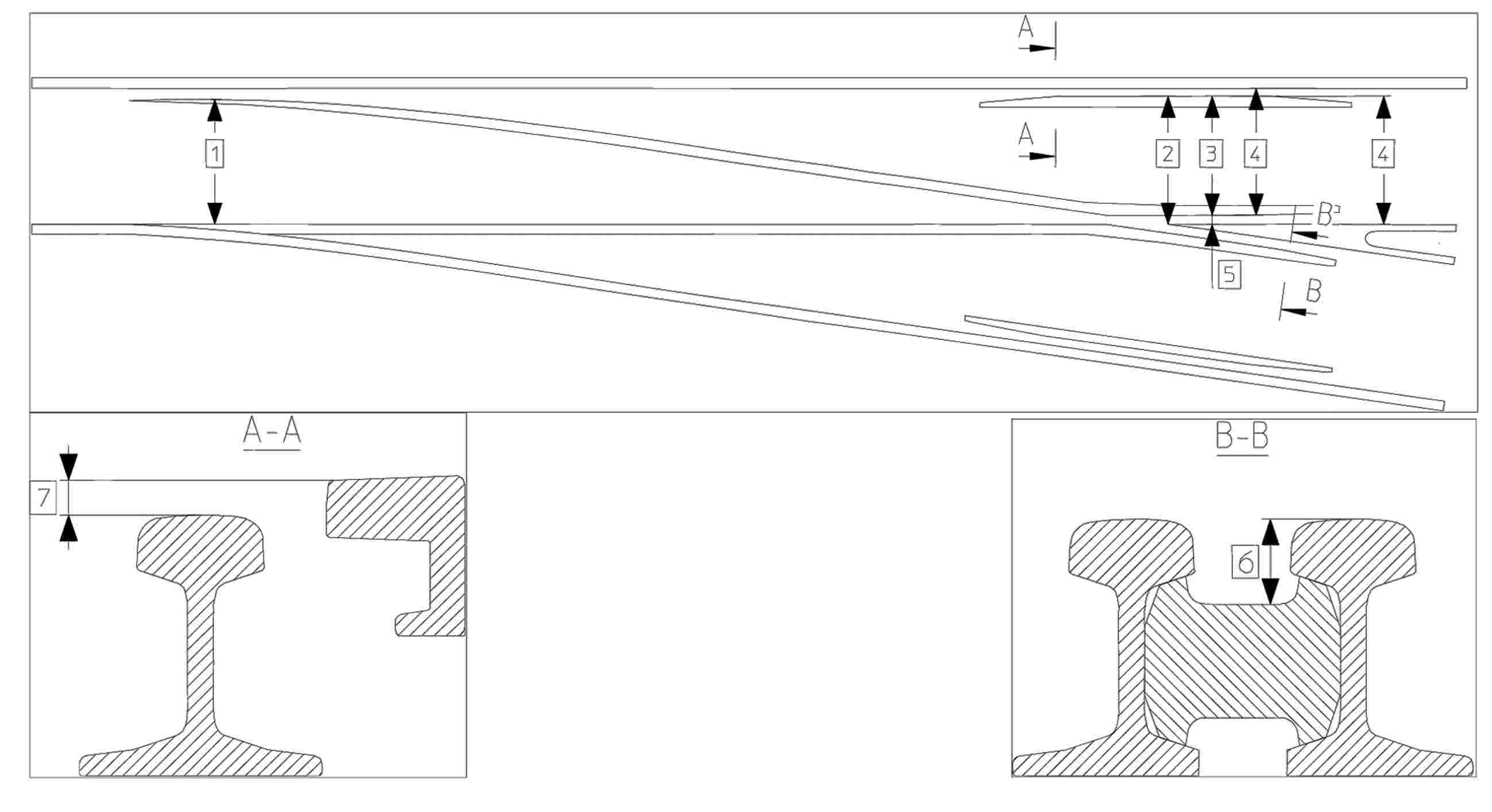Vezetéstávolság a váltókban/Free wheel passage in switches/Freier Raddurchlauf im Bereich der Zungen-vorrichtung/Côte de libre passage de l’aiguillage | 4.2.6.2. a) | Az egyik csúcssín futófelülete és szemközti vezetősín hátsó széle közötti távolság (lásd az 1. méretet az alábbi 5. ábrán). |