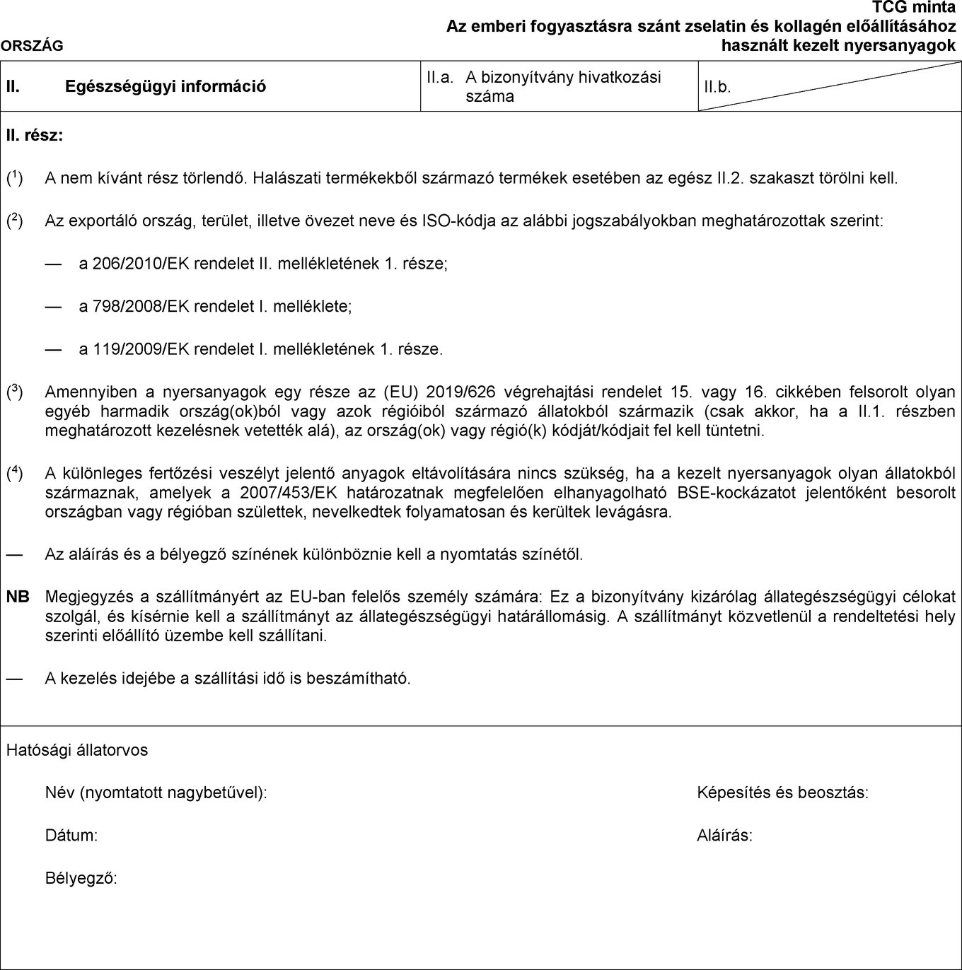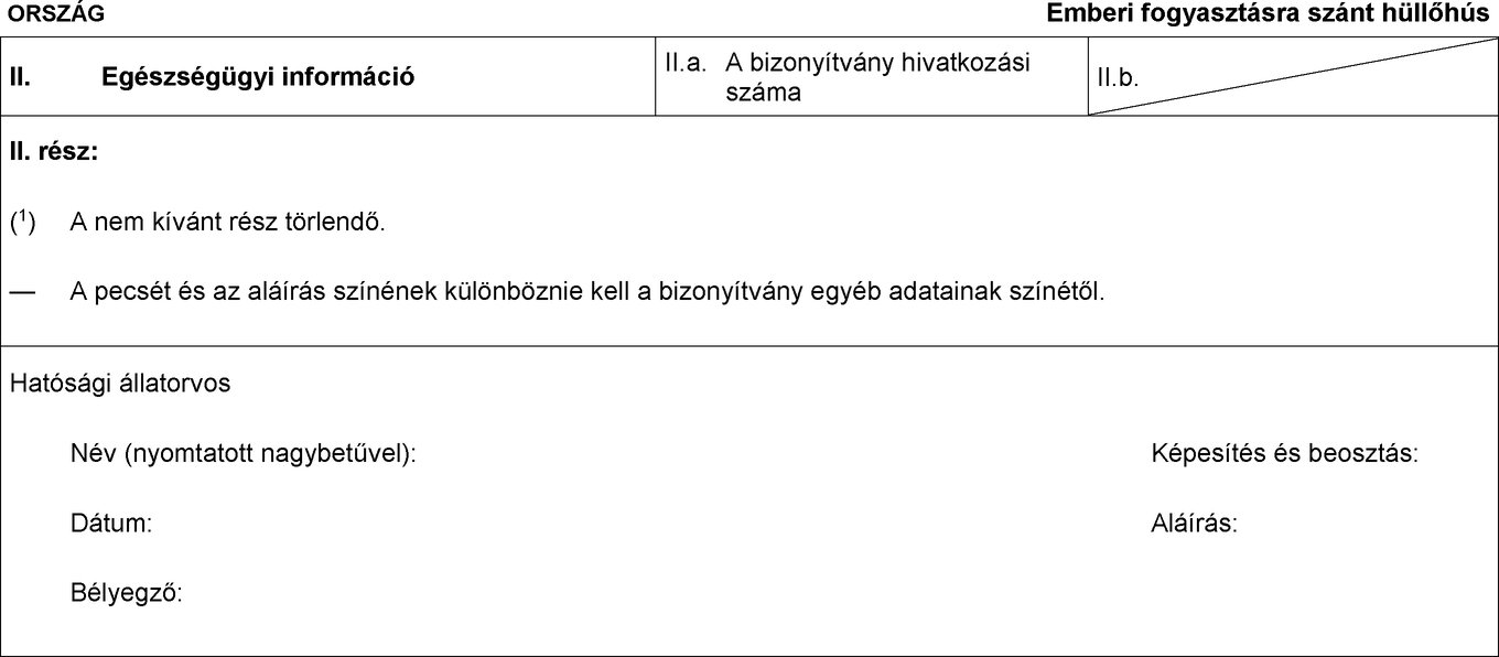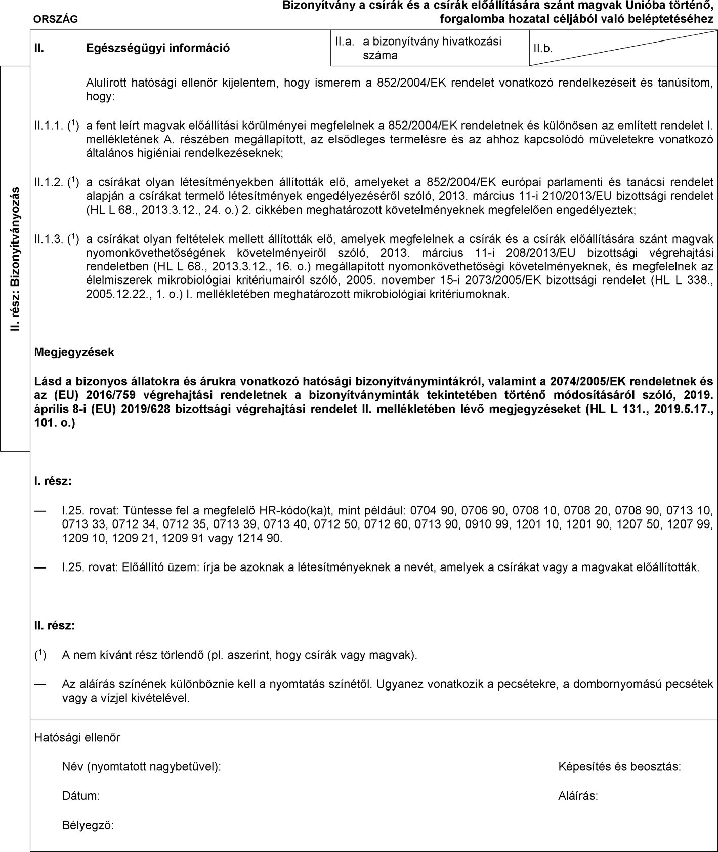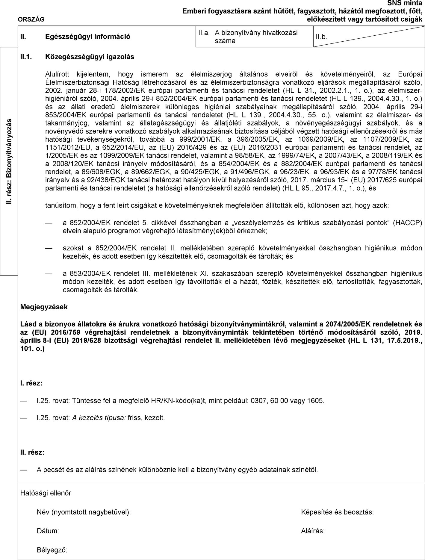 II. rész: HÍZOTT MÁJ ELŐÁLLÍTÁSÁRA SZÁNT BAROMFIRA ÉS KÉSLELTETVE ZSIGERELT BAROMFIRA VONATKOZÓ HATÓSÁGI BIZONYÍTVÁNYMINTA