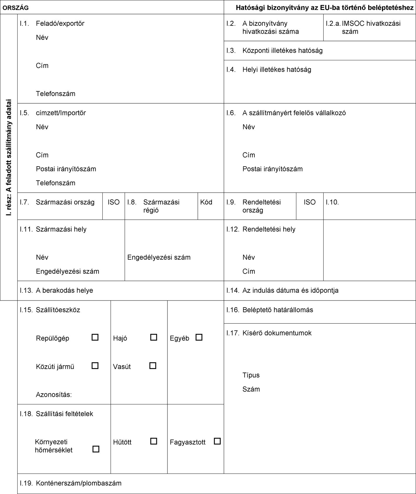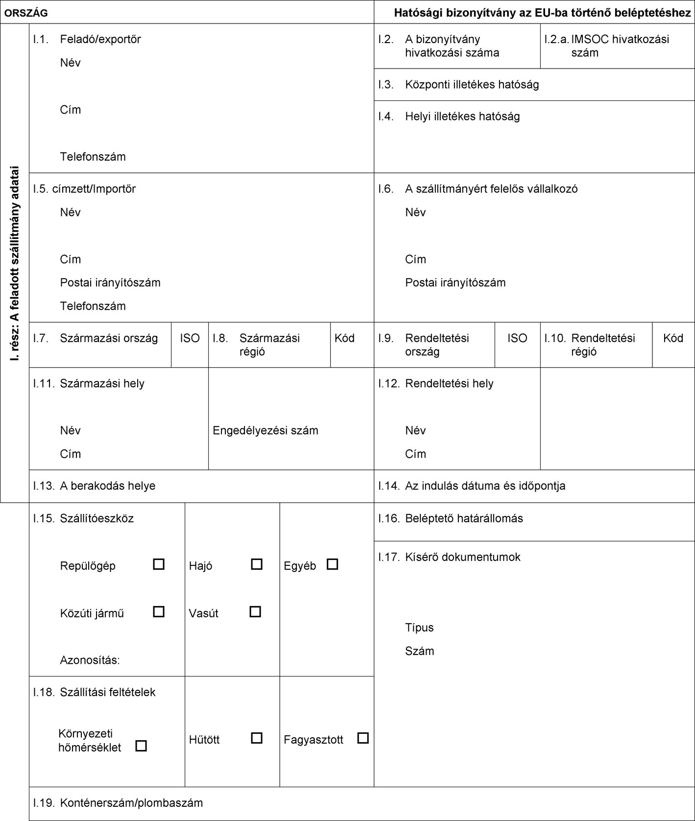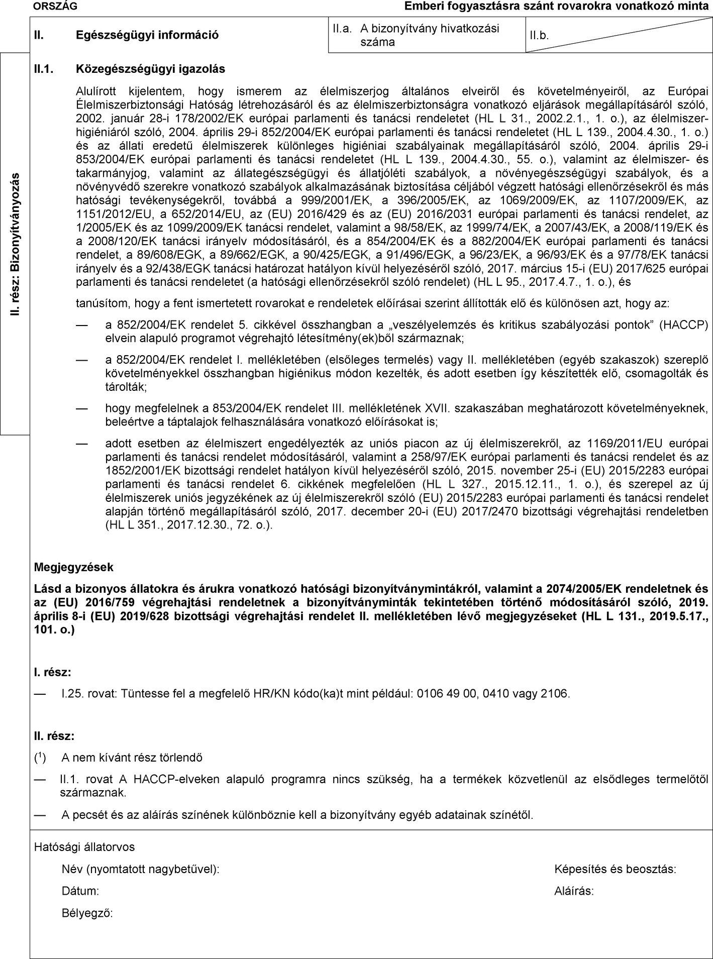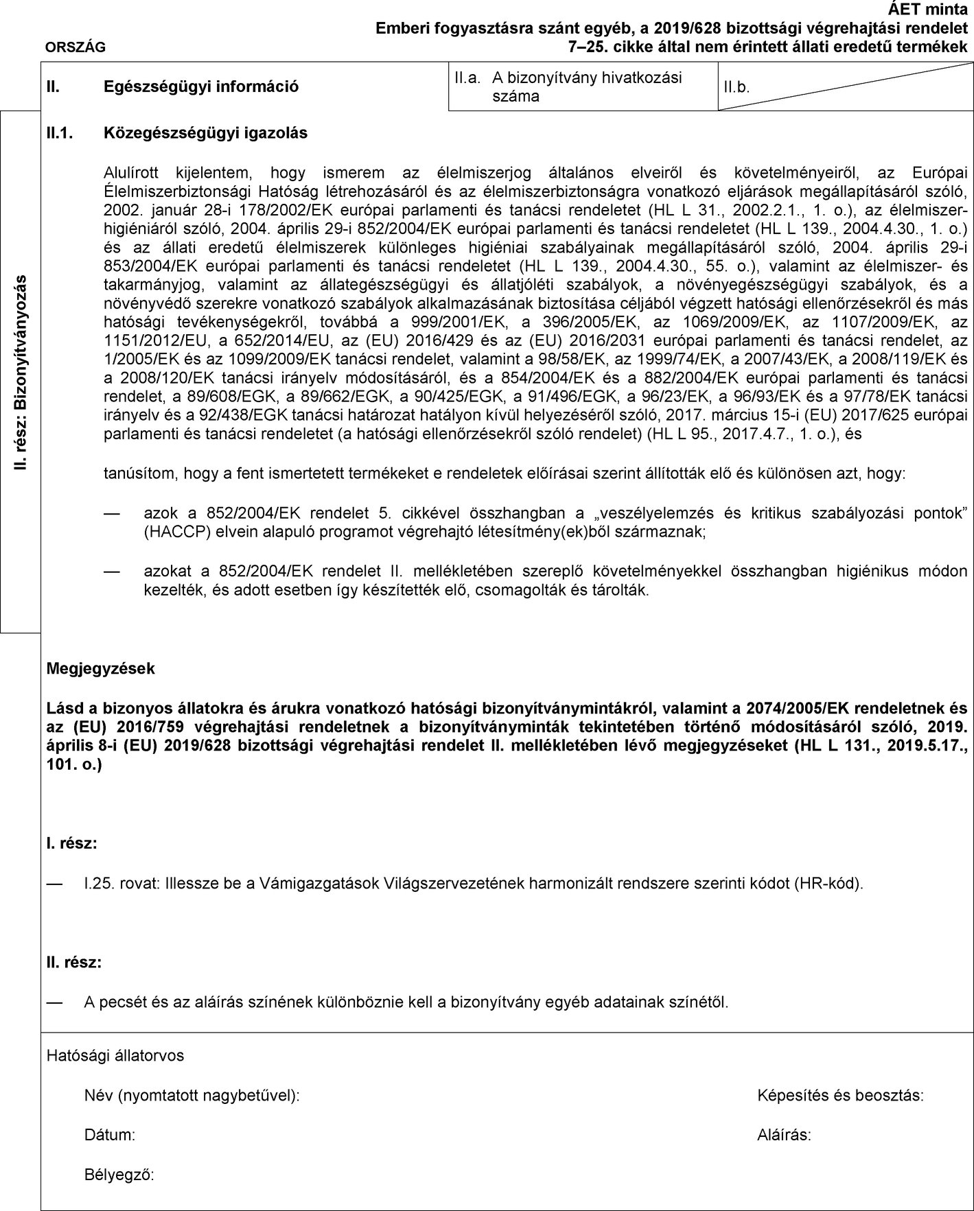 HATÓSÁGI BIZONYÍTVÁNYMINTA AZ EMBERI FOGYASZTÁSRA SZÁNT EGYÉB, AZ (EU) 2019/628 BIZOTTSÁGI VÉGREHAJTÁSI RENDELET 7-25. CIKKE ÁLTAL NEM ÉRINTETT ÁLLATI EREDETŰ TERMÉKEK UNIÓBA TÖRTÉNŐ, FORGALOMBA HOZATAL CÉLJÁBÓL VALÓ BELÉPTETÉSÉHEZ