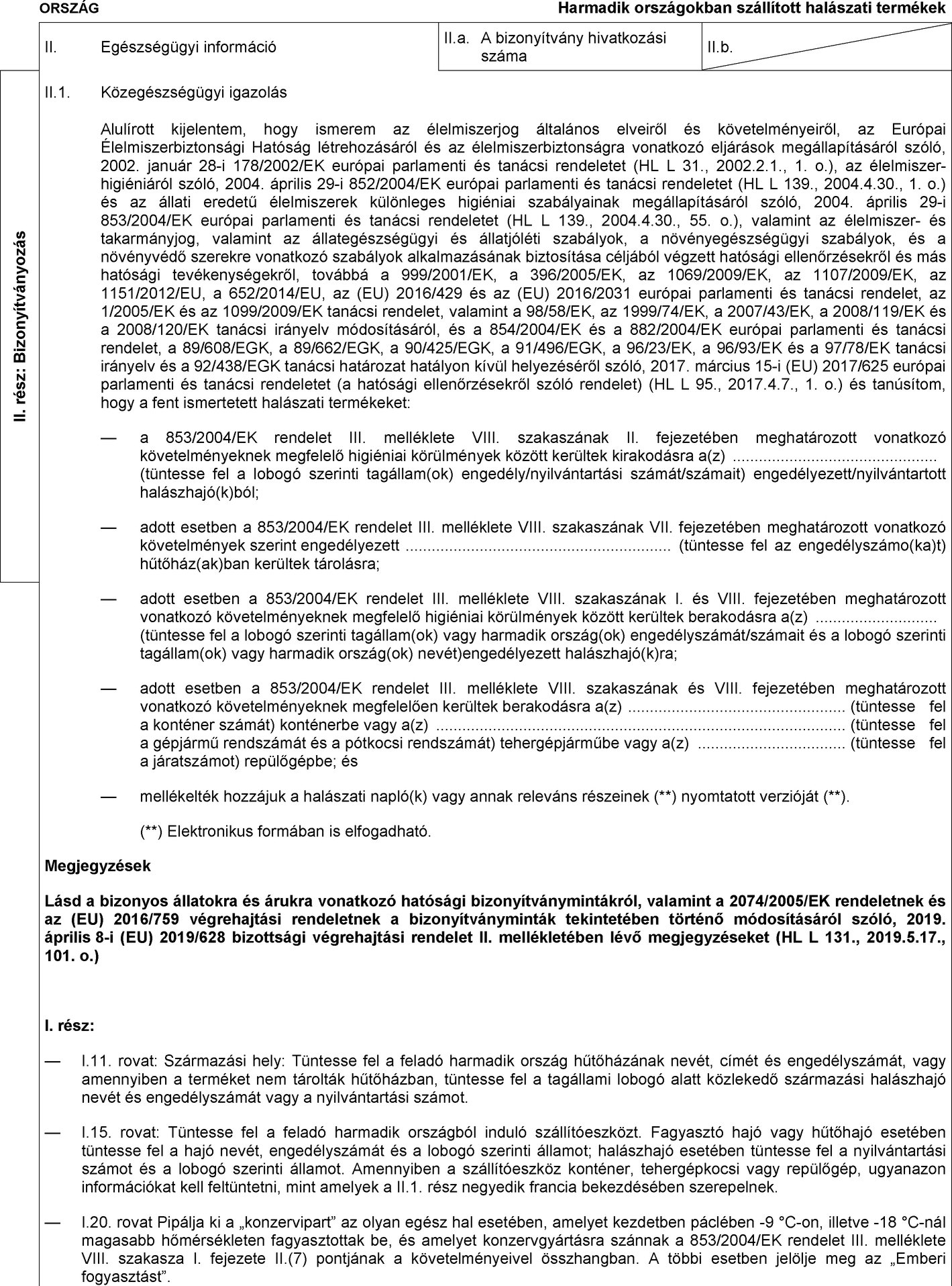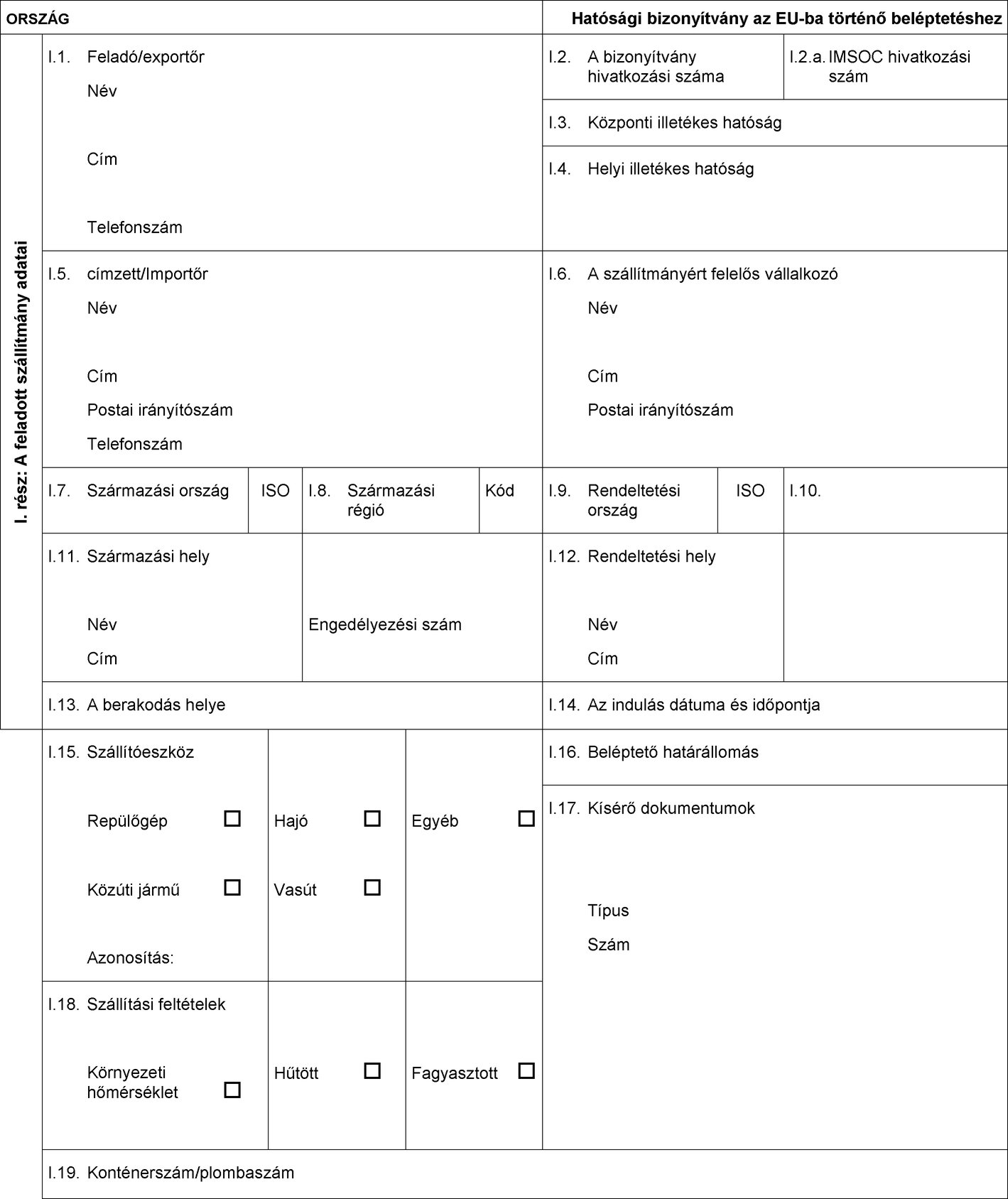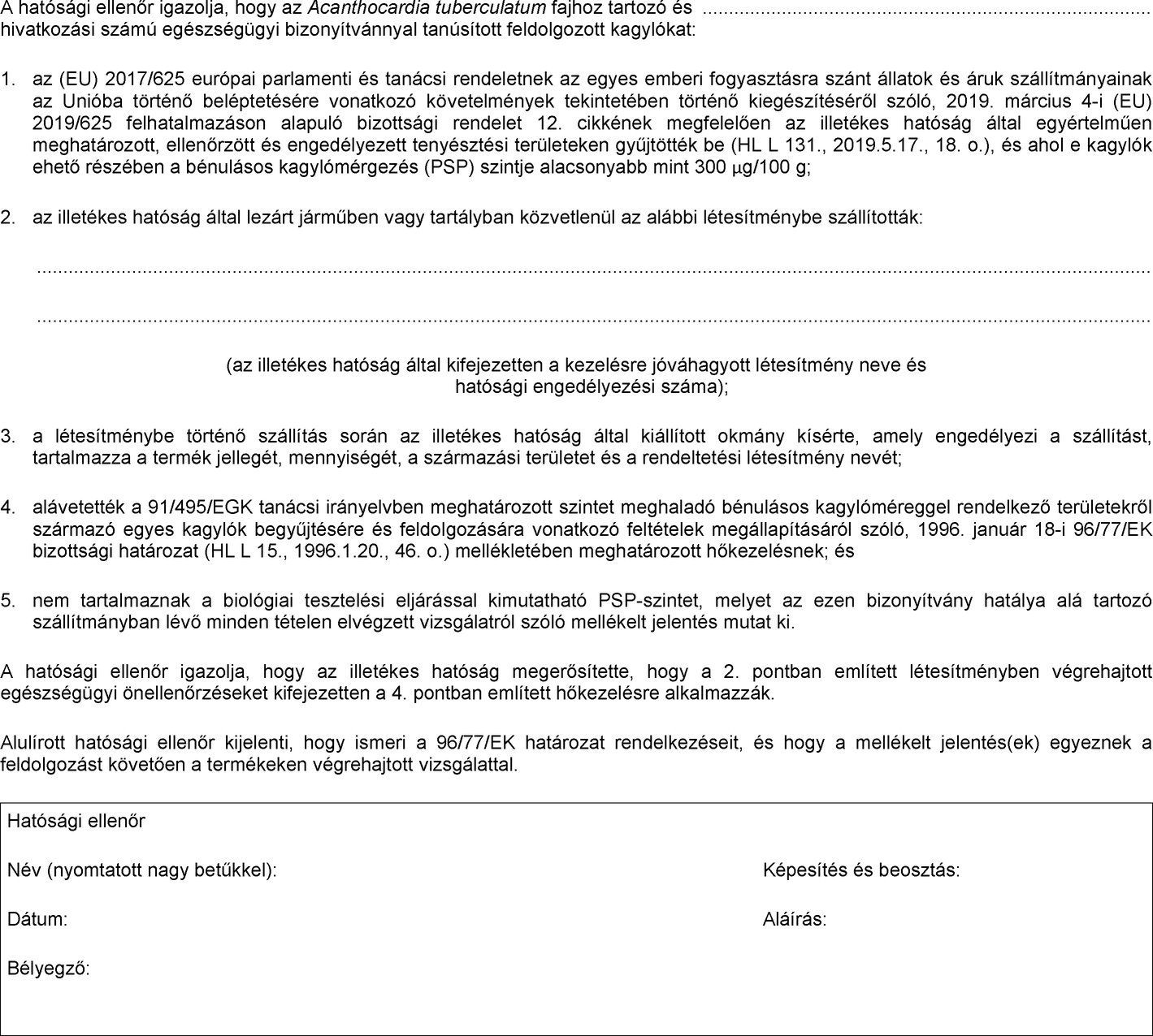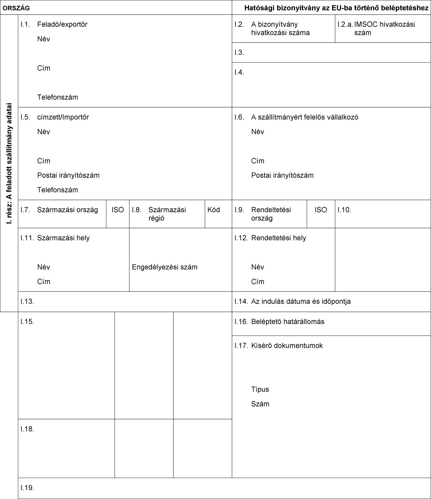 HATÓSÁGI BIZONYÍTVÁNYMINTA AZ EMBERI FOGYASZTÁSRA SZÁNT EGYÉB, AZ (EU) 2019/628 BIZOTTSÁGI VÉGREHAJTÁSI RENDELET 7-25. CIKKE ÁLTAL NEM ÉRINTETT ÁLLATI EREDETŰ TERMÉKEK UNIÓBA TÖRTÉNŐ, FORGALOMBA HOZATAL CÉLJÁBÓL VALÓ BELÉPTETÉSÉHEZ