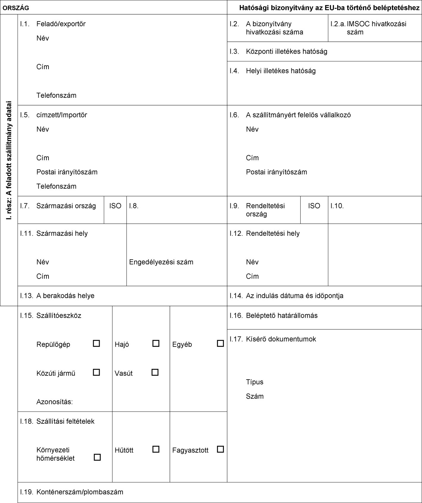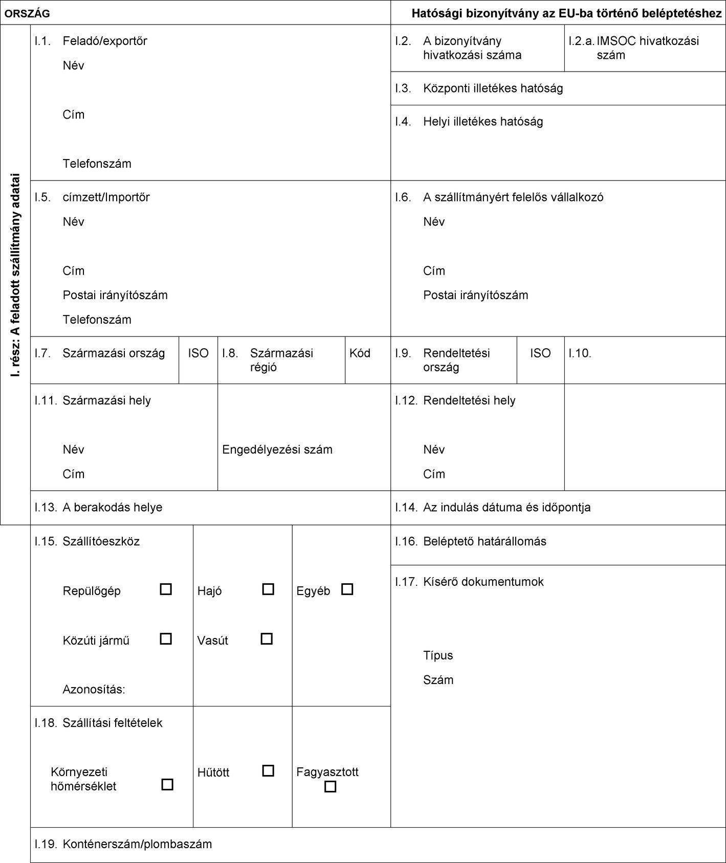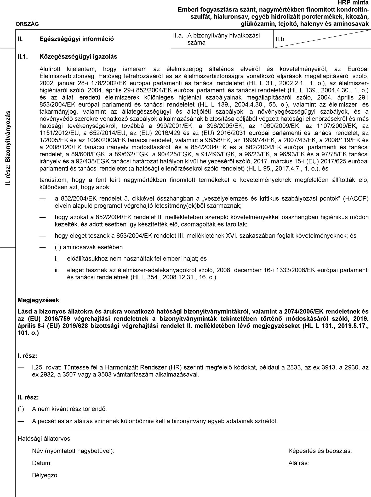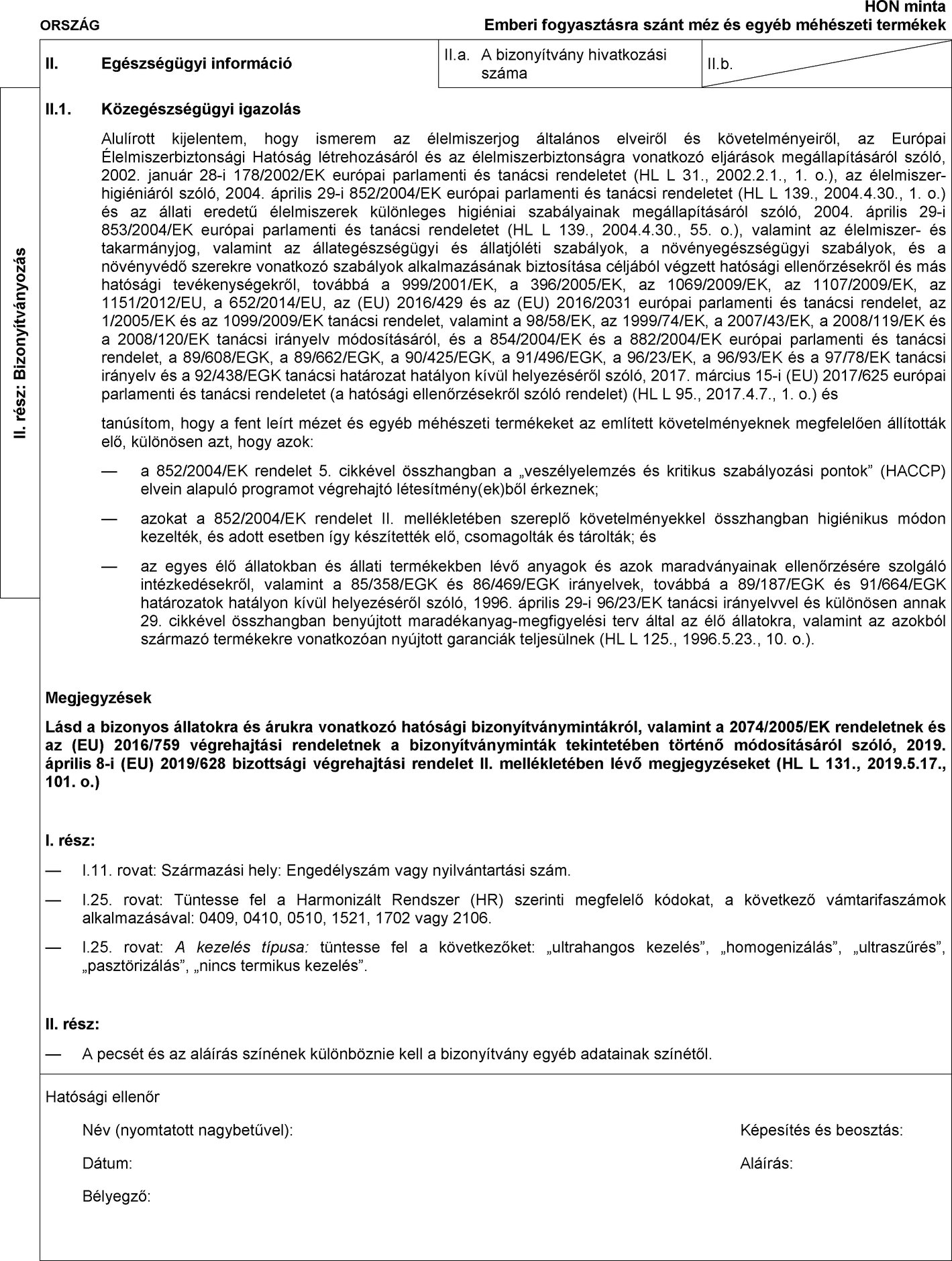 HATÓSÁGI BIZONYÍTVÁNYMINTA AZ EMBERI FOGYASZTÁSRA SZÁNT EGYÉB, AZ (EU) 2019/628 BIZOTTSÁGI VÉGREHAJTÁSI RENDELET 7-25. CIKKE ÁLTAL NEM ÉRINTETT ÁLLATI EREDETŰ TERMÉKEK UNIÓBA TÖRTÉNŐ, FORGALOMBA HOZATAL CÉLJÁBÓL VALÓ BELÉPTETÉSÉHEZ