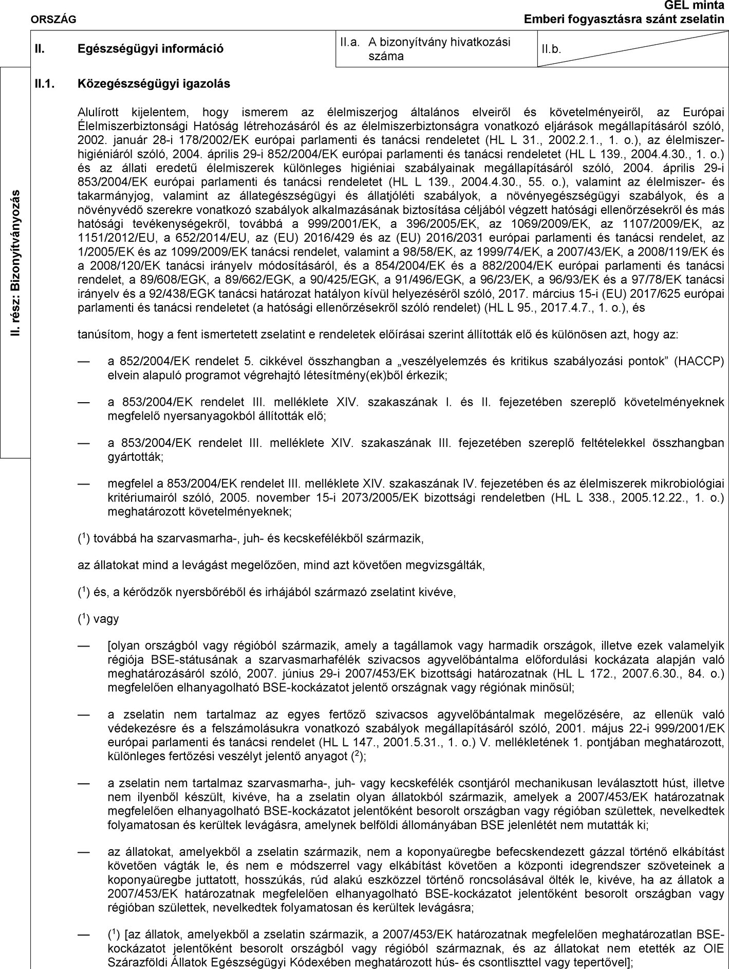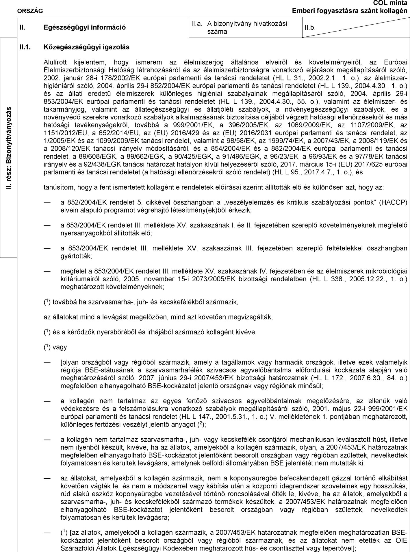 I. rész: ÉLŐ ÁLLATOKRA VONATKOZÓ HATÓSÁGI BIZONYÍTVÁNYMINTA