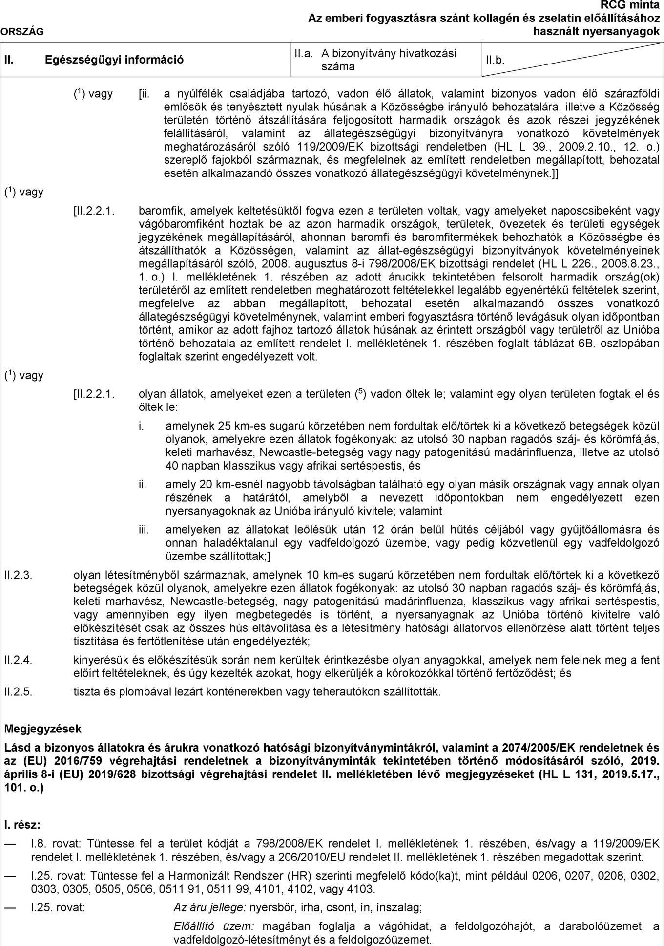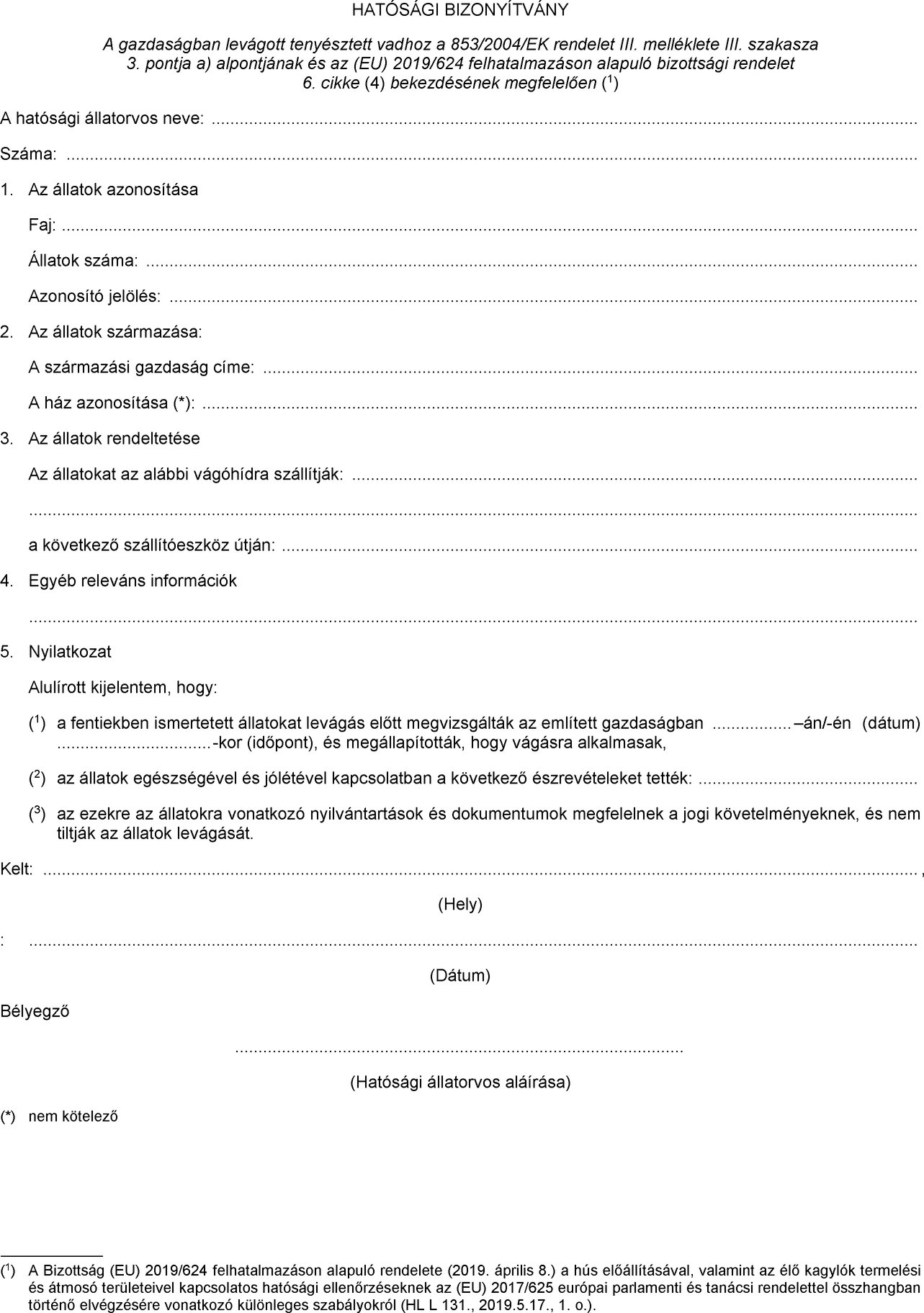 A gazdaságban levágott tenyésztett vadhoz a 853/2004/EK rendelet III. melléklete III. szakasza 3. pontja a) alpontjának és az (EU) 2019/624 felhatalmazáson alapuló bizottsági rendelet 6. cikke (4) bekezdésének megfelelően (1)
