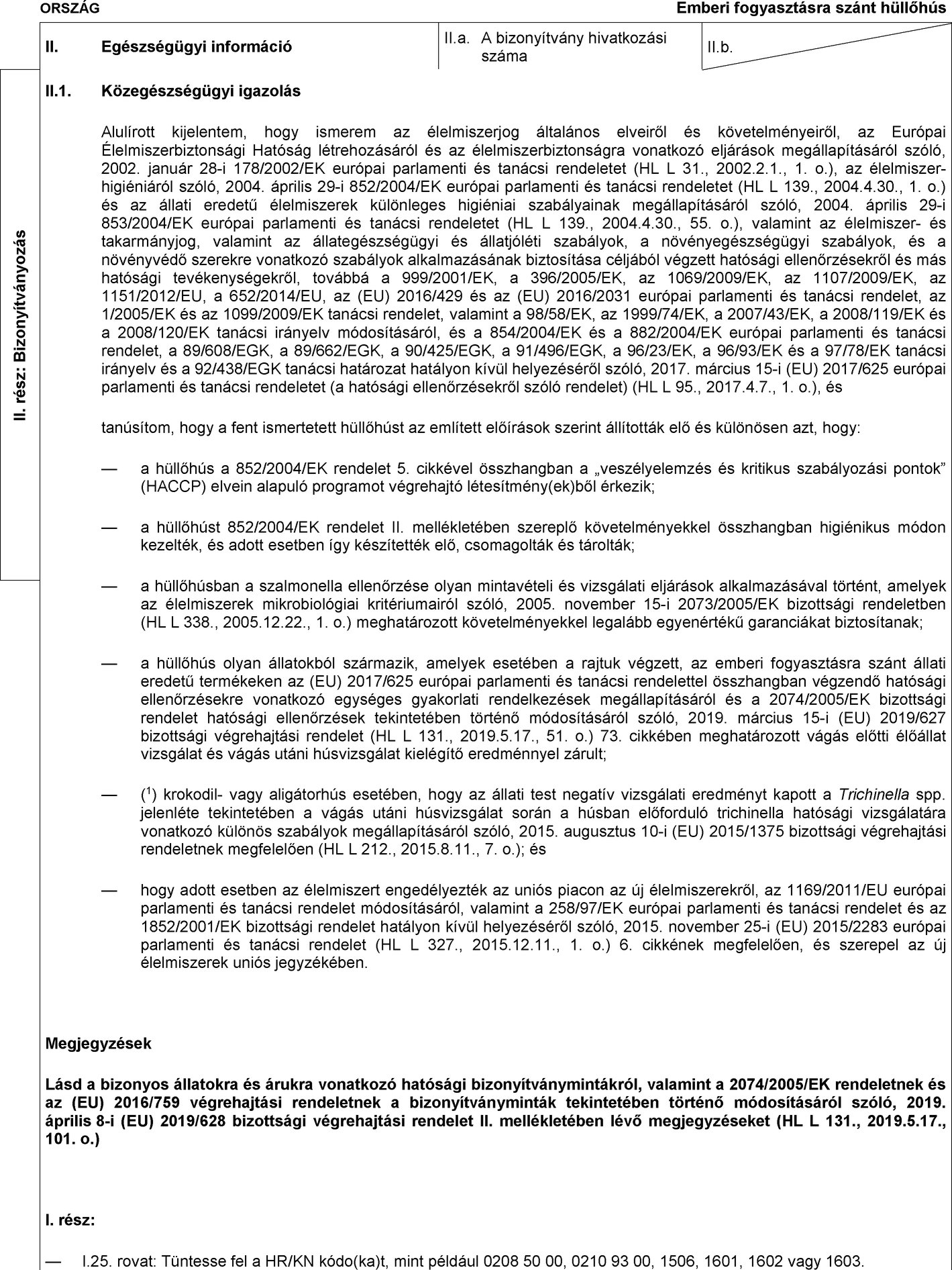 Alulírott hatósági ellenőr kijelentem, hogy ismerem a 852/2004/EK rendelet vonatkozó rendelkezéseit és tanúsítom, hogy: