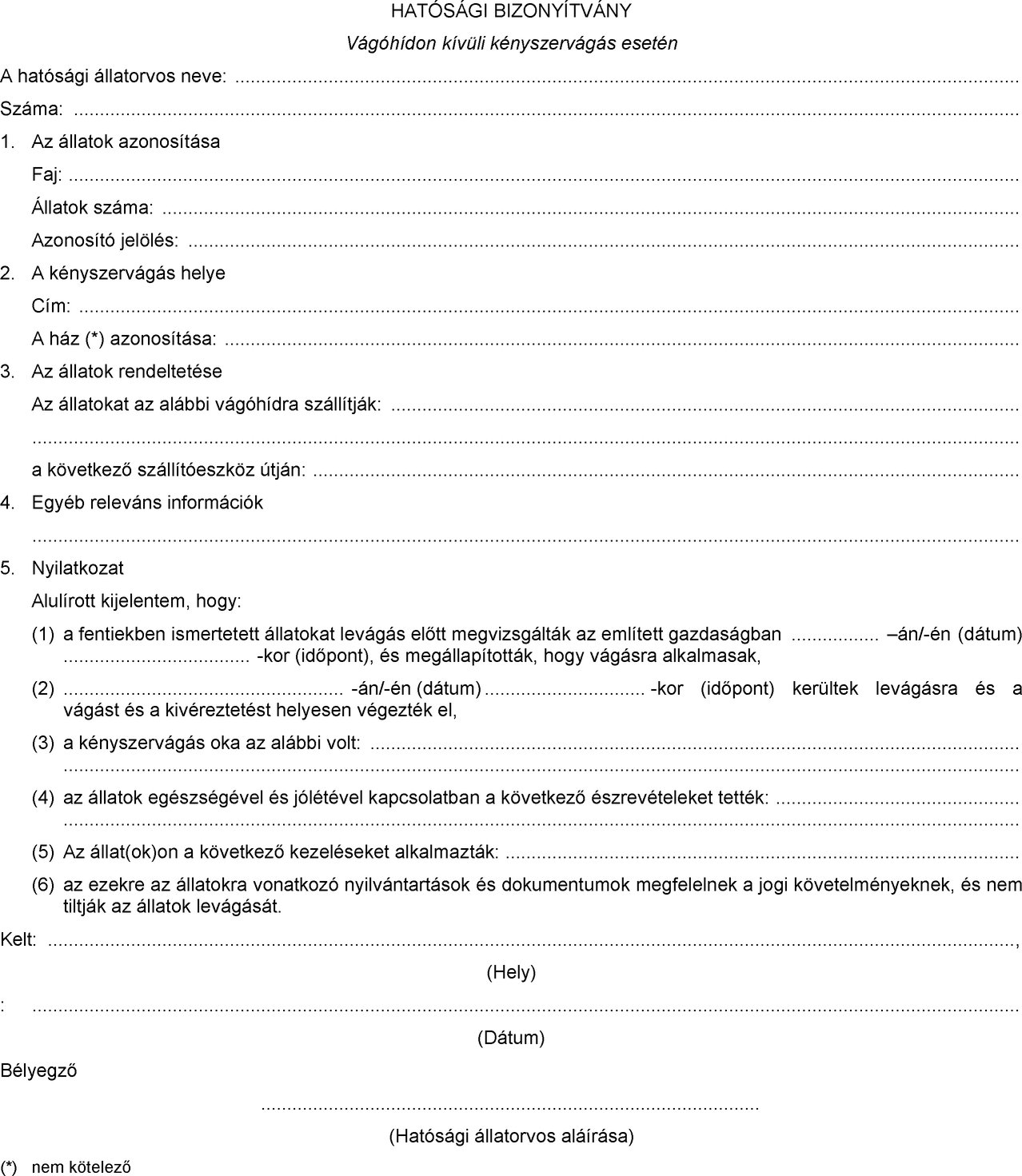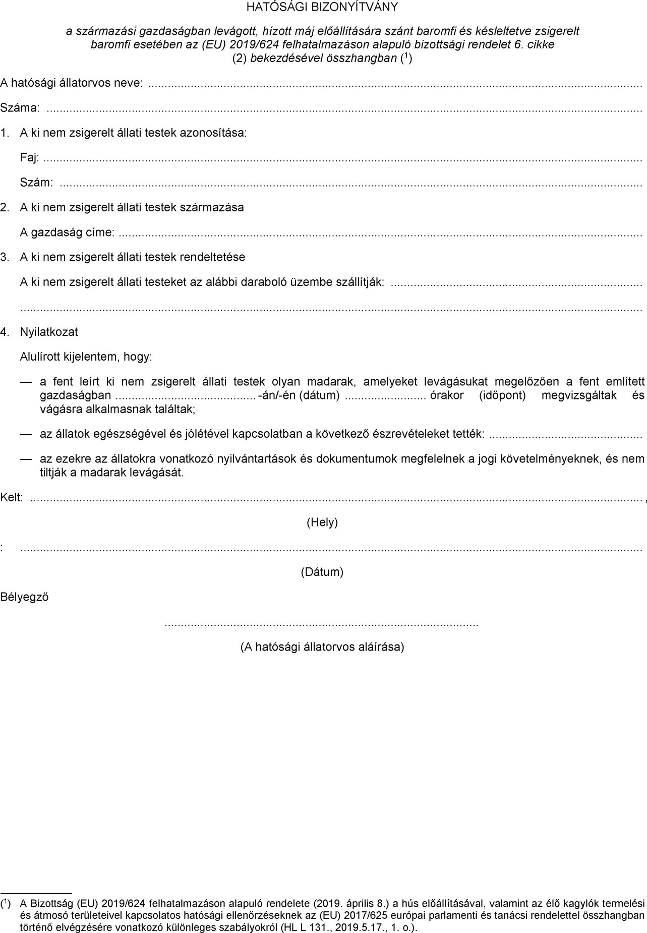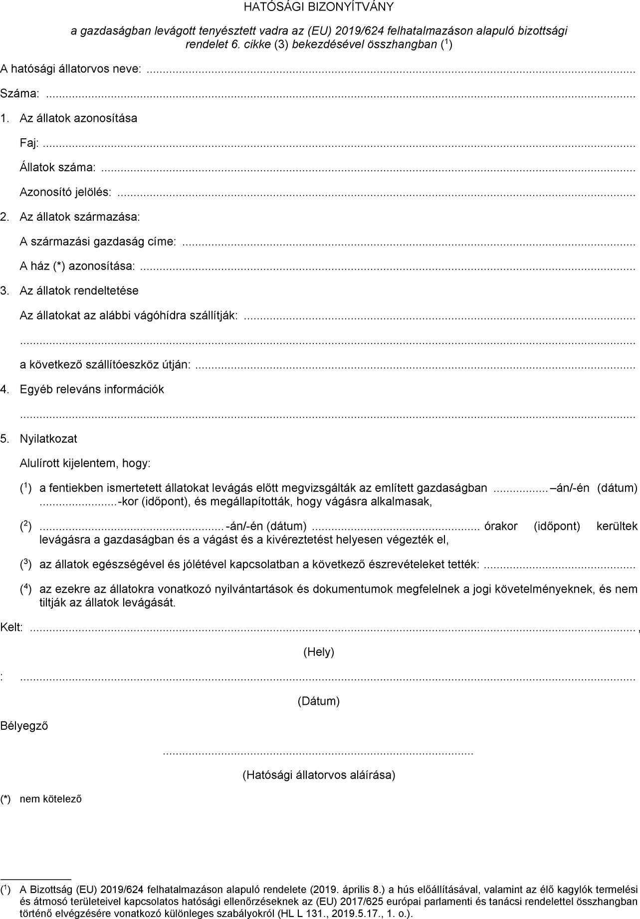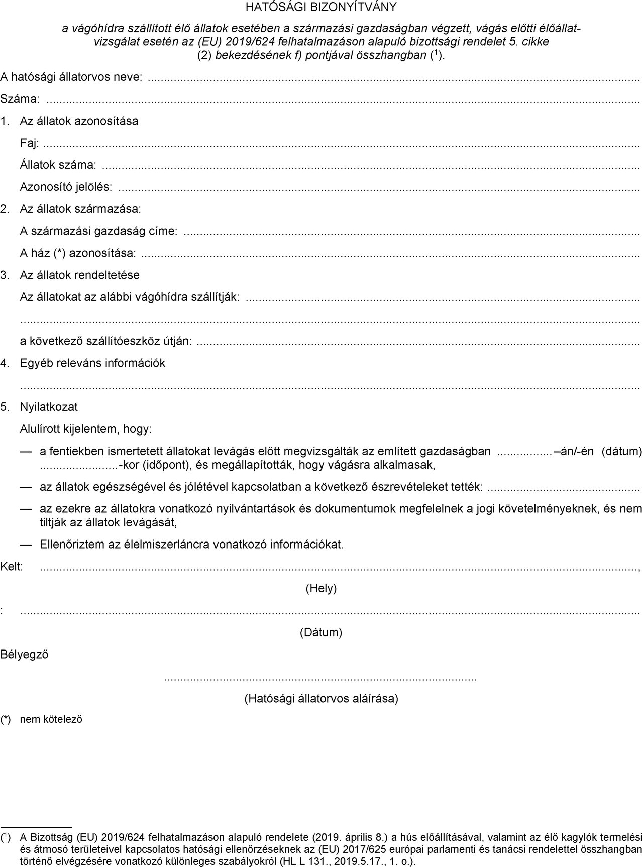 AZ (EU) 2019/624 FELHATALMAZÁSON ALAPULÓ BIZOTTSÁGI RENDELET 4. CIKKÉNEK MEGFELELŐ HATÓSÁGI BIZONYÍTVÁNYMINTA VÁGÓHÍDON KÍVÜLI KÉNYSZERVÁGÁS ESETÉRE (1)