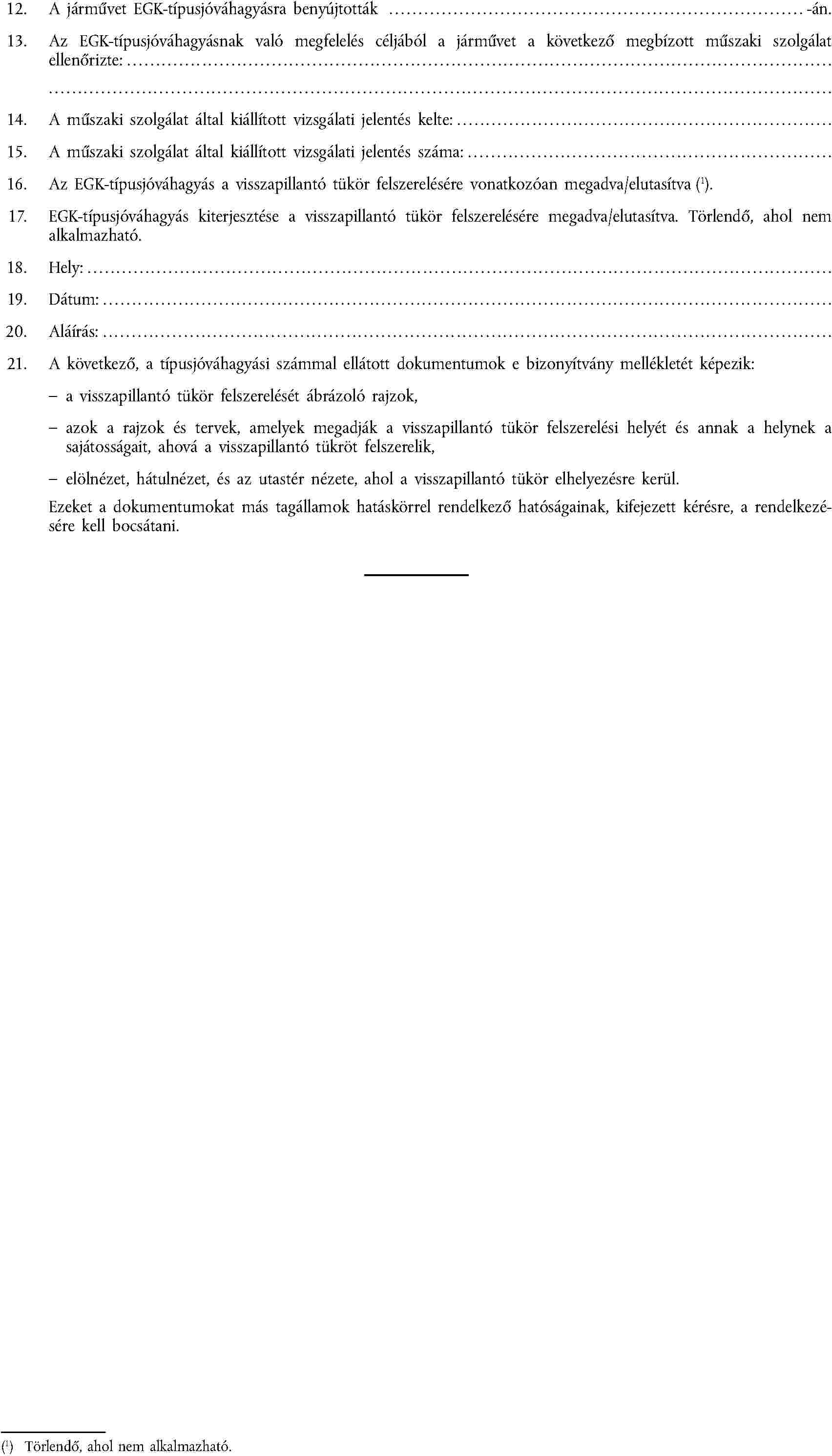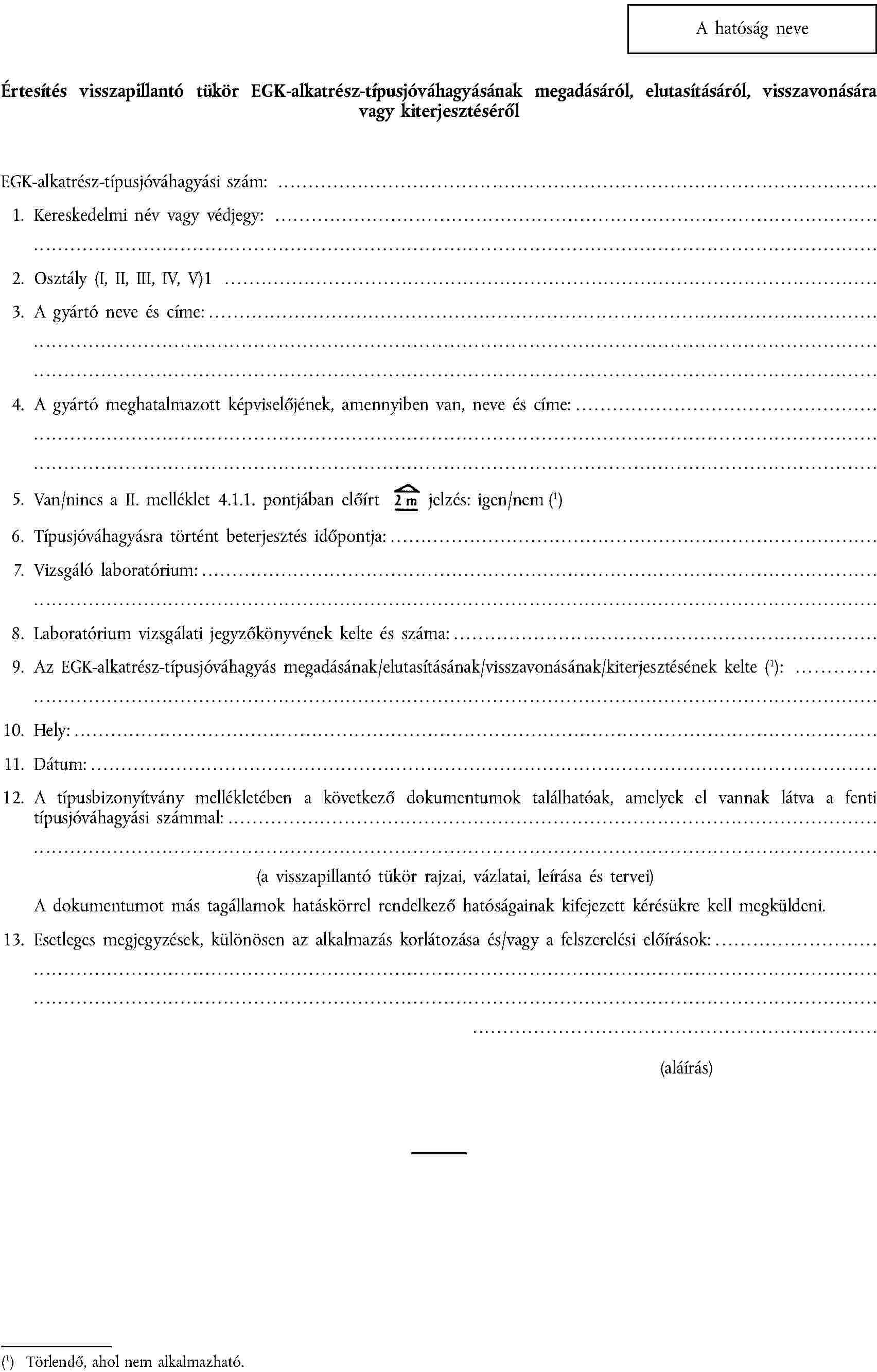 VISSZAPILLANTÓ TÜKÖR EGK-ALKATRÉSZ-TÍPUSBIZONYÍTVÁNY MINTÁJA